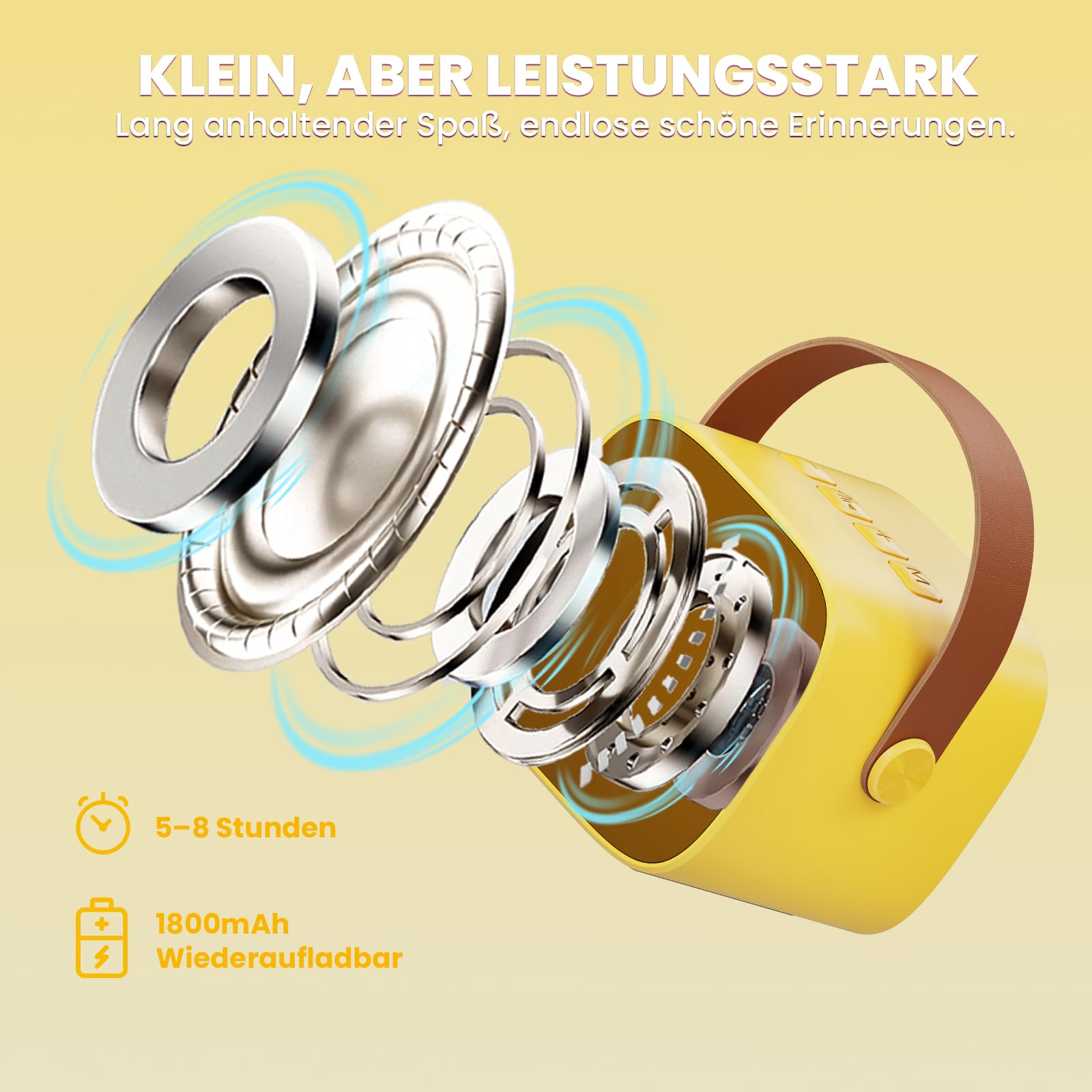 ["Highlights: ☑️ Powerful yet lightweight, in a mini size for ultimate portability. ☑️ Easy connection via Bluetooth and support for a TF card. Compatible with all popular apps (like YouTube, Tiktok). ☑️ Acts as a speaker and player with dancing lights. The colorful LED lights blink in sync with the music rhythm. ☑️ After 10,000 anti-drop tests, the child-friendly design ensures long-lasting durability. ☑️ 100% popular gift.","🎤【Karaoke Machine with 2 Microphones】The Bluetooth karaoke machine music box comes with 2 wireless microphones, automatically connecting to the speaker when turned on, with a range up to 10m, can adjust human voice/echo effect/music volume separately. The speaker supports Bluetooth 5.0, compatible with smartphones, PCs, laptops, and other music apps, providing quick and stable connection. Functions as both a karaoke machine and regular speaking microphone.","🎤【Portable Karaoke Machine】The portable karaoke machine for kids and adults, with dimensions of 2.95 * 3.34 * 2.55 inches, weighing only 455g, easy for kids to carry anywhere. High quality and powerful sound create a wonderful KTV live environment. Dynamic LED lights that liven up the performance, perfect for KTV, parties, gatherings, outdoor activities. Supports a TF memory with MP3 songs, allowing you to sing, practice singing, play music, listen to songs as you like.","💿【4 Modes Kids Karaoke Machine】The children's karaoke machine has 4 kinds of magical voices, easy to use. Cute appearance, fun and interesting for kids. Equipped with a powerful audio driver and advanced digital signal processor that makes the sound clearer and avoids annoying microphone feedback. The LED lights flash to the rhythm of the music, kids will love the dancing lights that go freely with the sound.","🎼【Long Playtime Karaoke Machine】The built-in battery of the karaoke machine can work for 5-10 hours after being fully charged. Enjoy uninterrupted karaoke fun. Perfect for birthdays, Christmas, parties, and other outdoor activities. This kids karaoke machine can be used as a karaoke system, music player, microphone speaker, and more. (You can also use the speaker without the microphone.)","🎁【Perfect Gifts for Kids】This karaoke machine is an essential toy for family entertainment, perfect for party, birthday, and encourages everyone to join in. Its charming LED design and children's favorite color make it a perfect gift for young singers passionate about singing, suitable for ages 3, 4, 5, 6, 7, 8, 9, 10, 11, 12-year-old girls, boys, teens, and toddlers. We offer 1 year warranty and 30-day return policy.","❤️Warm Reminder: To adjust the echo, double-click the microphone button (with the microphone symbol) to switch to echo mode, then press the + - button to freely adjust the echo volume. (Note: Microphone heads too close to the speaker create sharp and strange sounds, which is common sound feedback, so try to avoid microphone heads being too close to the speaker)."]
