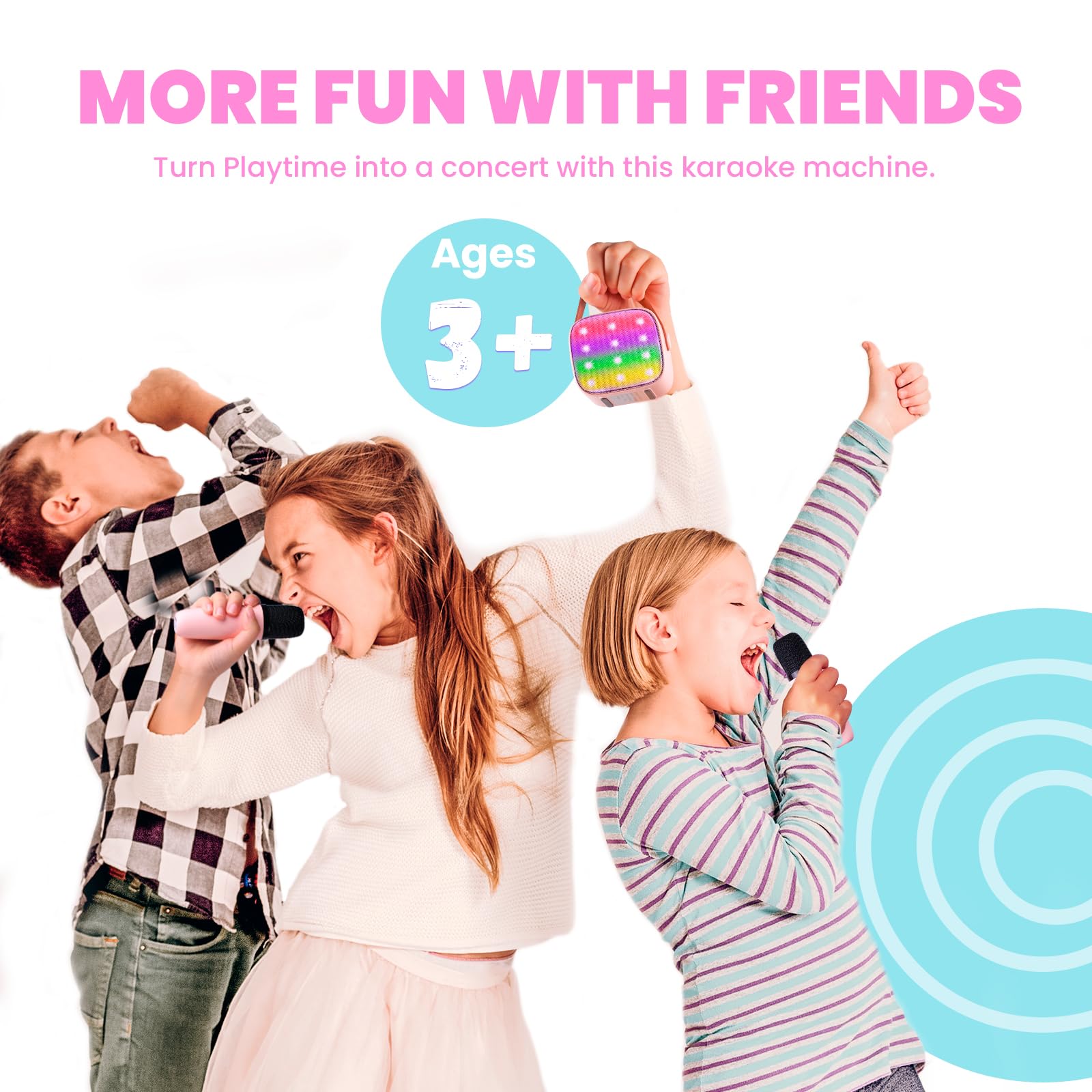 ["🎁【Perfect Gifts for Kids】This karaoke machine is an essential toy for family entertainment, perfect for parties, birthdays, and encourages everyone to join in. Its charming LED design and children's favorite color make it a perfect gift for young singers who are passionate about singing, suitable for ages 3, 4, 5, 6, 7, 8, 9, 10, 11, 12 years old girls, boys, teenagers, and toddlers. We offer 1 year warranty and 30 days return policy.","🔋【Long Playtime Karaoke Kids Toy】The built-in battery of the karaoke machine can work for 5-10 hours after being fully charged. Let you enjoy karaoke fun without interruption. Perfect for birthdays, Christmas, parties, and other outdoor activities. This karaoke machine can be used as a karaoke system, music player, microphone speaker, and more. (You can also use the speaker without the microphone.)","💿【4 Modes Mini Karaoke Machine】The mini karaoke machine has 4 types of magical voices, cute appearance, easy to use, fun and interesting for children. Karaoke machine is equipped with a powerful audio driver and an advanced digital signal processor that makes the sound clearer and avoids annoying microphone feedback. The LED lights dance to the rhythm of the music, kids will love the dancing lights that go freely with the sound.","🎤【Bluetooth Karaoke Machine with Microphone】The Bluetooth karaoke machine comes with a microphone, can adjust the human voice/echo effect/music volume separately. It supports Bluetooth 5.0 compatible with Android IOS smartphones, PC, laptops, and other music apps, the connection is fast and stable. The wireless microphone automatically connects to the speaker when turned on, with a range of up to 32 feet. Supports a TF memory with MP3 songs.","🎶【Portable Karaoke Speaker】The portable karaoke speakers with a lightweight size of 2.95*3.34*2.55inch, weighing only 455g, easy for kids to carry anywhere. And with high-quality powerful sound, you and your kids can enjoy a wonderful KTV live sound environment. And dynamic LED lights that liven up the playback, ideal for KTV/party/meetings/outdoor activities. Singing, practicing singing, playing music, listening to songs whenever you want."]