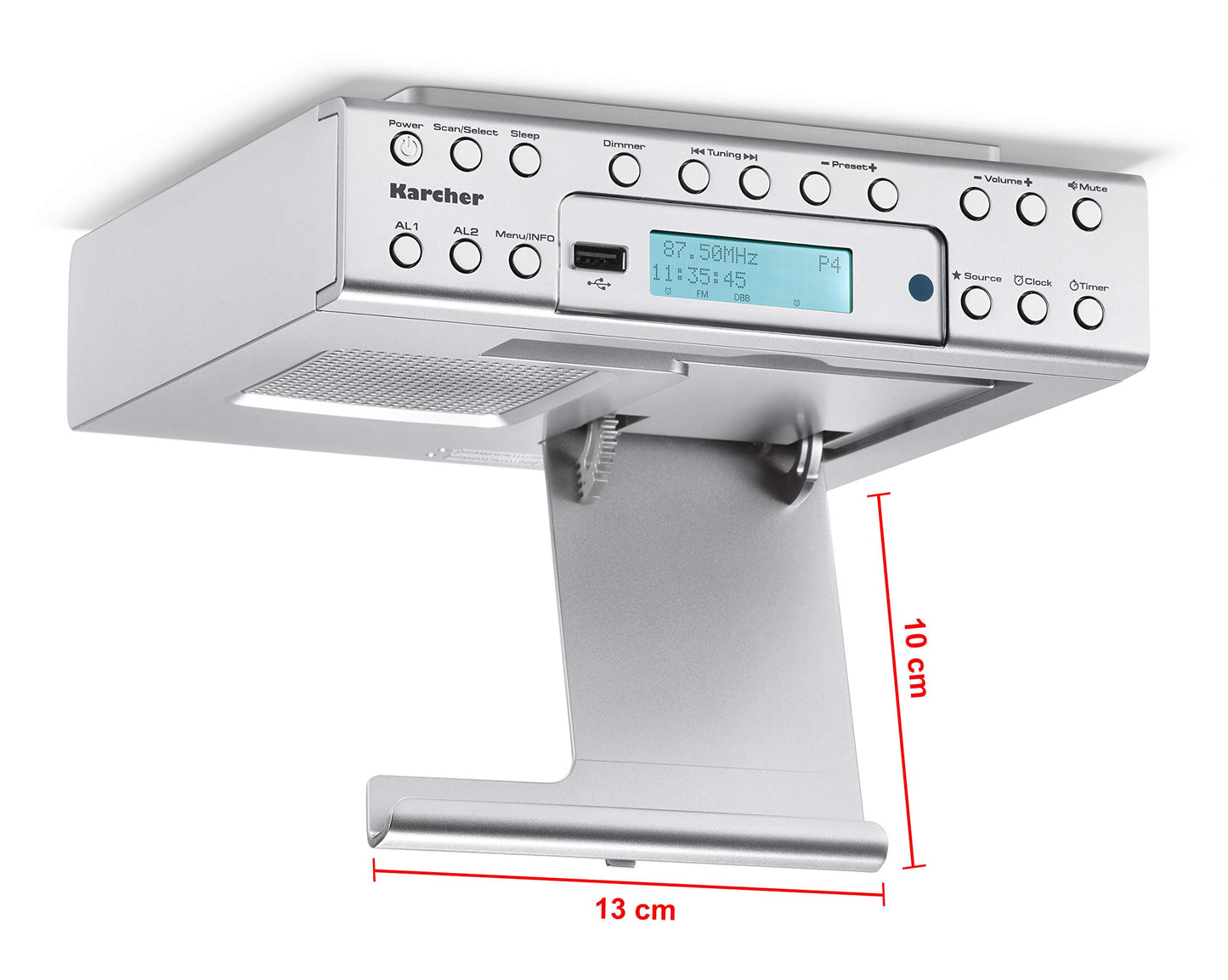 Karcher RA 2030D Under Cabinet Radio with DAB+ / FM Radio (20 presets each) and MP3 playback - Alarm clock (Dual Alarm) / Countdown Timer - Smartphone holder & USB charger - Remote control