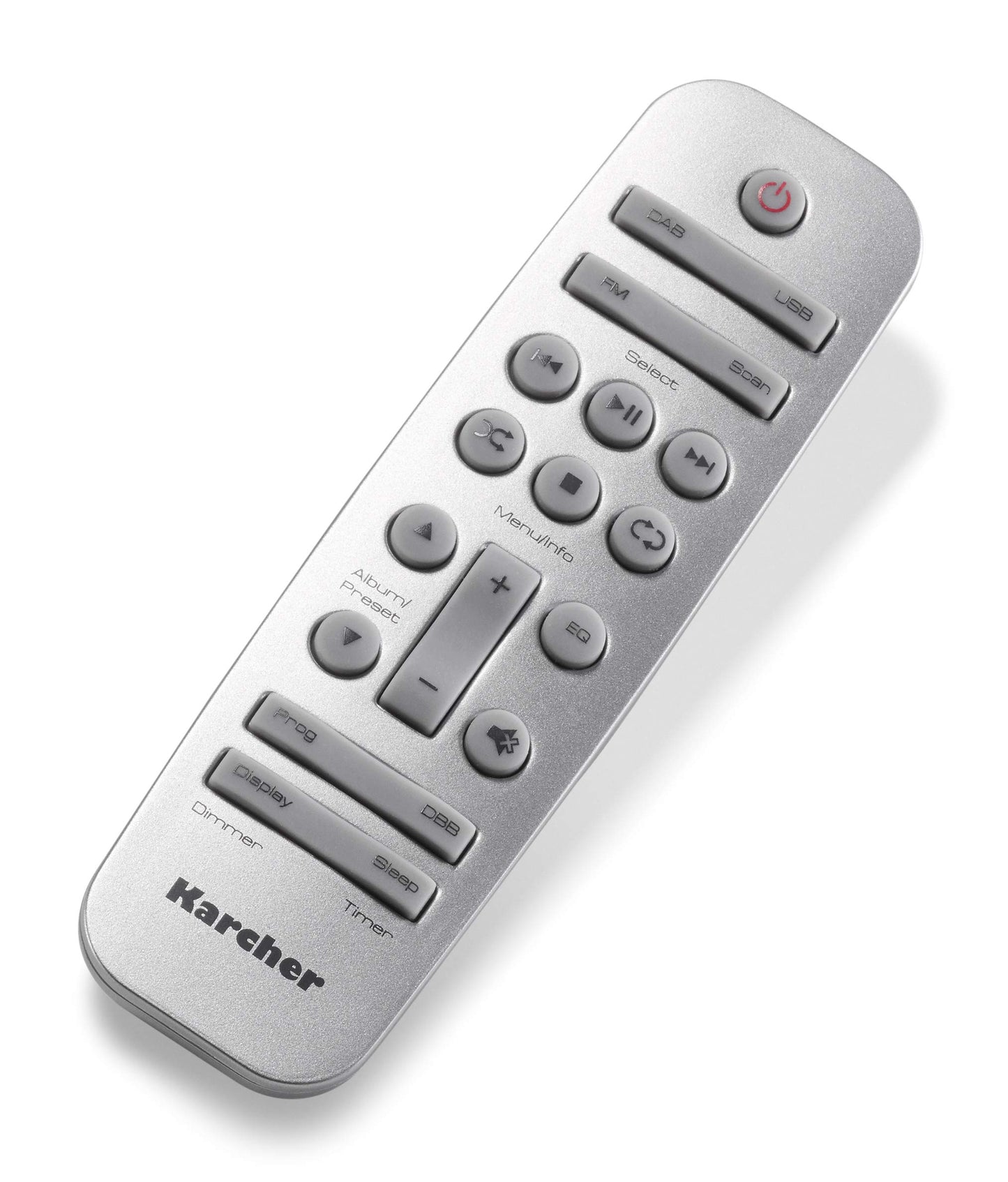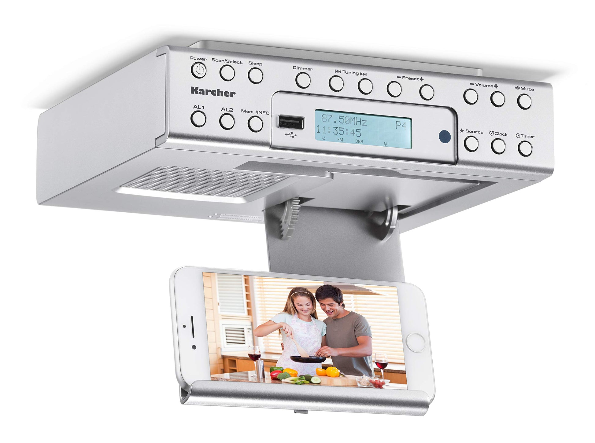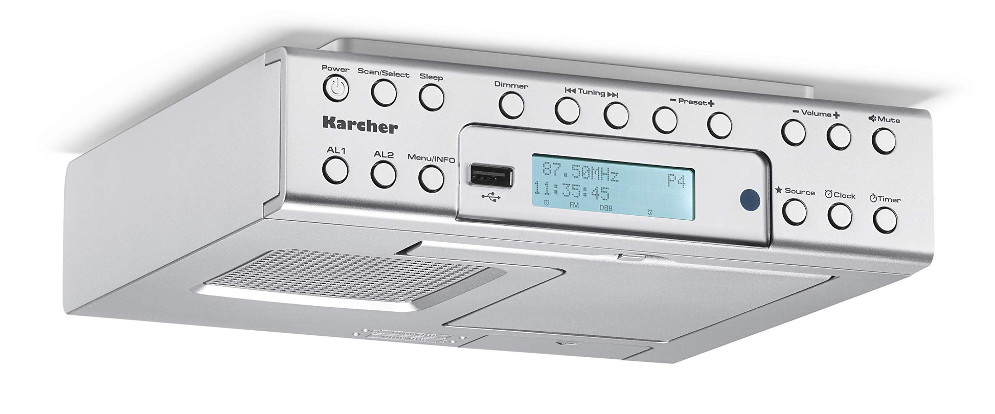 ["Under-cabinet kitchen radio with DAB+ / FM radio with RDS and 20 station presets - Output power: 2 watts (RMS)","Foldable shelf for smartphones - USB port with charging function (USB charger) and for playing MP3 files","Alarm clock with dual alarm for 2 individual wake-up times including weekend function, snooze & sleep timer - Countdown timer as a practical cooking/baking aid","Backlit LCD display dimmable in 3 levels - Audio equalizer (Normal, Pop, Jazz, Rock, Classic) - Mains operation and battery backup function (batteries not included)","Scope of delivery: Karcher under cabinet radio RA 2030D, remote control, mounting materials and user manual (DE/EN)"]