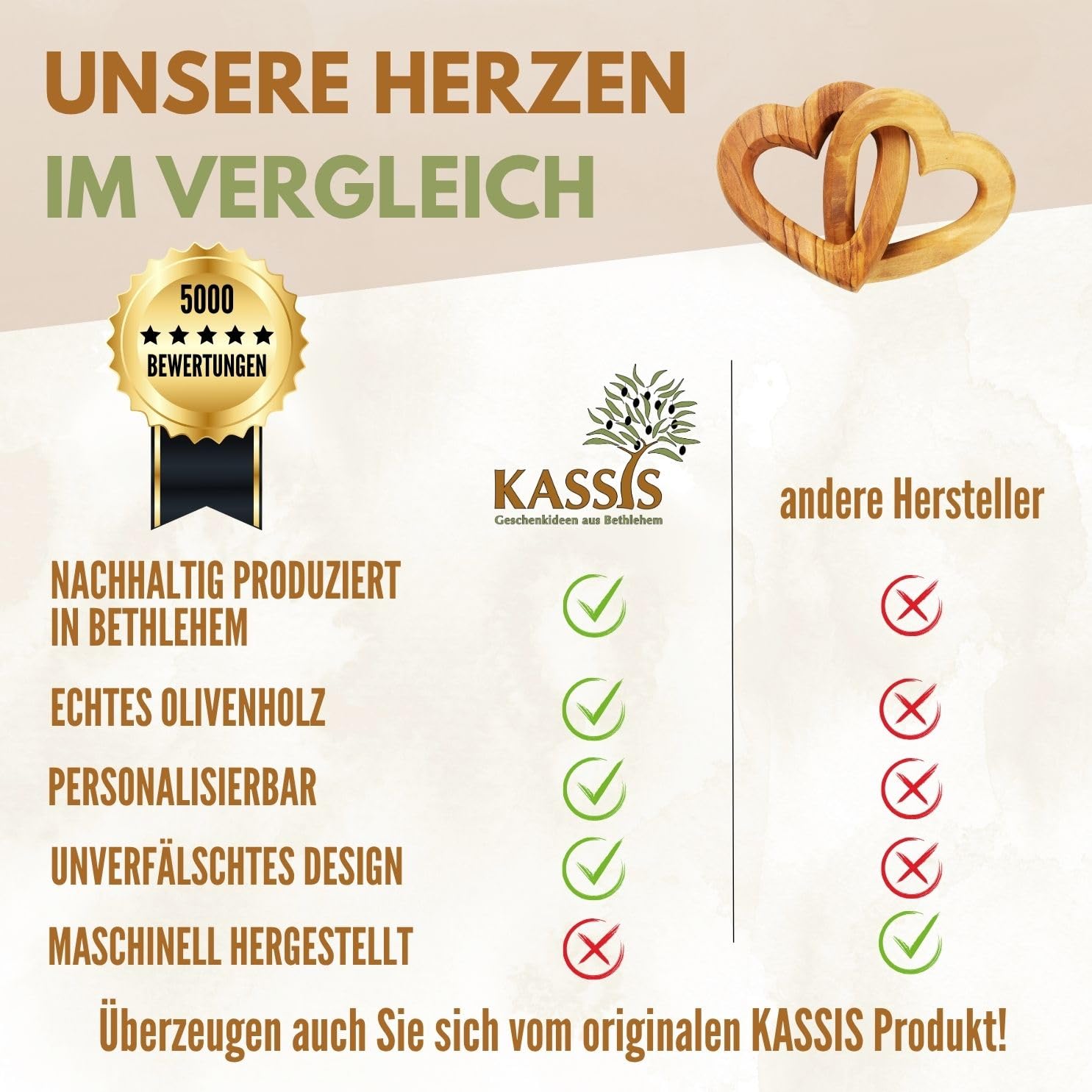 ["✅ UNIQUE AND PERSONAL GIFT IDEA: These interconnected hearts are a beautiful gift for couples, weddings, silver anniversaries, Valentine's Day, anniversaries, birthdays, and more.","✅ HIGH-QUALITY CRAFTSMANSHIP: The wooden hearts are made of high-quality olive wood, carefully crafted to ensure a smooth and elegant surface. It is very durable and sturdy.","✅ VARIOUS SIZES: The KASSIS olive wood hearts are available in different sizes, so you can find the perfect gift for the couple or your loved ones.","✅ PERSONALIZED KEEPSAKE: The interconnected decorative hearts made of olive wood are a unique gift that will remain a lasting memento of a special day in the couple's or your loved one's life.","✅ ECO-FRIENDLY AND SUSTAINABLE: Olive wood is a natural material that is sustainable and eco-friendly. The interconnected wedding hearts are not only a beautiful gift, but also an environmentally friendly product."]