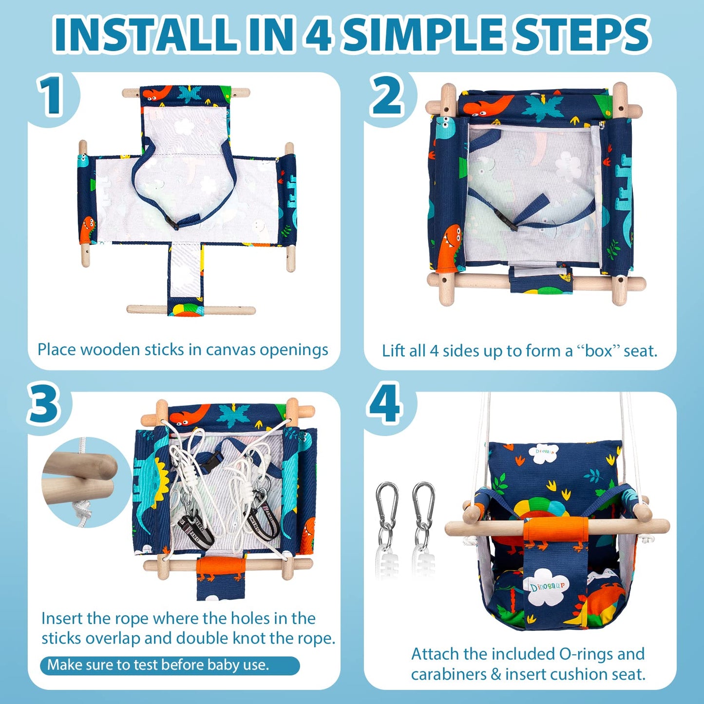 ["1: Pillowcase and swing fabric are made of 100% cotton and perfectly adapt to the shape of the child from 12 months onwards.", "2: The swing comes already assembled with adjustable ropes and screw carabiners, allowing for quick and effortless setup and takedown.", "3: The dinosaur-patterned baby swing in a modern design is suitable for both indoor and outdoor use.", "4: It is made of high-quality and sturdy beech wood and can carry up to 50 kg.", "5: Safe baby swing The ideal birthday gift for little swing fans!"]