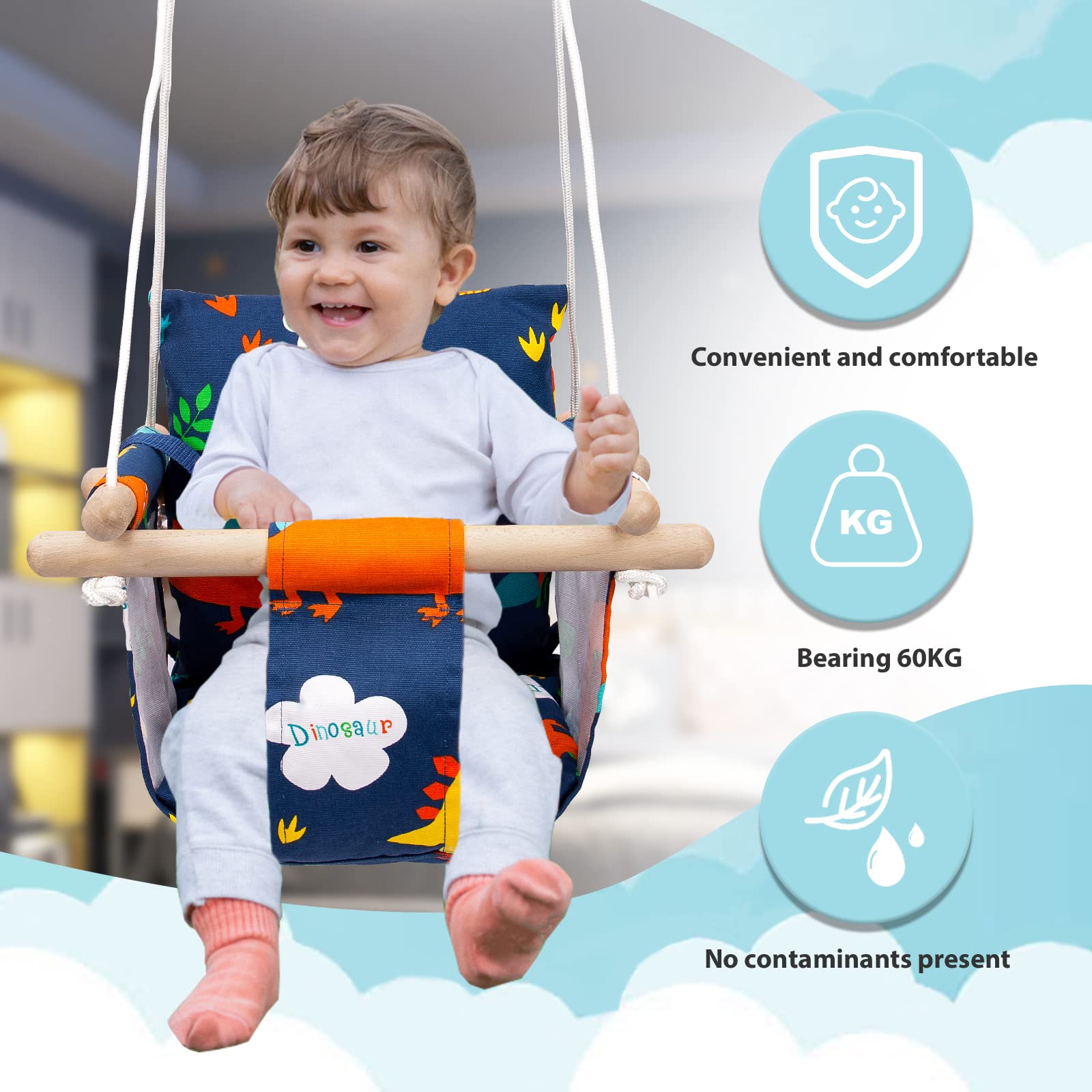 Katomi swing for baby kids with safety belt stainless steel carabiner soft cushion up to 50kg permissible length adjustable CE environmental fabric dinosaur pattern for garden indoor outdoor