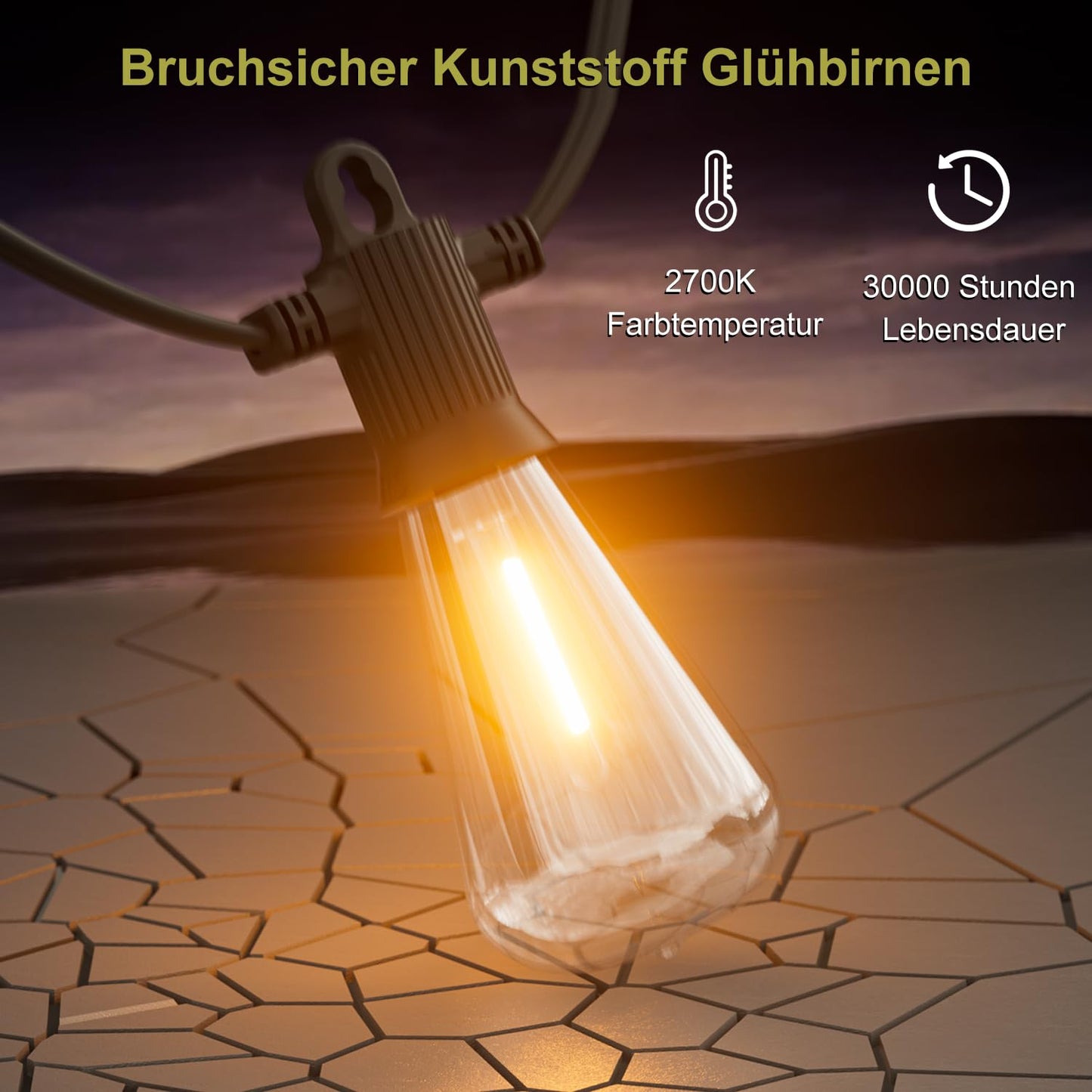 Kawaya outdoor string lights, 30m string lights LED with 50+2 ST38 bulbs, waterproof IP65 garden decoration string lights for patio, trees, wedding, party, festival, 2700K warm white.