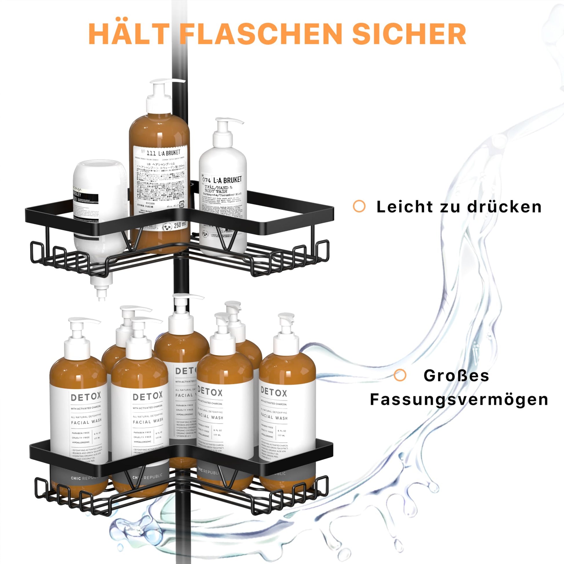 ADJUSTABLE TELESCOPIC SHOWER SHELF: The shower shelf comes with 8 corner tension poles that can be used at any height from 60-293 CM, suitable for different ceiling heights and shower spaces (Note: This shower caddy is not suitable for slanted ceilings).
