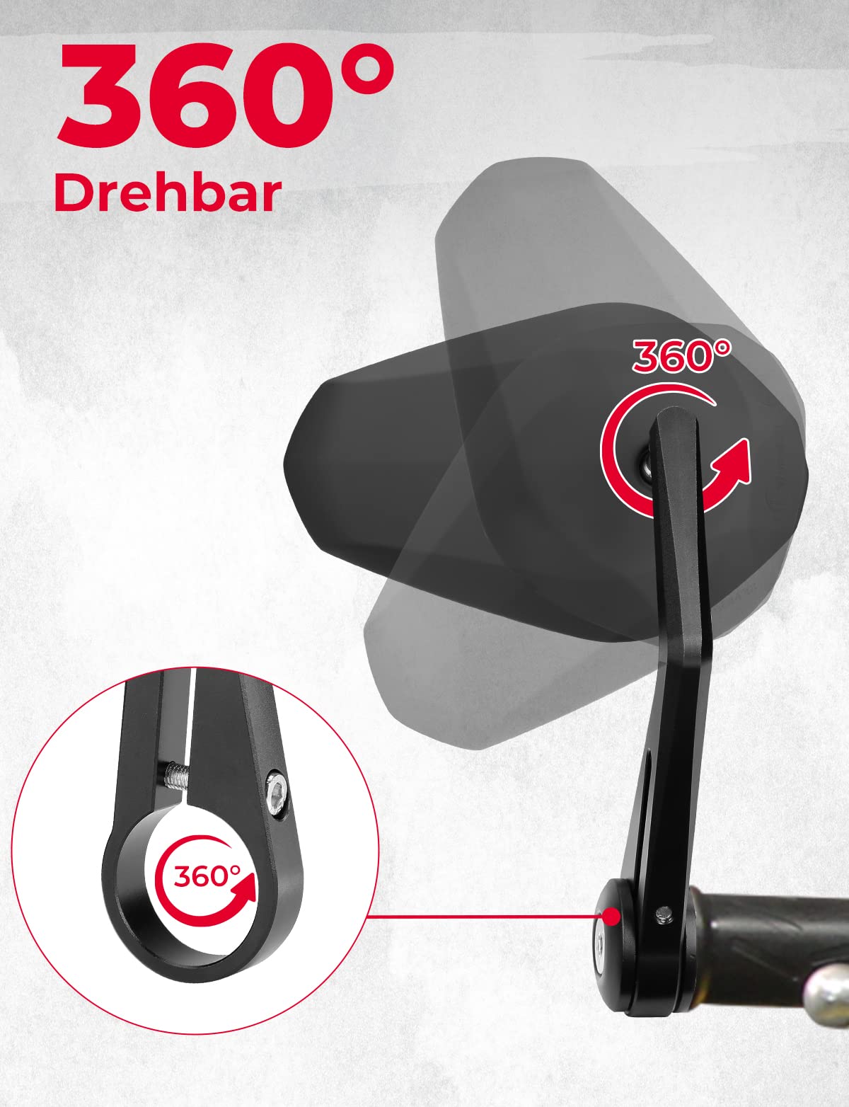 "360-degree rotation: Motorcycle handlebar end mirrors with a fully 360-degree rotatable base that can be adjusted in any direction, allowing you to see in every direction of the rear.