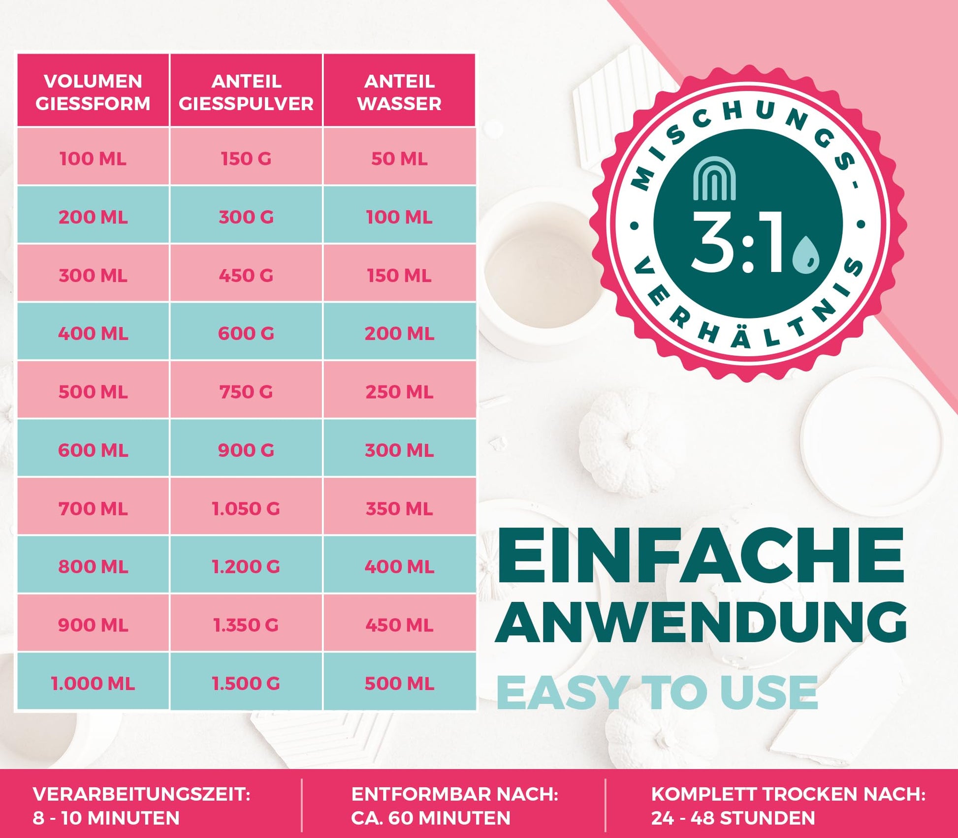 "Easy processing - Easy processing in a mixing ratio of 3:1. The finished casting object can be taken out of the plaster molds for casting after about 45 minutes.",