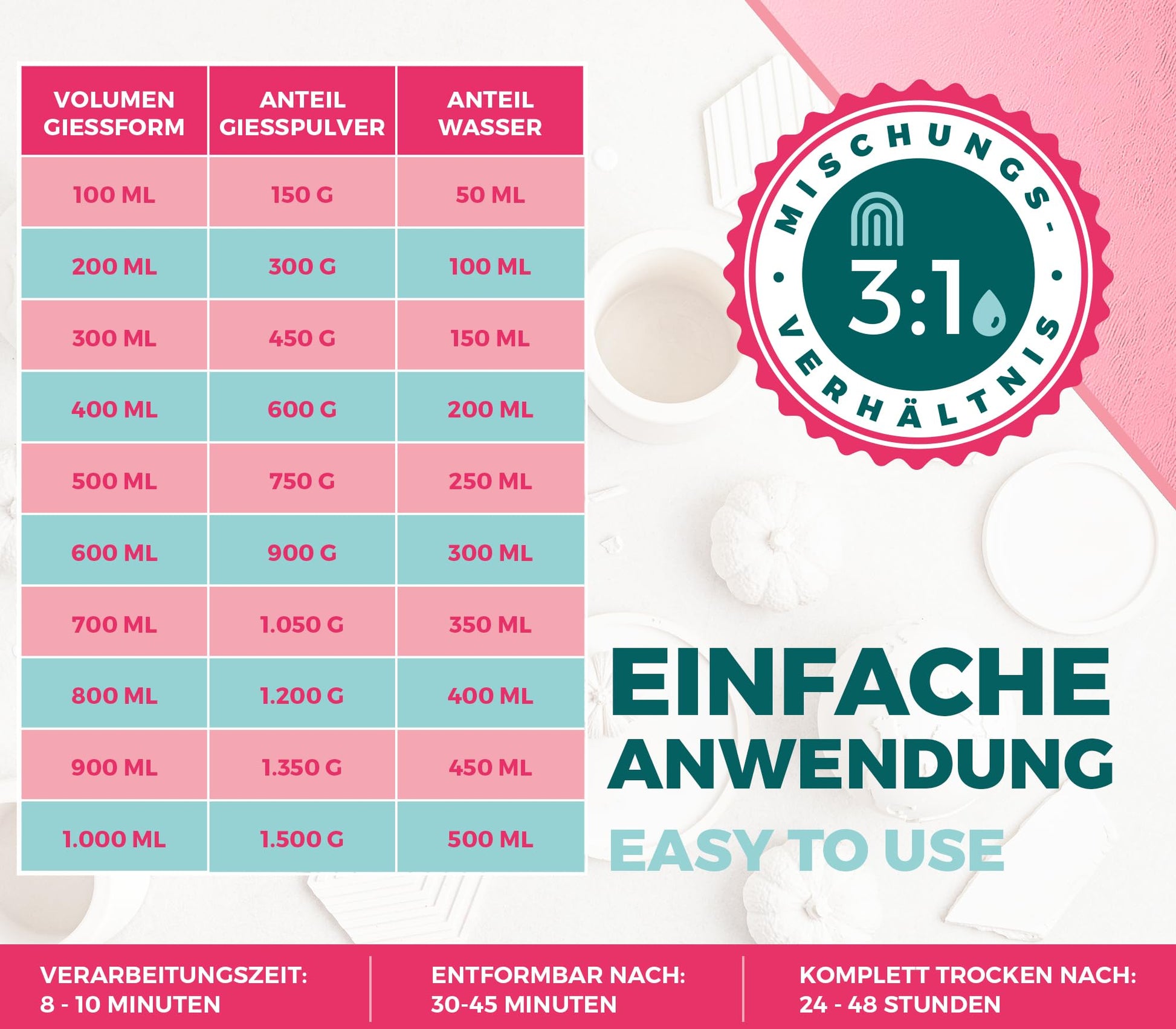Easy processing - Easy processing in a mixing ratio of 3:1. The finished casting object can be removed from the plaster molds for casting after about 45 minutes.