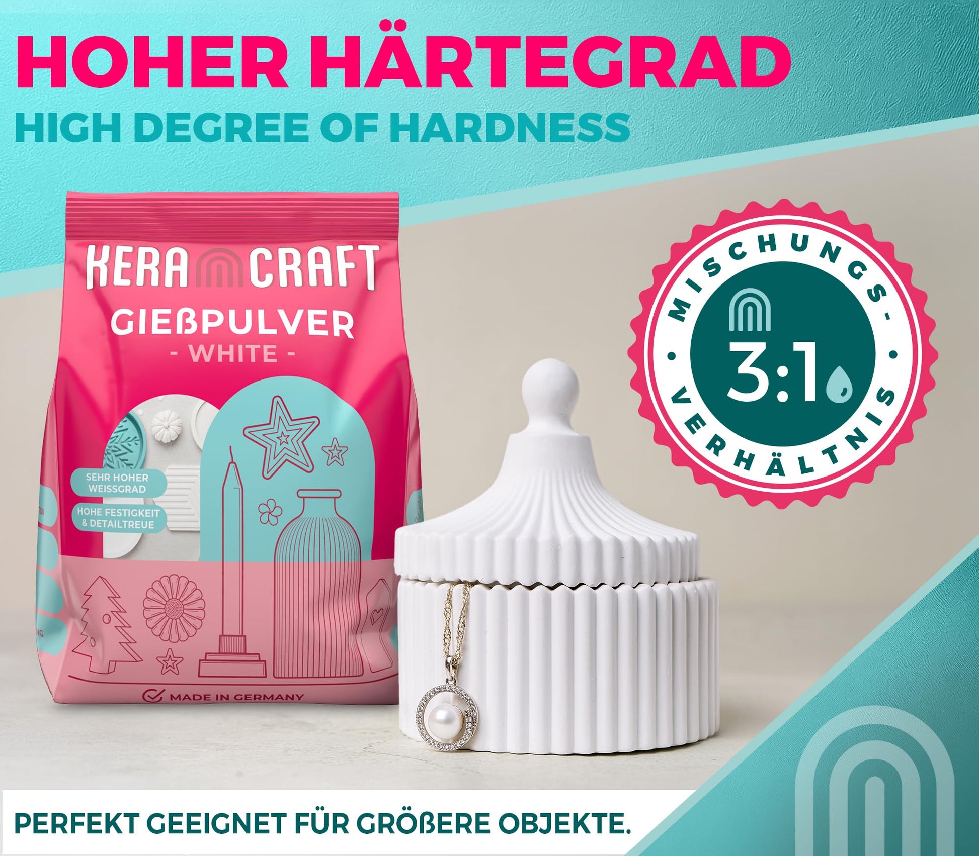 ["High whiteness - For our casting compound we exclusively use highest quality natural raw materials, which allow for a very high whiteness, high accuracy in shaping, and a smooth surface.","High stability - The relief casting powder from Keracraft achieves a high strength of 200N/mm. The product is suitable for larger objects such as decorative plates and vases.","No air bubbles - Thanks to our special ceramic powder formula, air bubbles burst extremely quickly. Keracraft avoids formaldehyde, is non-toxic and ecologically safe.","Easy processing - Easy processing at a mixing ratio of 3:1. The finished casting object can be removed from the plaster molds for casting after about 60 minutes.","Special casting formula - Due to the specially adjusted casting formula, the casting powder is extremely suitable for delicate shapes. Thanks to its good flow properties, no grinding is necessary in the end."]