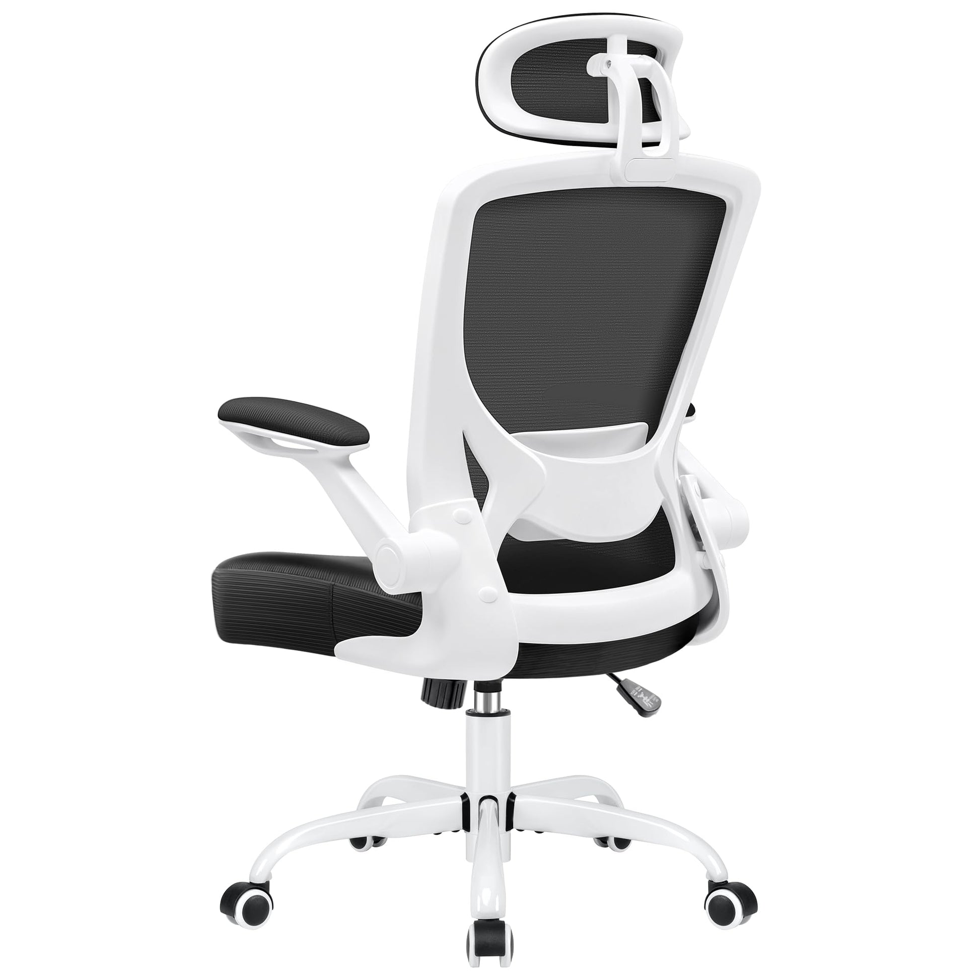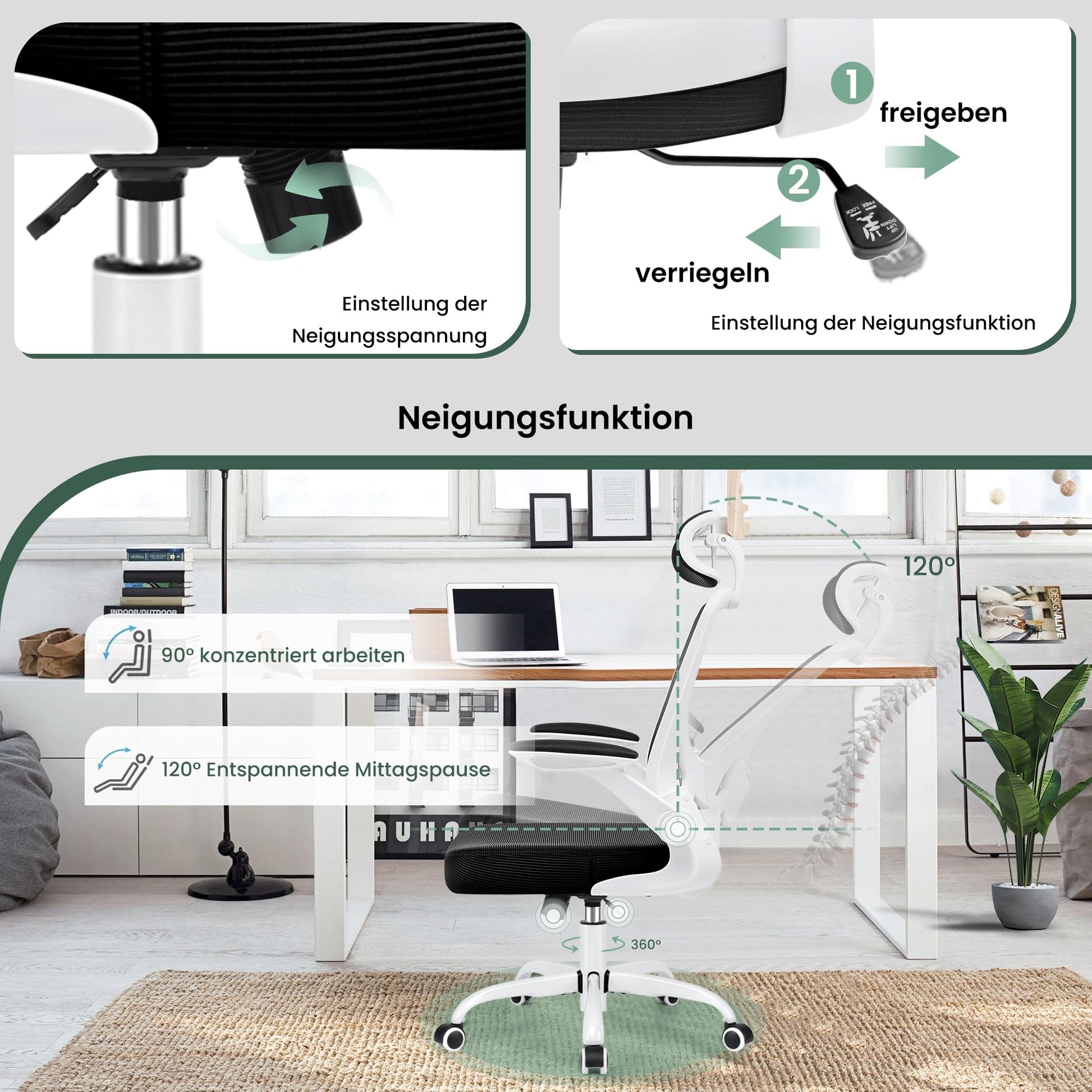 ["Comfortable Ergonomic Office Chair The ergonomic office chair is made of highly elastic fabric, which provides a comfortable and breathable sitting position. Equipped with 15° foldable armrests, a 7 cm adjustable lumbar support, and a 30° rocking function, you can enjoy this comfortable mesh chair while working, studying and resting. High-Quality Materials The seat cushion of the ergonomic office chair is made of high-quality sponge. It is moderately soft and hard, providing a comfortable seating experience. The backrest and headrest are made of high-quality, breathable polyester mesh, keeping you cool and comfortable. Office Chair with Foldable Armrests The KERDOM office chairs are 360° swivel and the 90° adjustable armrests can save you space. The backrest angle is 90°-120°. You can adjust your own viewing angle to play games, watch videos, work, and take a nap. (Desk chair MAX capacity: 150KG Safe and Reliable Three-stage steel gas spring and high-load nylon legs with a capacity of 150 kg are BIFMA and SGS certified. The thickened, explosion-proof steel frame is durable. All these details make this office chair durable. The quiet, PU-coated casters can rotate smoothly and are suitable for almost all floors. Assembly and Service This office chair is easy to install, with integrated instructions requiring tools such as hex key (included) and all accessories. We offer a 1-year product warranty. So you can buy it and use it with confidence. If you have any questions about the office chair before and after purchase, you can contact us at any time. We will do our best to solve the problem."]