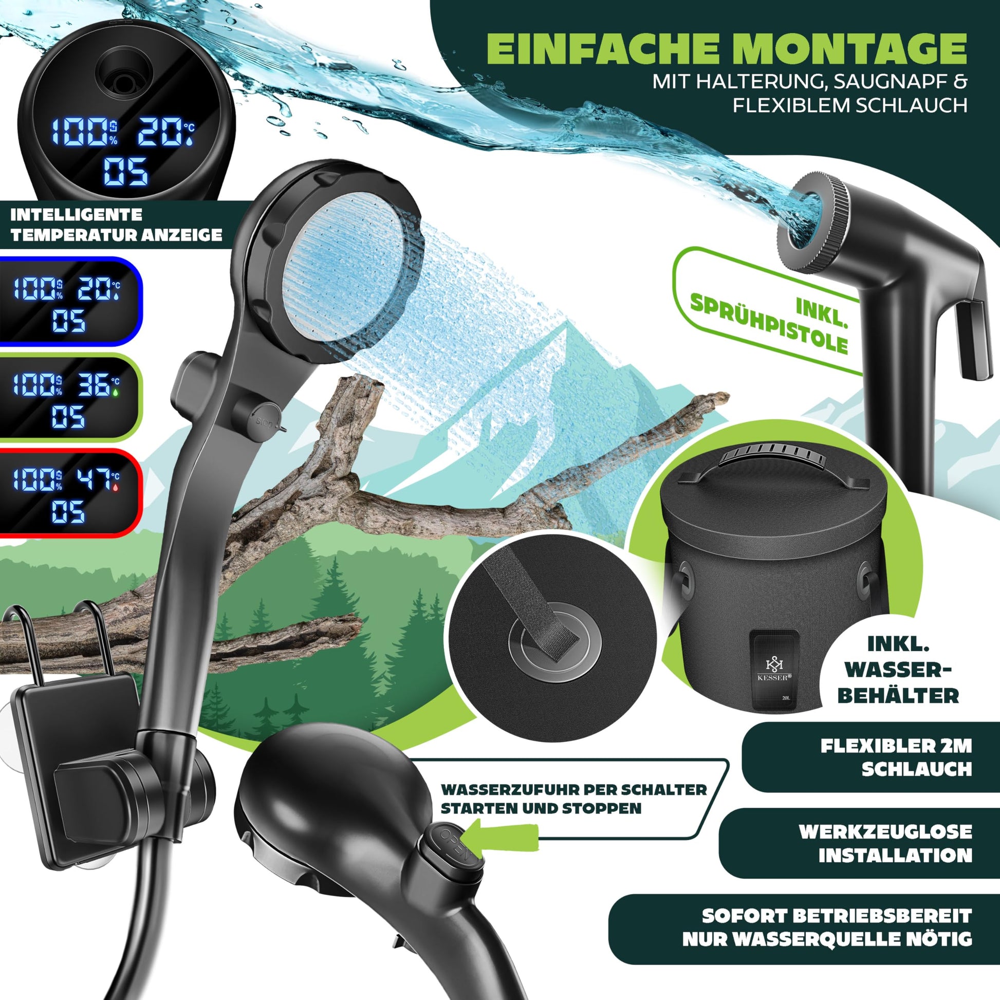 ["INTELLIGENT CAMPINGDUSCHE: The KESSER X-Gear camping shower offers smart features like a smart display for temperature and battery level. The powerful 8000mAh LFP lithium battery provides up to 180 minutes of runtime. With IPX8 water protection, the battery is waterproof and safe. Perfect for outdoor adventures, travel, and spontaneous outings.", "INCLUSIVE 20L WATER TANK: Depending on the selection, the camping shower comes with a 20L water tank that provides ample water supply for longer showers. The flexible 2m hose and spray gun enable easy handling. Ideal for camping, gardening, and car washing.", "EASY MOUNTING: The tool-free installation of the KESSER X-Gear camping shower is quick and uncomplicated. With bracket, suction cup, and flexible hose, the shower is ready for use immediately. The water supply can be easily started and stopped via switch. Perfect for mobile use.", "HIGH WATERPROOFNESS: The IPX8 water protection prevents water ingress and ensures safe use. The waterproof USB port and secure filter insert provide additional safety and durability. The sturdy construction makes the shower ideal for use in various environments.", "ENERGY EFFICIENT: The powerful 8000mAh LFP lithium battery offers a runtime of up to 180 minutes and is fully charged in 2-3 hours. The 10-level water pressure regulation saves water and energy. The environmentally friendly technology makes the KESSER X-Gear camping shower a sustainable choice for outdoor enthusiasts."]