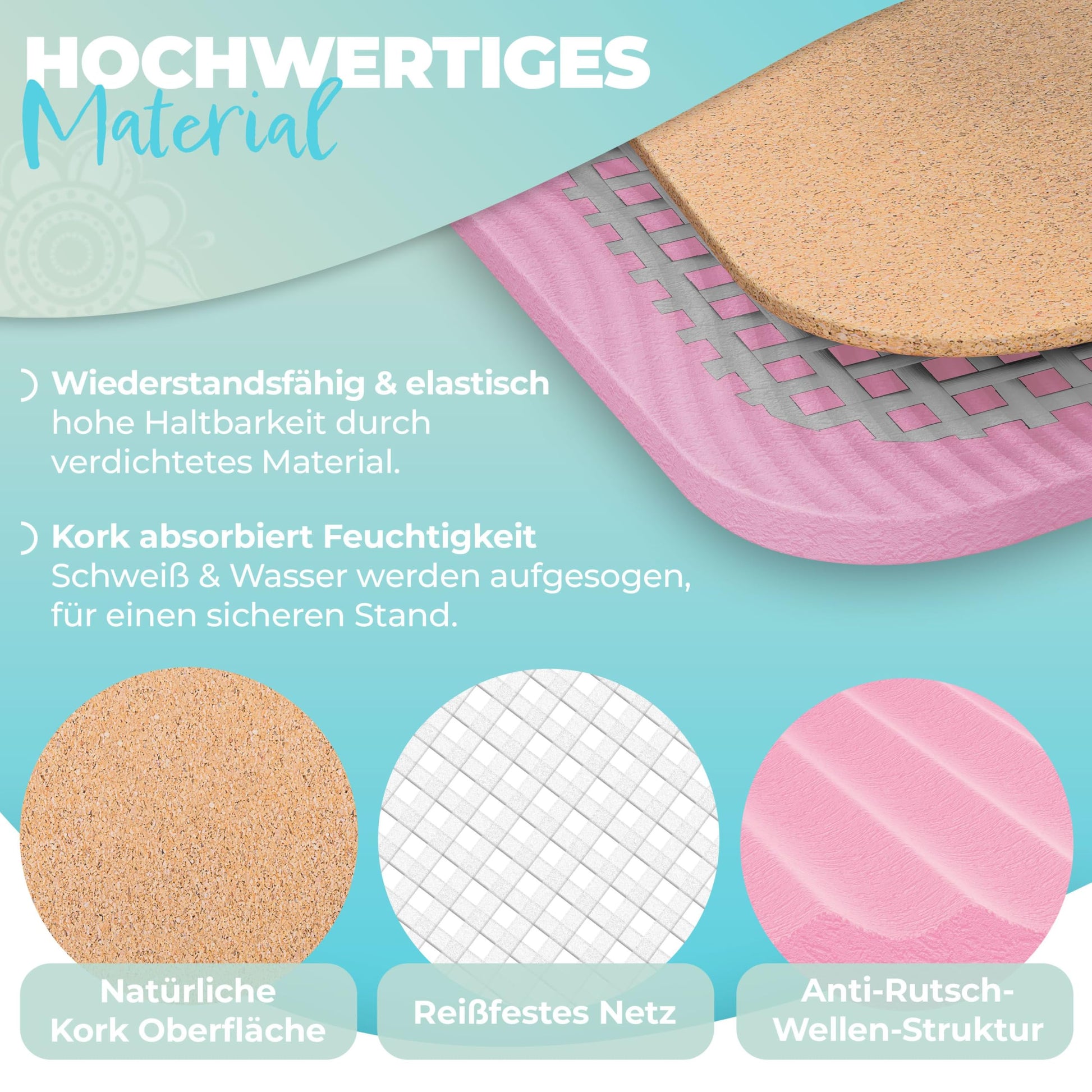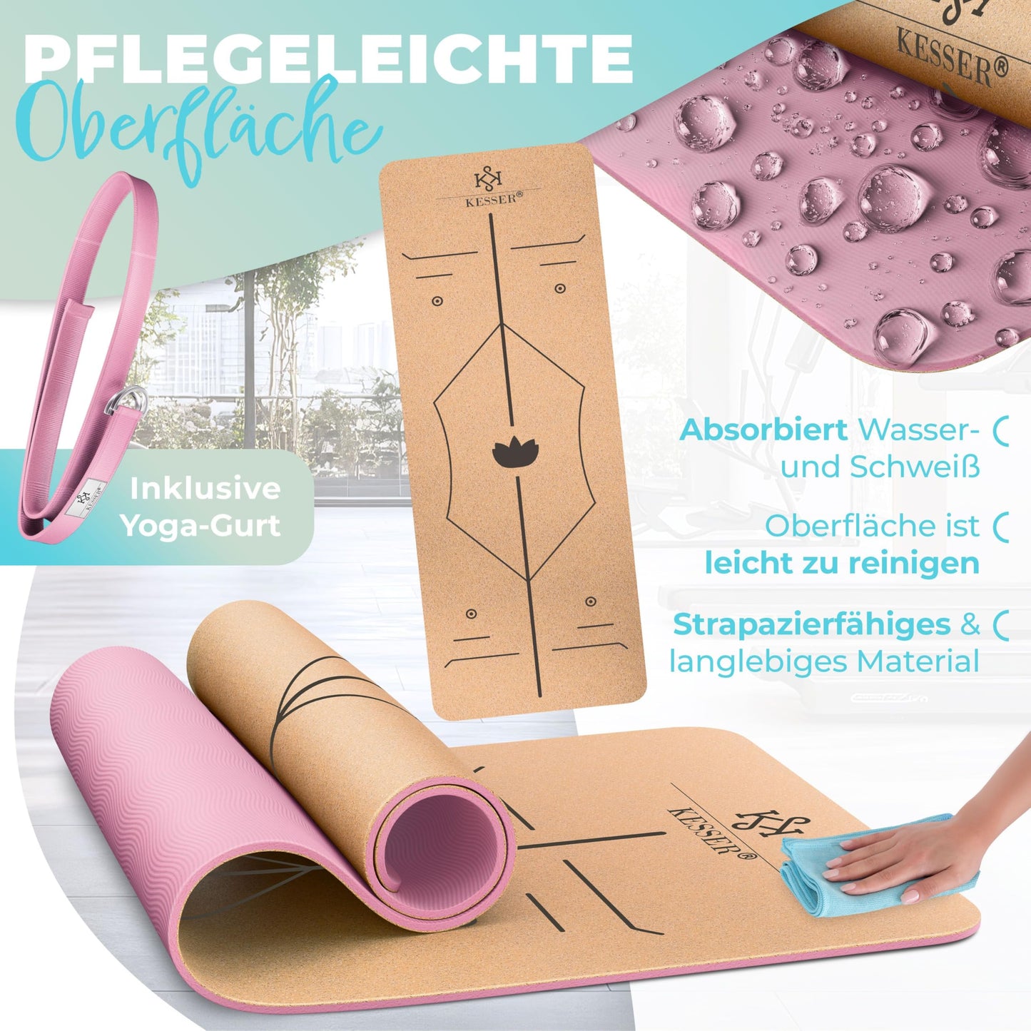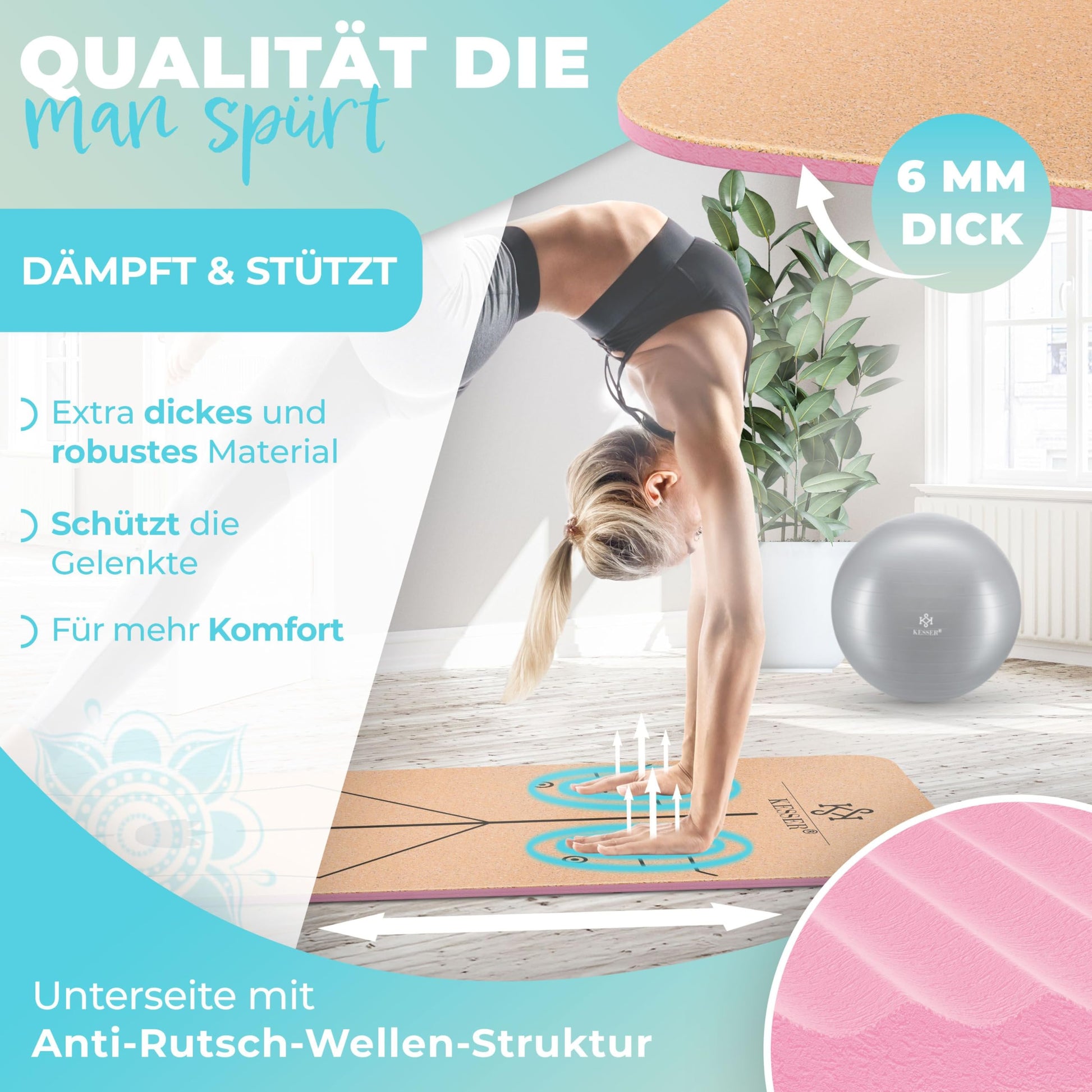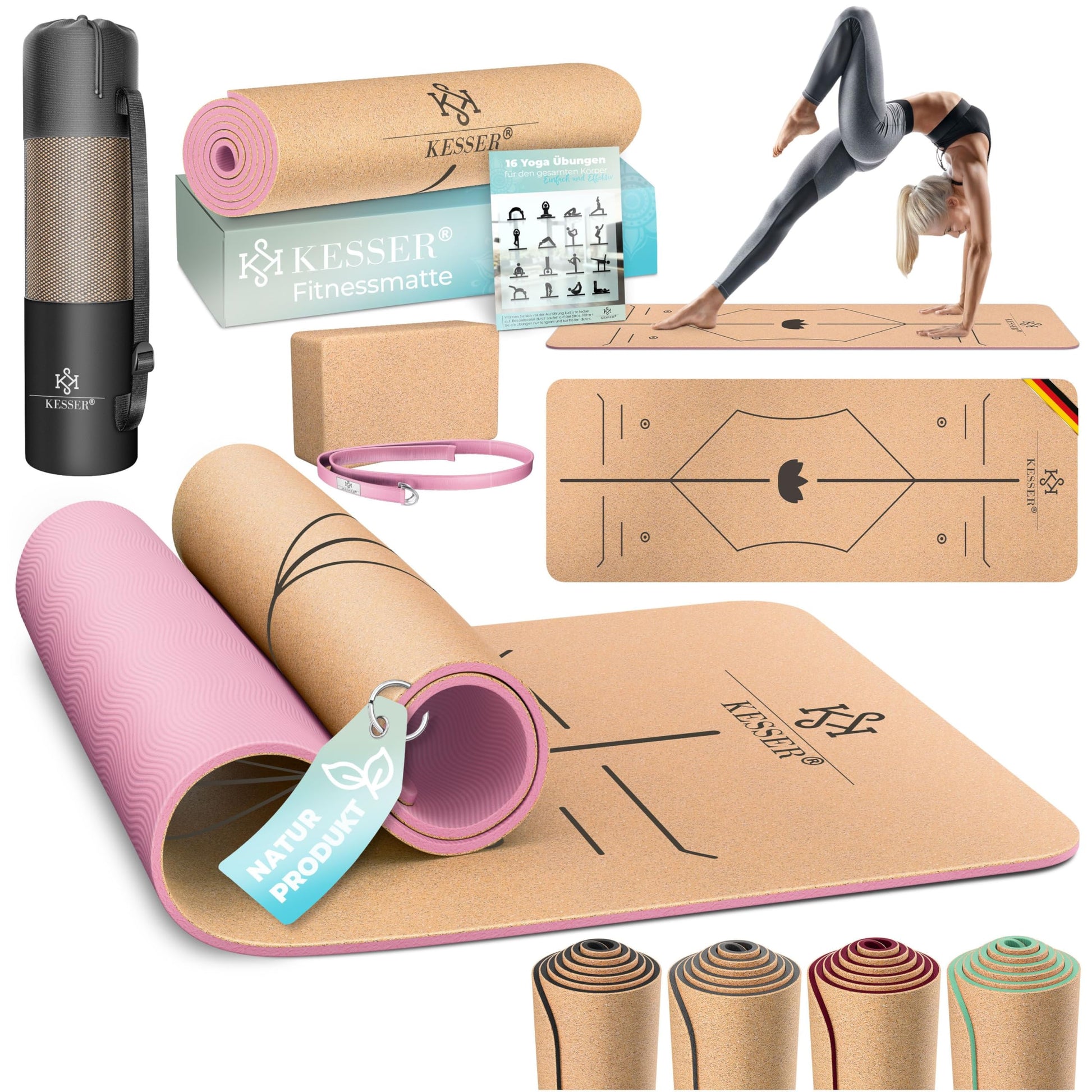 T "Cork Yoga Mat: This cork yoga mat has many advantages over conventional yoga mats. Cork is a renewable resource, biodegradable, has a pleasant smell, and a comfortable texture. Consisting of three high-quality layers - natural cork on top, a tear-resistant mesh in the middle, and a high-quality non-slip TPE layer on the bottom. "Hypoallergenic: The cork mat also has a natural resistance to many harmful microorganisms. A variety of biologically active substances prevent bacteria, viruses, pollen, fungi, mold spores, and the like from infesting it. This makes the yoga mat hypoallergenic and suitable for people with sensitive skin or existing sensitivities. "Alignment Lines System: An unique line system on the training mat ensures perfect body alignment. A horizontal alignment line ensures optimal balance between your hands and feet in a vertical position. A reversal point corrects your hands and feet when lying on your back. The center point ensures that you stay centered on the mat throughout the entire training. "Stable and Durable: The high-quality cork material provides amazing elasticity and break resistance for the mat. The sports mat rolls up easily and quickly returns to its original shape. The common "rolling edges" and "dog ears" of other conventional yoga mats are a thing of the past with this cork model, ensuring long-term use. "For Professionals and Beginners: Whether you are an experienced professional or a complete beginner, a suitable gymnastics mat is indispensable here. Have you noticed that you sometimes feel pain during training because you are too thin for high-intensity training? Then switch to the Kesser fitness mat with a thickness of 0.5 cm and a length of 183 cm, it is the perfect foundation for your training!"