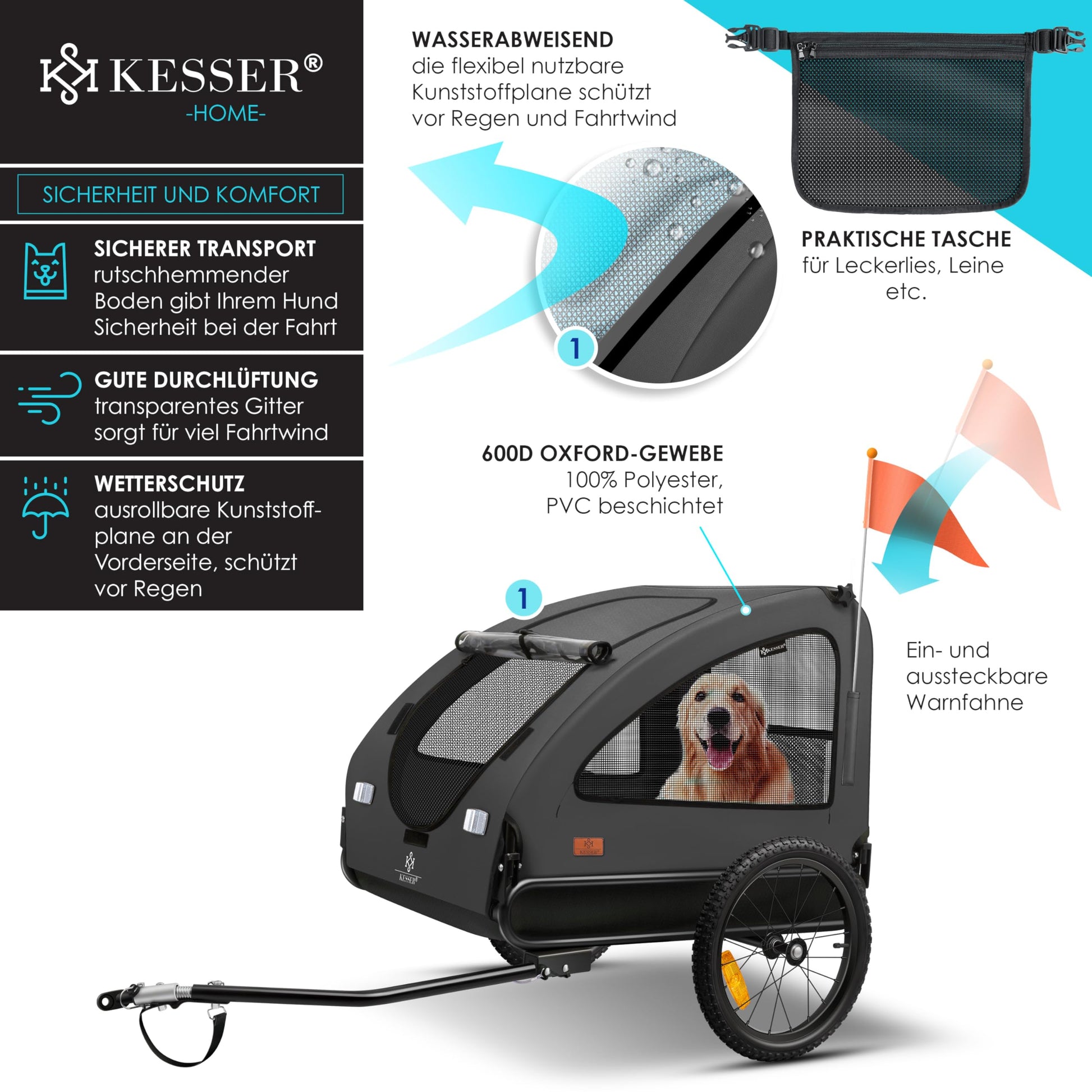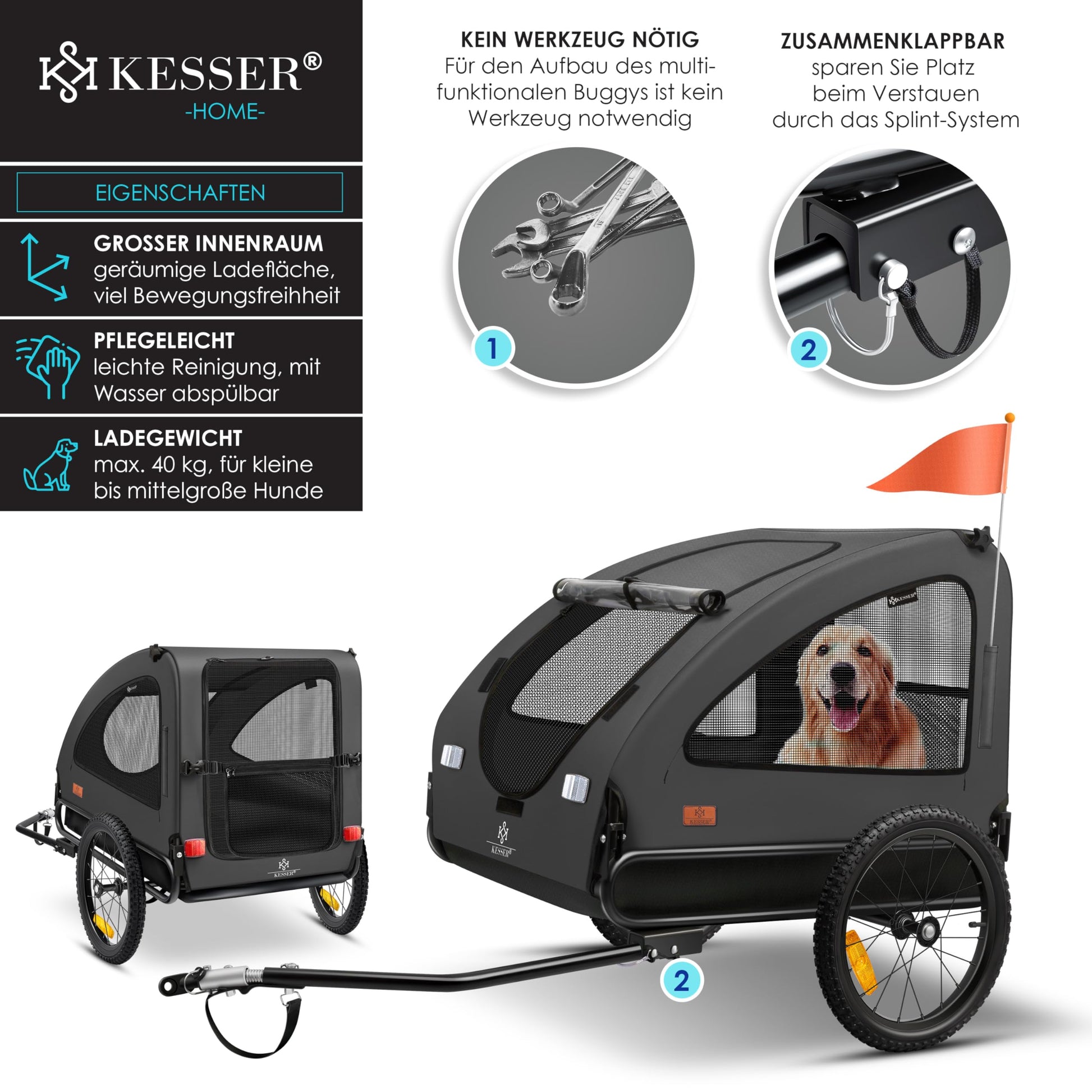 KESSERยฎ Dog Trailer Boxer 2-in-1 Dog Stroller Bike Trailer large approx. 250L volume - Incl. flag and bag - 600D Oxford Canvas, foldable SmartSpace Concept, max. 45kg, Anthracite