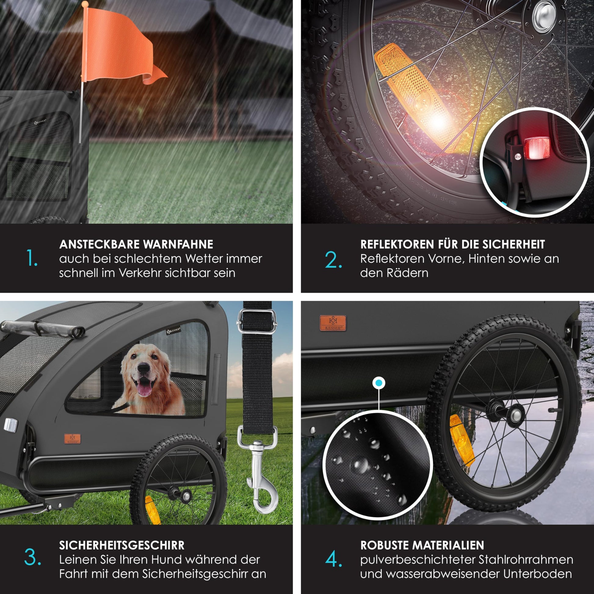 ["๐๐๐๐๐๐๐๐๐๐: Safety First with us! The attachable warning flag keeps you visible in traffic even in bad weather. High-quality reflectors at the front, rear, and on the wheels ensure optimal visibility on the road. The safety harness inside the transport box ensures your dog is protected from potholes and sharp turns."]
