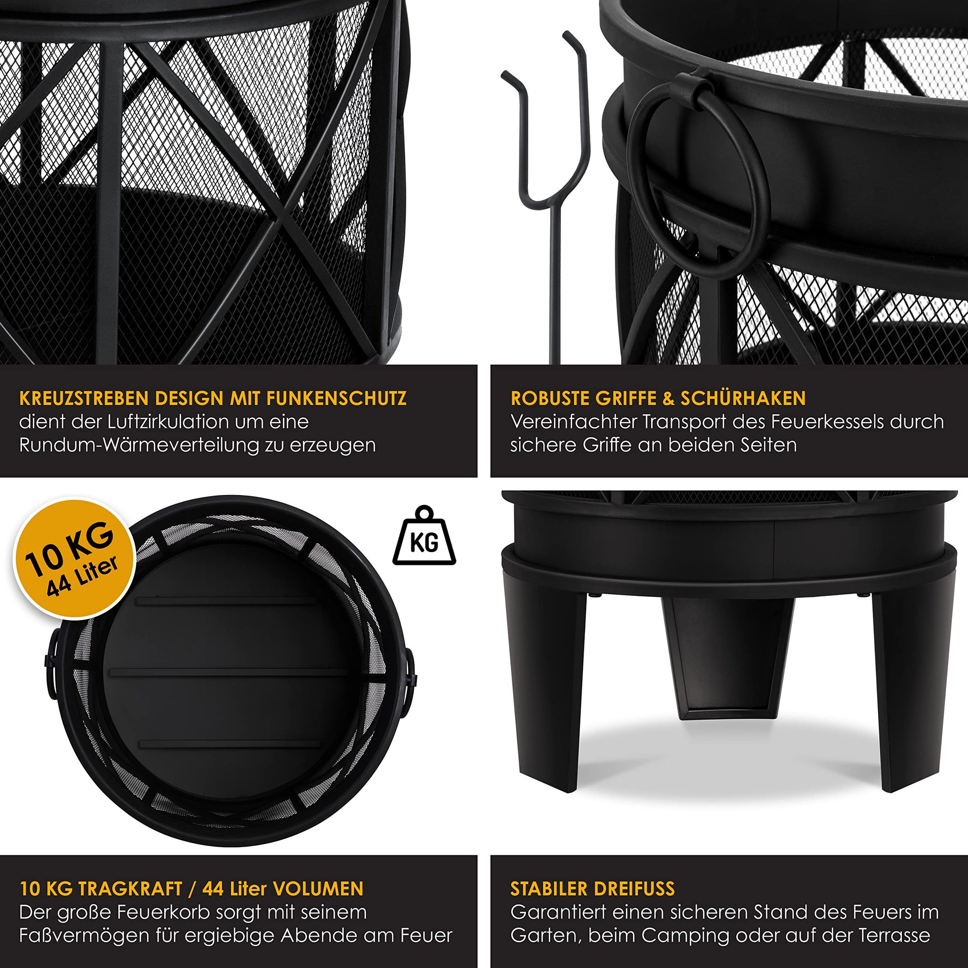 ๐๐๐๐๐๐๐๐๐๐๐ร๐๐๐: The sturdy fire pit ensures a safe fire in the garden. The fire basket provides ample capacity of 44 liters for generous evenings by the fire. Additionally, you can fill enough firewood in our fire bowl, as the 10 kg carrying capacity guarantees you a long-lasting fire. The transport is facilitated by sturdy handles on both sides, and the poker allows for ideal distribution of embers and wood.","๐๐๐๐๐๐๐๐๐๐๐๐ ๐๐๐๐๐๐๐๐: Thanks to the use of high-quality and durable material, the fire pit is particularly UV, rust, and weather resistant. Deformations up to a temperature of 1000ยฐC are excluded due to the heat-resistant material. Cleaning is easy to perform, the ash can be removed in a few steps, and the housing can be rinsed with water, ensuring that your fire pit remains an optical highlight even after multiple uses."]
