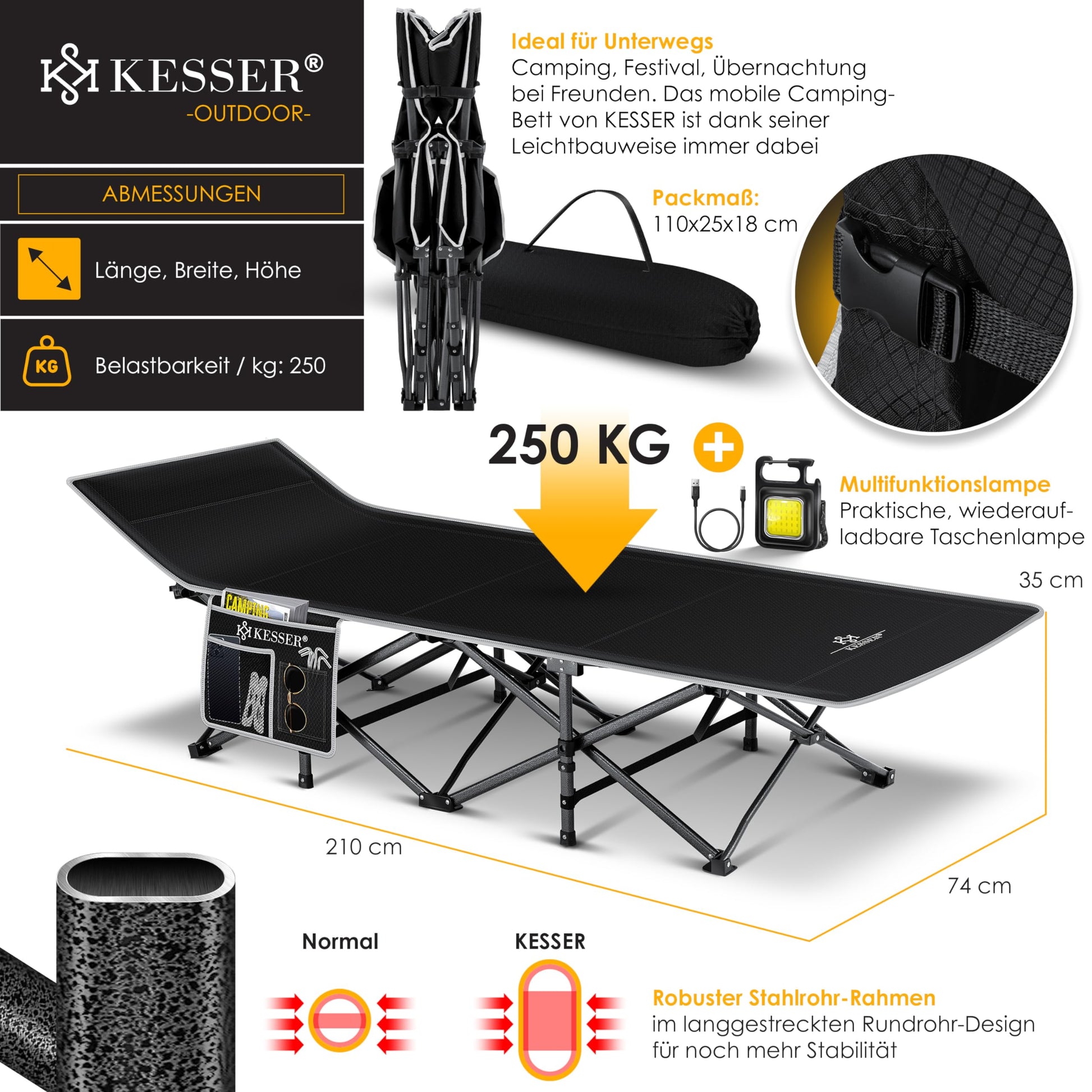 ["HIGHWEIGHT BENEFITS: The KESSER Camping Bed Premium is a high-quality cot designed specifically for outdoor use. With a soft and non-slip Oxford fabric cover, it is comfortable and easy to maintain. The water-repellent surface allows for easy cleaning and quick drying.","DURABLE AND ROBUST: The durable construction of the KESSER Camping Bed Premium is due to a metal frame. The thick 0.8mm steel tube frame in round tube design provides more stability than traditional camping beds and is also waterproof and corrosion-resistant. This means you can use the bed outdoors without worrying about rain or moisture.","FOLD SYSTEM: The clever and innovative folding system of the camping bed allows for quick and easy setup and dismantling in just 10 seconds without tools. This means you can set up and take down the cot quickly and easily, making it ideal for outdoor use. Quickly folded and packed, you can be on your next hike in seconds. Ideal for the next festival or overnight stays with friends.","BELASTBAR INKL. TRAGETASCHE: With a high weight capacity of up to 250 kg, the folding bed is particularly robust and durable. The high-quality and sturdy construction ensures that the bed maintains its shape and stability even with frequent use. The included carrying bag makes transportation and storage of the camping cot easy. Additionally, you will receive a camping light with your camping cot - perfect for nights!","SIDE POCKETS AND OPTIONAL HOOD: A practical side pocket is integrated into the camping bed, providing space for important items such as a phone, drinks, or sunglasses that should always be within reach. The non-slip feet ensure the camping bed remains stable and secure, ensuring a quiet and restful sleep. Since the bed does not have direct contact with the ground, cold is not transferred directly to the body, providing additional comfort."]