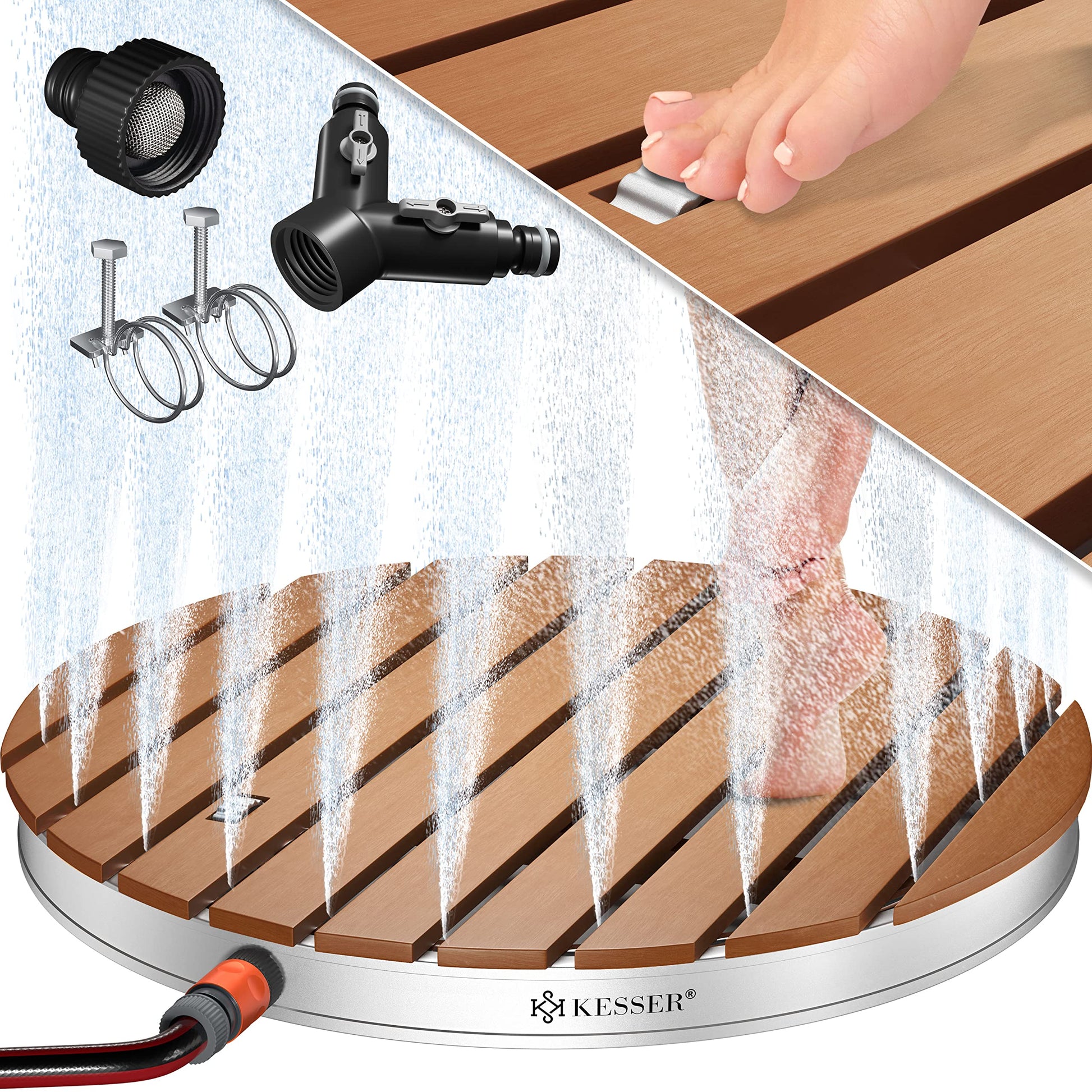 KESSERยฎ garden shower floor shower outdoor shower sauna shower camping shower ร 70 cm round fountain height up to 4 m adjustable with foot pedal, aluminum/WPC, non-slip weatherproof, wood look