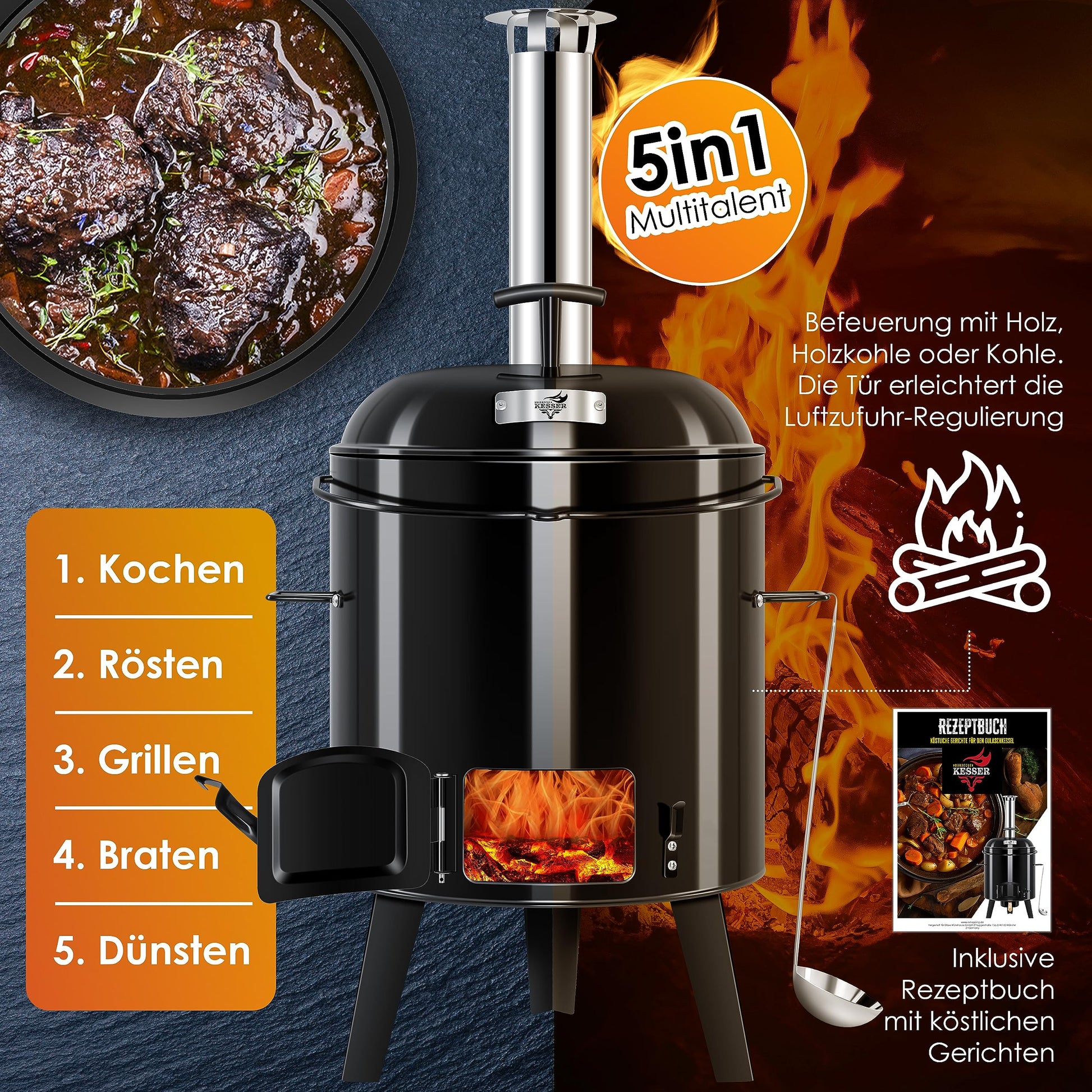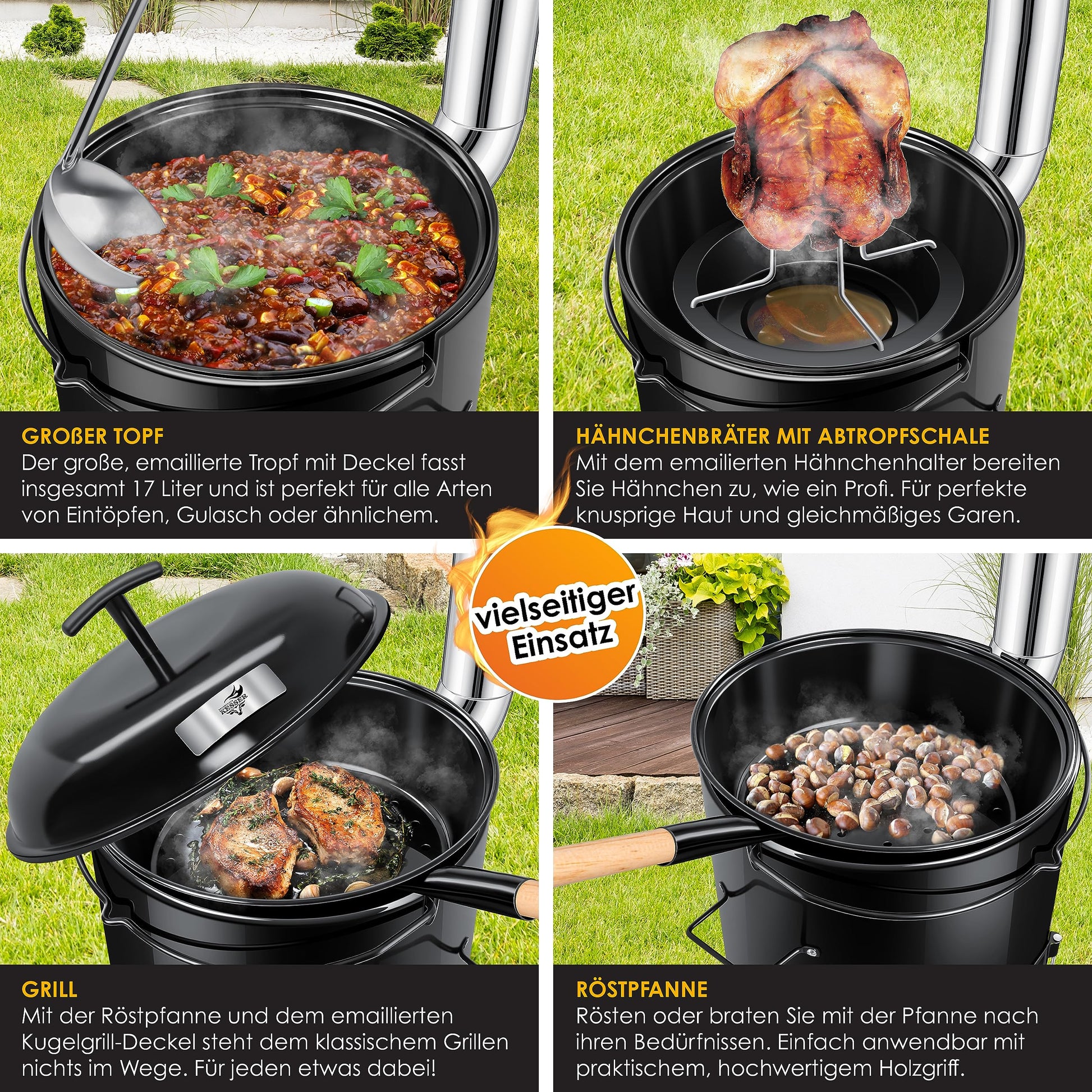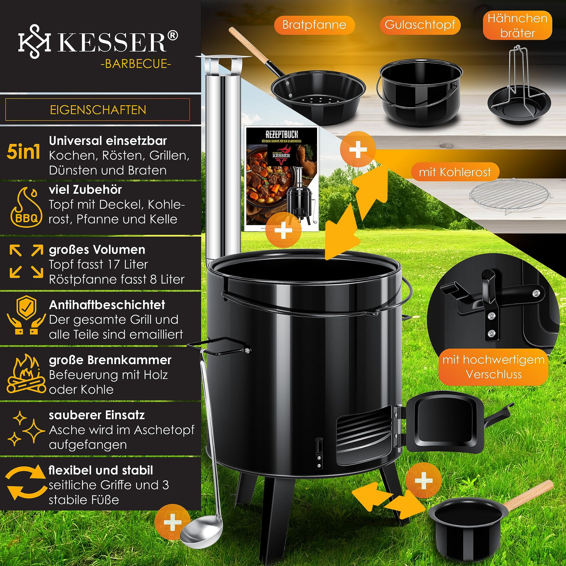 ["BEST AFFORDABLE FESTIVAL: If you have experience with scouts, military, or survival camps, you probably know the classic Gulaschkanone. Nowadays, you can also find it at festivals or events. It's perfect for serving warm soup or stew at your next garden party, kids' celebration, or street fair!","WHAT YOU GET: The large enameled pot with lid holds 17 liters, great for stews, goulash, and more. Cook chicken like a pro with the chicken holder. The roasting pan and kettle grill are perfect for classic BBQs. Something for everyone!","VERSATILITY: The KESSER all-round talent is a real eye-catcher at any party, festival, or camping trip. Ideal for grilling, soups, stews, goulash, mulled wine, and hot drinks. Sturdy feet ensure stability.","EASY TO USE AND CLEAN: Fill the large combustion chamber with wood, charcoal, or briquettes. Easy access and fire door make refilling simple. Two handles for adjusting the Gulaschkanone. Ash falls through bottom holes, and a ash pot makes cleaning easy."]
