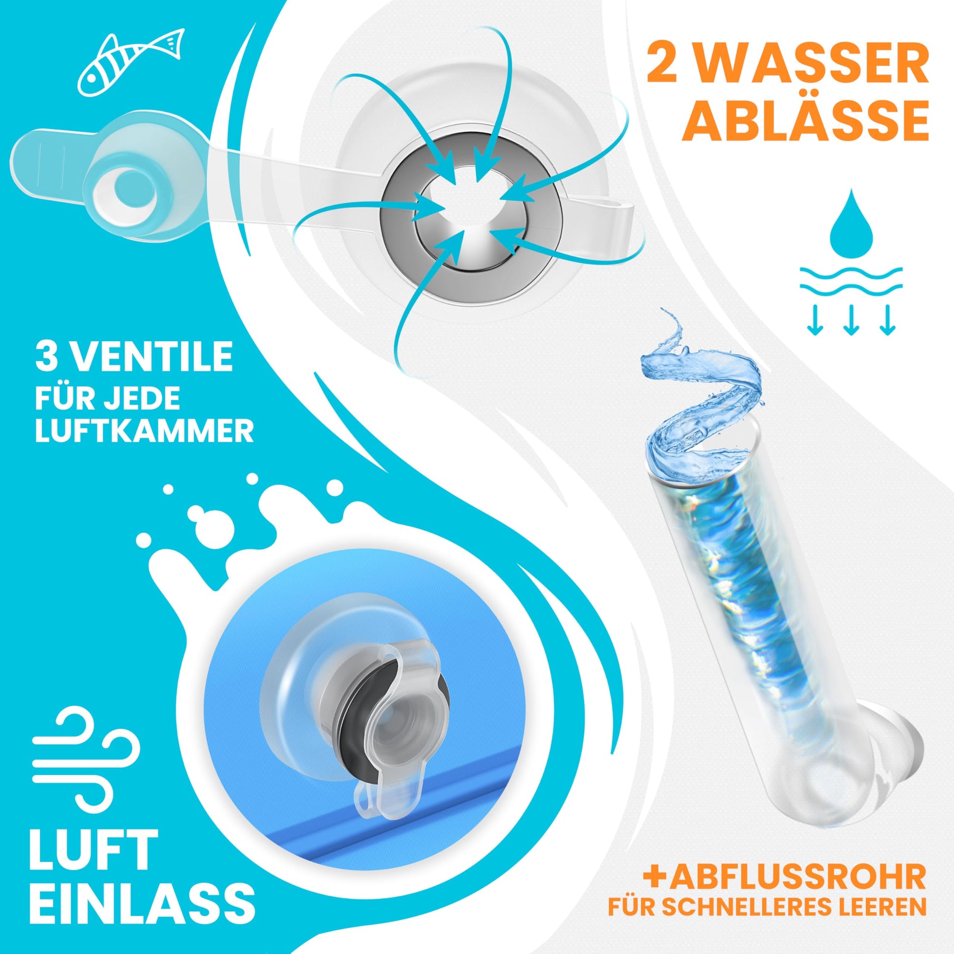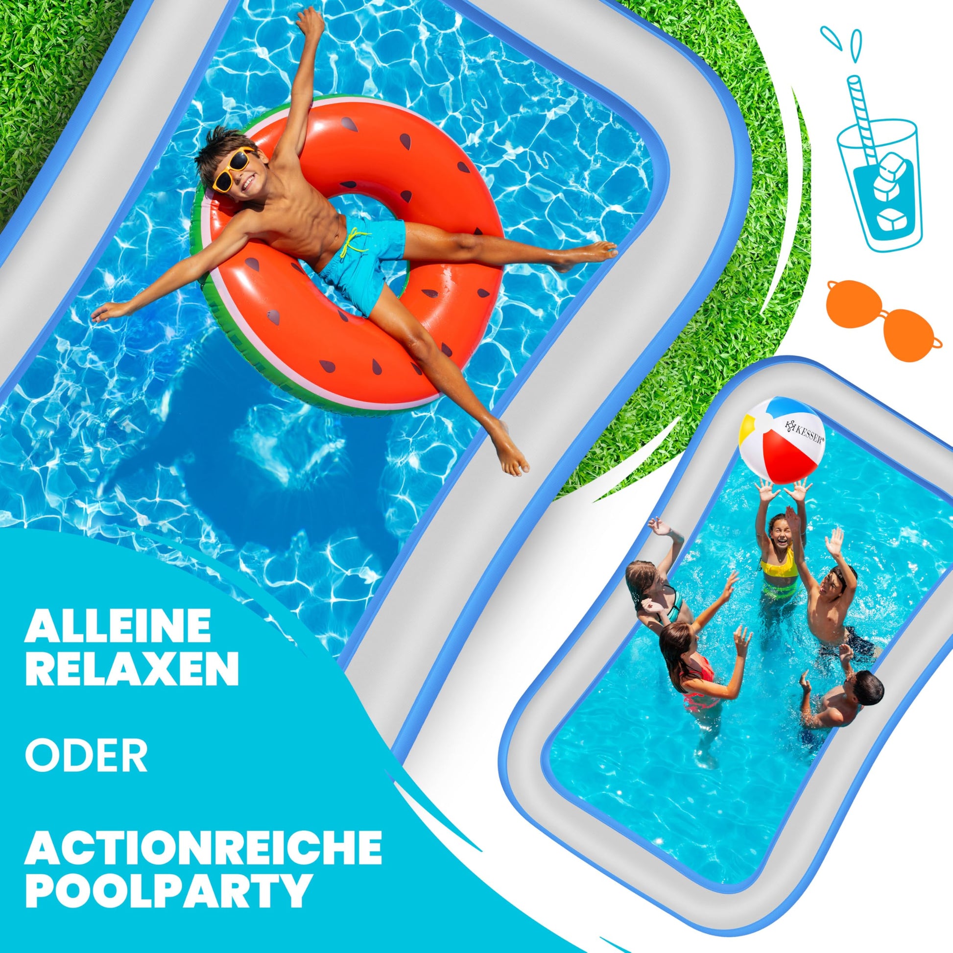 ["OPTIMAL FÜR KINDER: The round edges of the pool provide an easy entry for your child and protect against possible injuries. Each air chamber has a recessed intake valve, which also protects against injuries and prevents sudden air leakage. Transform the water pool into a ball pit in no time by filling it with play balls!","PLATZ FÜR ERWACHSENE: There is also plenty of space for larger pool fans - relax with friends or family in the paddling pool and enjoy the hot summer days in the cool water with a cold drink or cocktail. You will find enough space for the next pool party in your garden with your friends. With a choice of two different colors and sizes, there is something for everyone here.","WASSERSPASS FÜR ALLE: Cool off in the garden - on hot summer days, this swimming pool is the ideal solution for cooling off for young and old. The family pool can be quickly inflated and is ready for use. Whether you just want to relax or have water battles with the kids, everything is possible because the splash pool is resistant due to its 0.4mm thick and very robust PVC material.","VIELSEITIGES NUTZBAR: The bathtub offers versatile playtime. Turn the water pool into a ball pit in no time by filling it with play balls! This allows your children to use the swimming pool even in winter and bathe among balls. When not in use, you can easily dismantle the garden pool, release the air, and then store it in a space-saving way.","LEICHTES LEEREN DES POOLS: Two drainage holes with drain pipes at the bottom ensure that you can remove the water from the pool without much effort and ergonomically. This allows the pool to be dismantled as quickly as it can be set up. The PVC material can also be easily and quickly cleaned with a damp cloth." ]