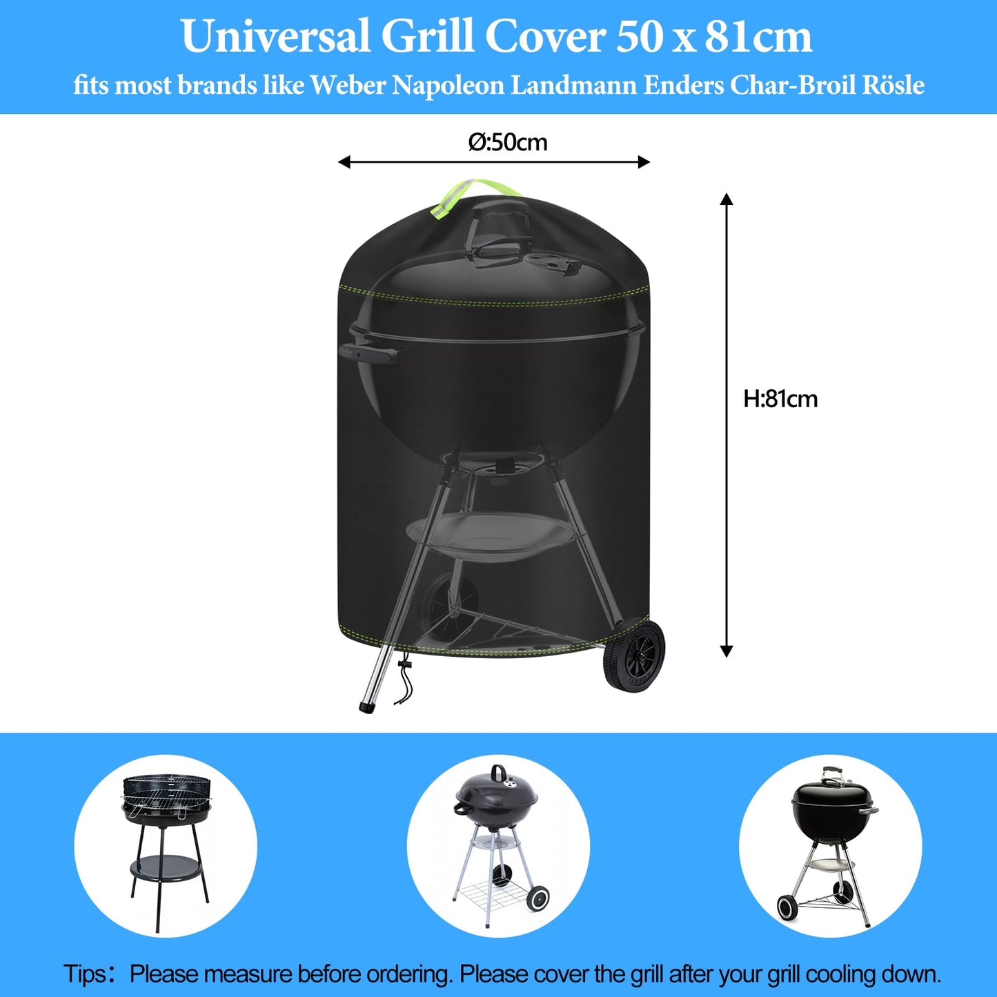 ["The waterproof kettle grill cover made of high-quality 420D Oxford fabric, which is weatherproof, waterproof, UV-resistant, and tear-resistant. 50UV+ sun protection, PU3000mm+ waterproof. Can better protect your grill from sun, water, wind, and dust.", "With drawstring and carrying handles, ensuring that the cover fits snugly on the kettle grill and is tight even in extreme outdoor conditions. Don't worry about your grill cover being blown away in strong winds.", "Compared to other grill covers, our grill cover has solid seams, double-seam process, not easy to fall off, durable, and not easy to tear, prolonging the service life. Apply waterproof tape to the seams to prevent leakage, protecting the grill from rust and mold.", "The grill covers are sturdy, water-resistant, and tear-resistant. It is also easy to clean. Externally, it is sufficient to clean the dirt with water, a soft sponge, and some detergent.", "Our grill cover is a universal style, suitable for many brands such as Weber, Napoleon, Enders, Landman, Rösle, Broil King, etc. The size of this grill cover is Ø63x88cm. Please check the size of your grill before purchasing."]