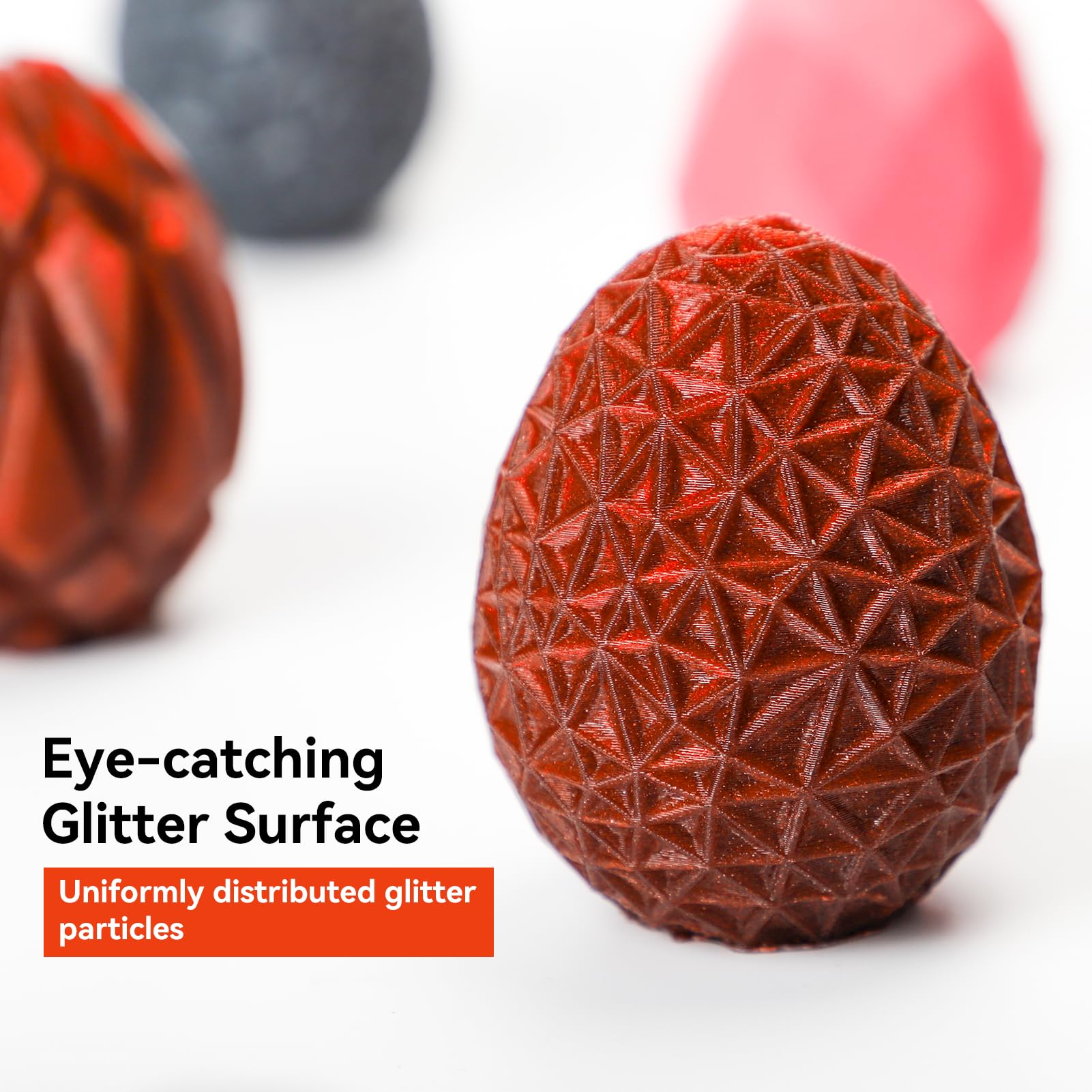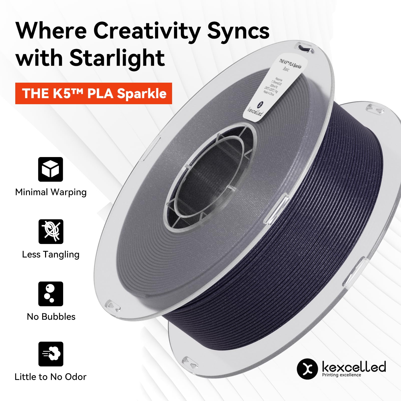 ["Sparkle PLA Filament with Stardust Effect: Evenly distributed glitter particles create dynamic light refraction under any lighting. Perfect for artistic 3D printing projects and eye-catching decorations.","Invisible Layer Lines: The interaction of light-reflecting particles reduces visible layer lines. Achieve shiny surfaces without post-processing. ≥0.4 mm nozzles are recommended.","Effortless Printing: no special effects at the expense of print performance. Mature technology and formulation allow for a smooth printing process without constant parameter adjustment.","Tangle-Free: Kexcelled Filament utilizes fully automated winding technology to prevent tangling and clogging during printing. Completely dry vacuum sealed - no moisture or air bubbles.","Wide Compatibility & Settings: Compatible with most 3D printers. Printing temperature: 392-428°F, bed temperature: 86-140°F, printing speed: 1.6-3.1 in/s"]