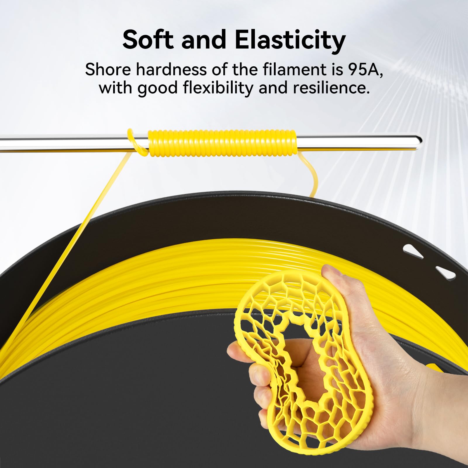 ["Flexible Filament: TPU 95A is a multifunctional elastomer that is both elastic and flexible. It is abrasion and tear resistant, as well as oil and solvent resistant. The filament is too soft and is not supported by AMS.","Note: TPU filaments absorb water more easily, so it is recommended to use them under conditions where drying facilities are available. When printing, it can be placed in a dry box to keep the humidity in the box at around 15% RH or less.","Impact Resistance: The printed parts have excellent strength between layers, good elastic deformation capability, and can withstand various external impacts. Ideal for flexible applications, machinery, and fashion projects.","Low-Temperature Flexibility: The printed parts are flexible even at low temperatures and can usually be used at -50°C or higher. They are suitable for some cold regions such as Russia, Canada, Northern Europe, etc.","Easy Adhesion Platform: The filament has excellent platform adhesion and can easily adhere to platforms made of various materials such as glass and PC. Printing temperature: 225-245°C, Bed temperature: 50-80°C, Printing speed: 20-50mm/s"]