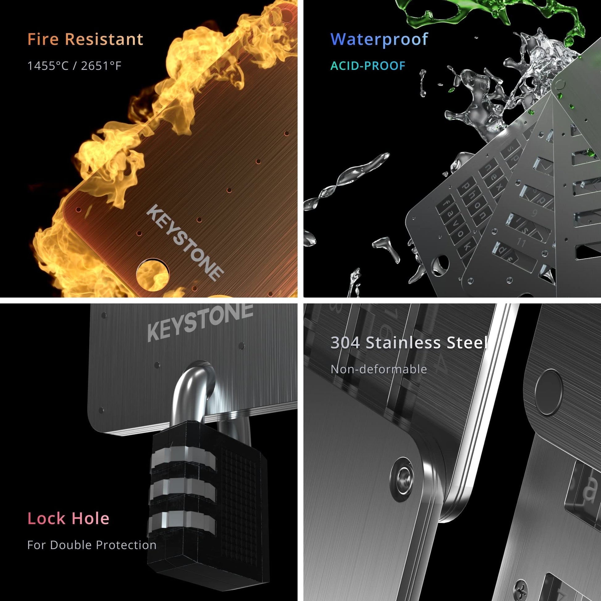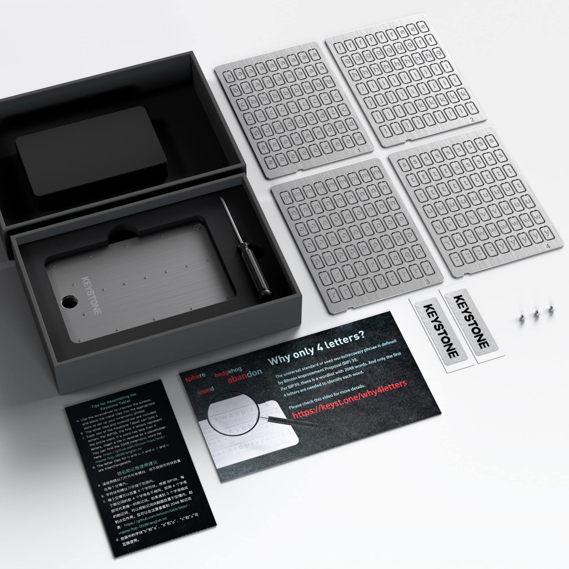 ["【DURABLE AND INDESTRUCTIBLE】: The Keystone Tablet Plus, made of 304 stainless steel, is the long-term solution to help you securely store your crypto seed phrase with its corrosion resistance. Special screws protect the tablet from deformation and it is also fireproof from 1399 to 1455°C. (House fires reach up to 649°C).","【SLIM AND EFFICIENT DESIGN】: Slightly larger than a credit card, your Keystone Tablet Plus fits into any pocket. Simply slide open the tablet to access it. To provide additional security, you can use the built-in keyhole to lock your seed phrase with a physical lock. All alphabetical letters come with tamper-resistant stickers and are laser engraved to ensure corrosion resistance.","【SEED PHRASE STORAGE】: Supports seed phrases with 12, 18, or 24 words (only the first 4 letters of each word are required). Suitable for all types of cryptocurrencies (Bitcoin, Ethereum, Ripple, Litecoin, Dogecoin, Cardano, Binance Coin, Shiba Inu, Avalanche, Solana, Terra, Polygon, USDC, USDT, etc.)","【WIDE RANGE OF COMPATIBILITY】: Compatible with all BIP39 hardware and software wallets (Ledger Nano X, Trezor, Bitbox, KeepKey, Coldcard, MetaMask, Coinbase Wallet, Electrum, Mycelium, Exodus, Wasabi Wallet, Opolo, Cobo, ZenGo, CoinSmart, etc.).","【WHAT YOU GET】: 1 Keystone Tablet Plus, 4 sheets of alphabetical metal letters (total of 252 letter tiles), 2 tamper-resistant stickers, spare screws, a screwdriver, and an instruction manual.","【ATTENTION】: Due to the large number of screws and weld points in this product, it may have scratches on the surface, which is normal. If you cannot open the tablet after a long transport, please follow this video: https://www.youtube.com/watch?v=i-yFzRg5MTY"]