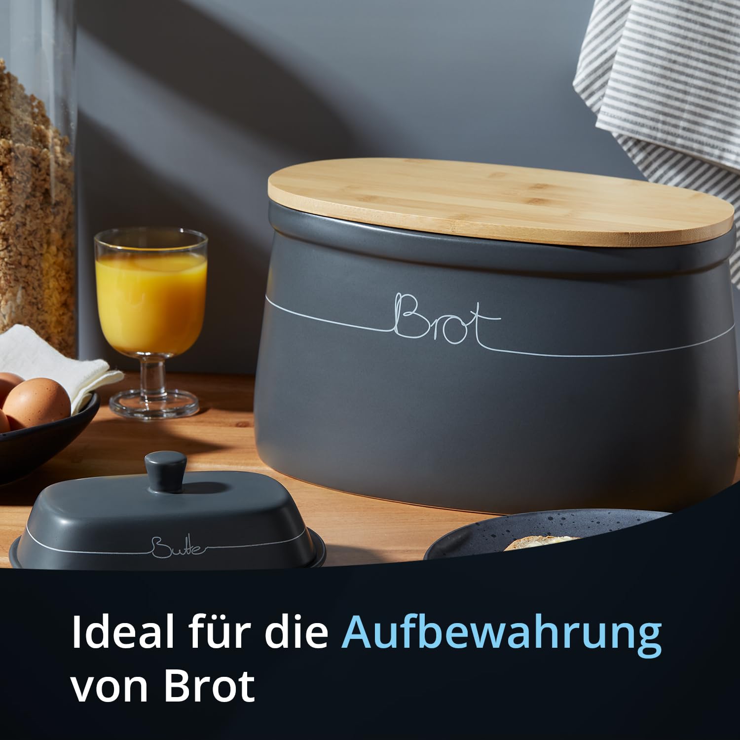 KHG Bread box large ceramic stoneware gray charcoal, wooden lid bamboo as cutting board, bread storage with matte & polished surface with labeling & ventilation holes