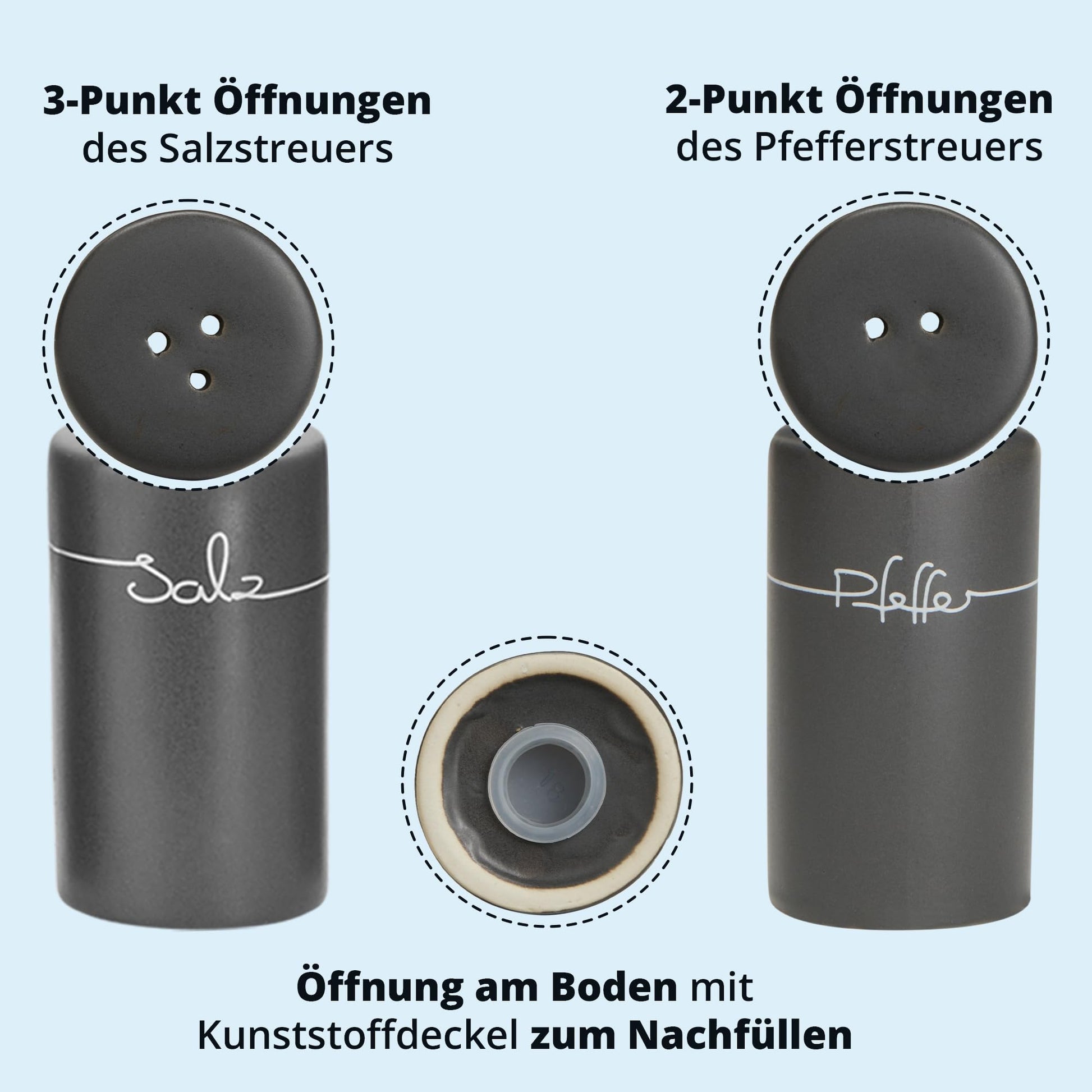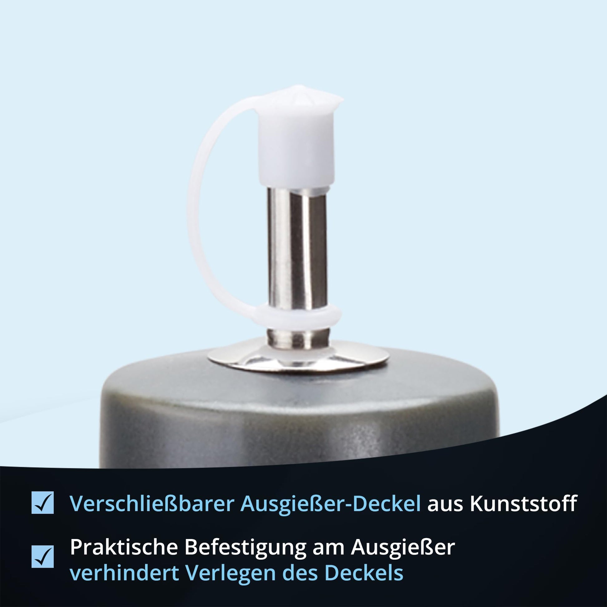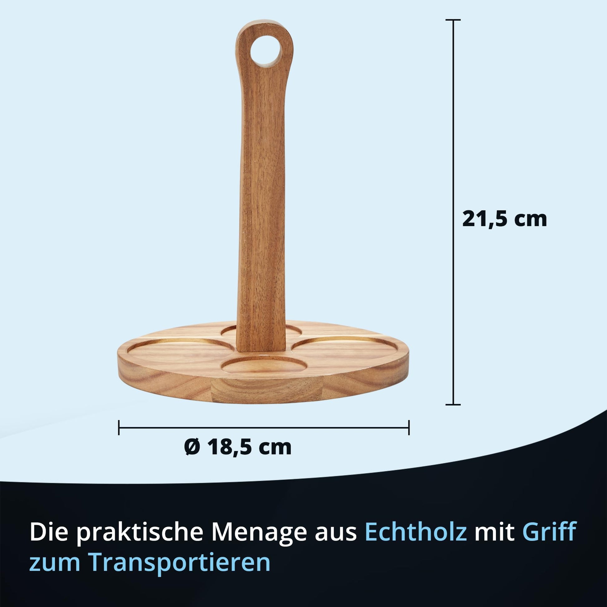["Modern Design ✅ The beautiful anthracite gray color and the lovely wooden holder give the Menage Set a modern design. The polished surface and the white lettering provide the finishing touch.","Convenient Holder ✅ The beautiful wooden holder not only allows for a nice presentation of the Menage Set, but also makes it very easy to handle. With just one grip, you can grab and adjust the entire stand. Also ideal for restaurants & co.","Practical Size ✅ The oil, vinegar, salt, and pepper set from KHG is perfect for setting up on the dining table. The oil and vinegar dispensers have a height of 8.5 inches and a diameter of 2.36 inches. The salt and pepper shakers have a height of 3.15 inches and a diameter of 1.77 inches. The Menage holder has a height of 8.27 inches, a width of 7.09 inches, and a depth of 3.15 inches.","Matching Series Available ✅ The KHG Menage Set can also be ordered together with additional storage jars from the same series. The entire series is visually coordinated.","Easy to Refill and Clean ✅ The dispenser head of the oil and vinegar dispenser can be easily unscrewed, and the lid at the bottom of the salt and pepper shaker can also be easily removed. This allows you to not only refill quickly but also rinse the interior easily by hand."]