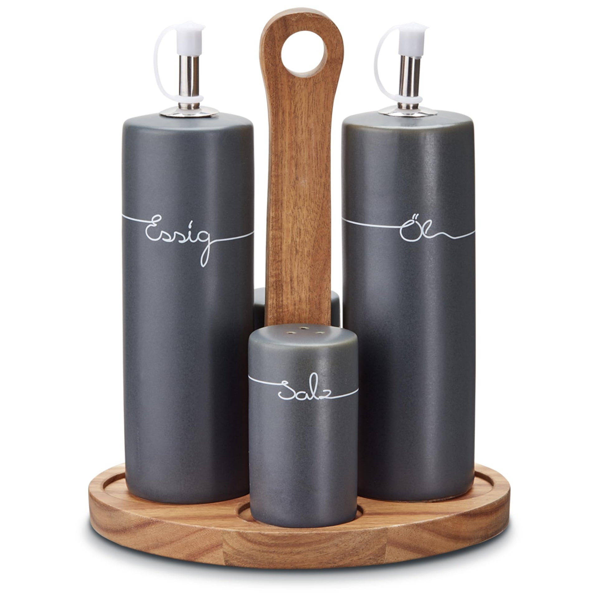 KHG Menage Set, ceramic stoneware polished, anthracite grey with wooden holder for oil, vinegar, salt & pepper for the table with labeling | 5-piece oil & spice storage with protective lid.