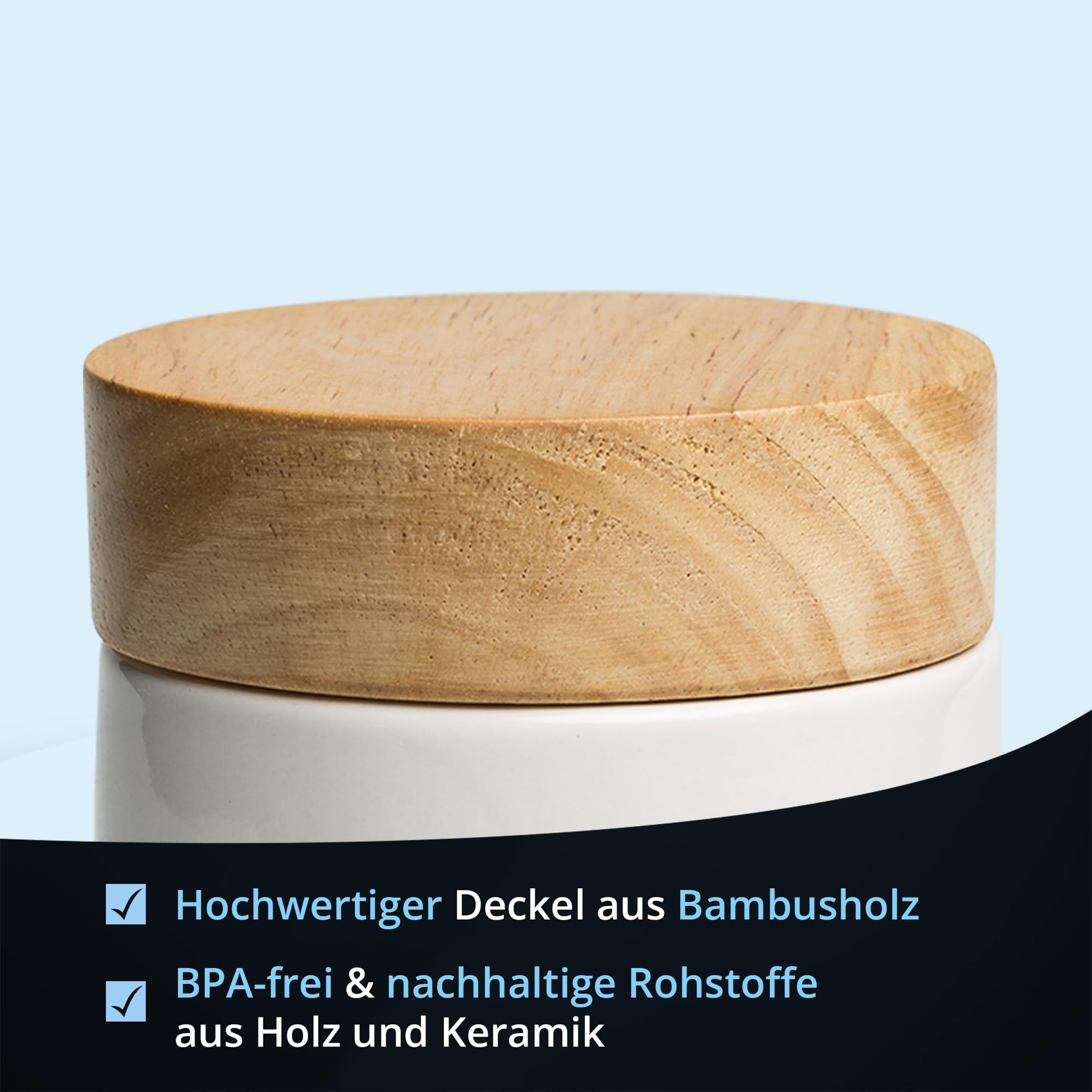 All storage containers from the series are made of stoneware. Stoneware is a type of ceramic product that is much more resistant to breakage than traditional ceramics. The lid is made of high-quality bamboo wood."]