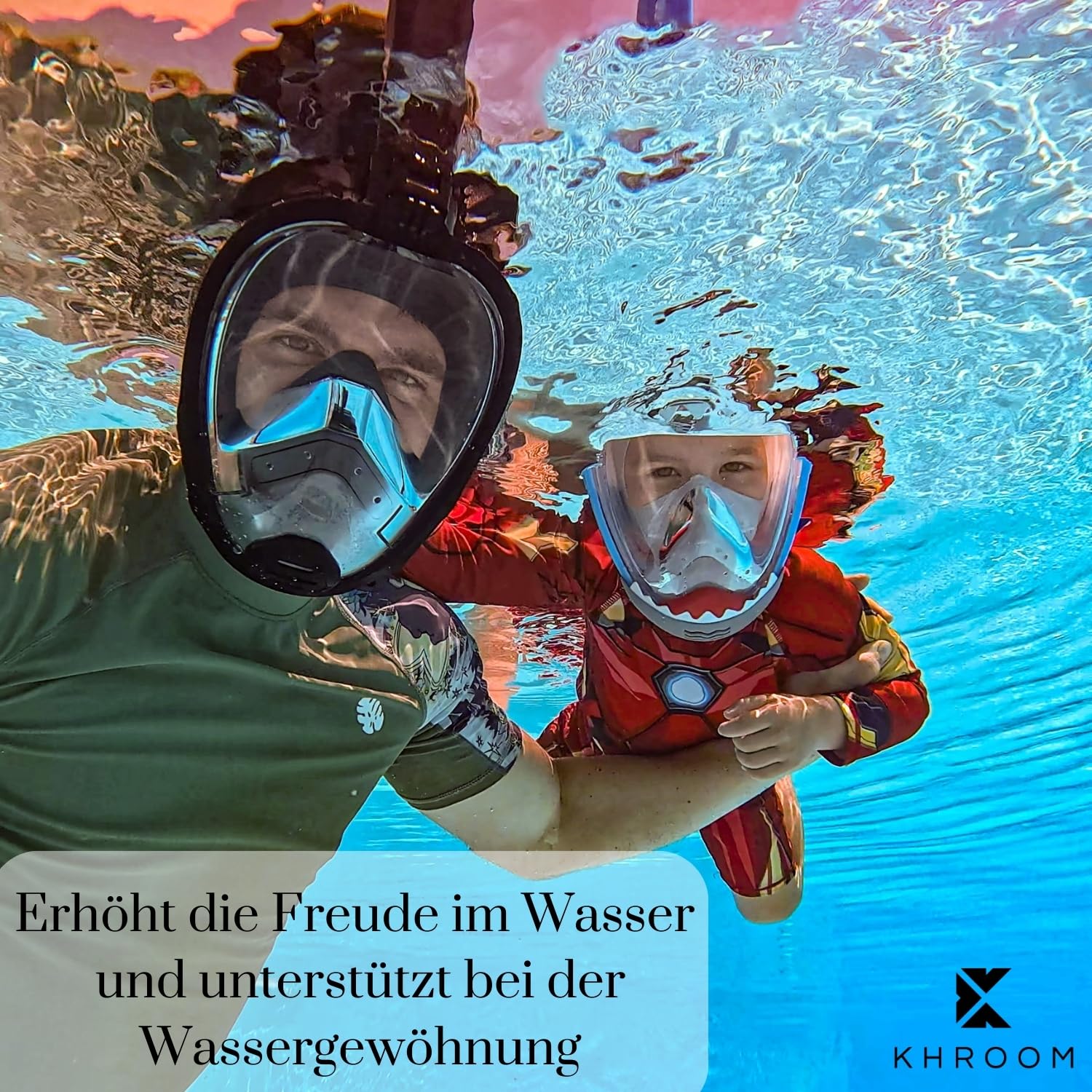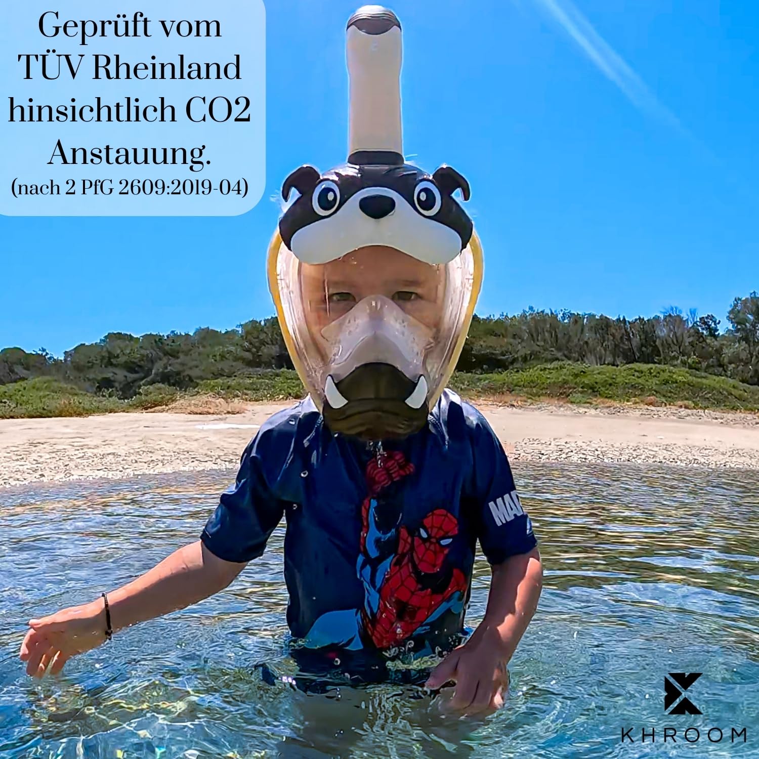 ["TÜV-CERTIFIED & CO₂-SAFE: Our snorkel mask for kids is certified by TÜV Rheinland. While other brands advertise with purchased logos without standards, we focus on real safety. The laterally diverted breathing system prevents pendulum breathing - tested according to 2 PfG2609:2019-04.", "PROMOTES LEARNING TO SWIM: Our snorkel mask actively supports children in the water. The buoyancy helps with learning to swim, the full mask prevents swallowing chlorinated water and reduces fears - ideal for children aged 3 and up.", "COMFORT THROUGH EASY-BREATH SYSTEM: Kids breathe freely through mouth and nose. The full face mask is significantly superior to the snorkel set in terms of technology and comfort - ideal for relaxed snorkeling even for inexperienced children.", "TRULY SUSTAINABLE: With Khroom, you receive all the important spare parts for our children's snorkel mask. While other brands only advertise sustainability, we consistently implement it through real repairability.", "POPULAR ON SOCIAL MEDIA: The snorkel mask for kids has been shared thousands of times in viral Reels and is popular with families. Khroom is an established brand with over 1.6 million satisfied customers worldwide and an 'Excellent' rating on Trustpilot"]