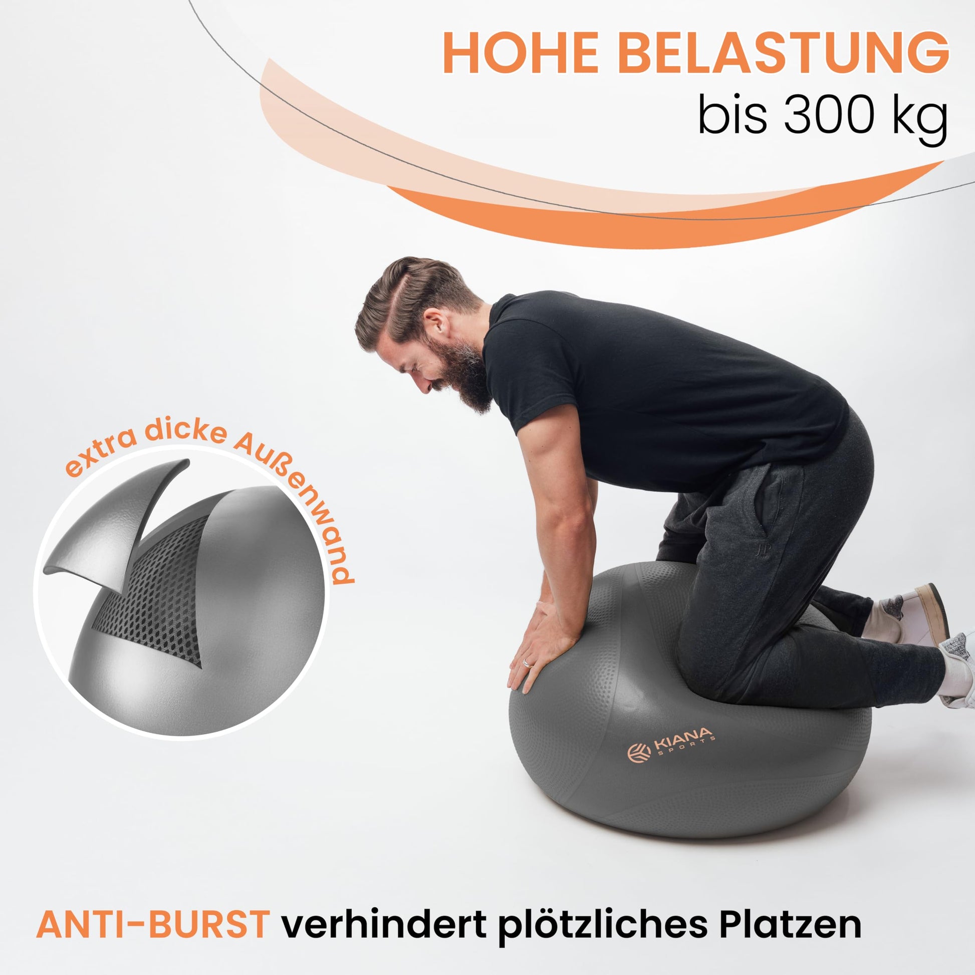 ["✅ MAXIMUM WEIGHT CAPACITY: Our Gym Ball is designed for high loads. With the extra thick walls, it can withstand 300 kg and provides exceptional stability. Perfect for use as a fitness ball, pregnancy ball, and ergonomic sitting ball - our exercise balls remain reliably in shape even under intense use.", "✅ ANTI-BURST TECHNOLOGY: Our Fitness Ball is equipped with advanced anti-burst technology. This prevents sudden bursting of the exercise ball and ensures that air slowly escapes in case of damage - your safety is our top priority.", "✅ ANTI-SLIP NODULE SURFACE: The nubbed surface of the Physio Ball ensures maximum slip resistance. Whether at home, in the office, or at the studio - the training ball stays slip-resistant on all surfaces, allowing you to fully concentrate on your exercises.", "✅ COMPLETE SET WITH PUMP & EXERCISE PLAN: The yoga ball comes with a handy air pump so you can quickly get started. In addition, you will receive an exercise plan for beginners and professionals, allowing you to get the most out of your training - we support you even after the purchase.", "🤝 GERMAN CUSTOMER SERVICE: We stand behind the quality of our exercise ball. Test the KIANA SPORTS Yoga Ball completely risk-free. If you are not satisfied, you will receive your money back without any ifs or buts. Your satisfaction is our motivation!"]