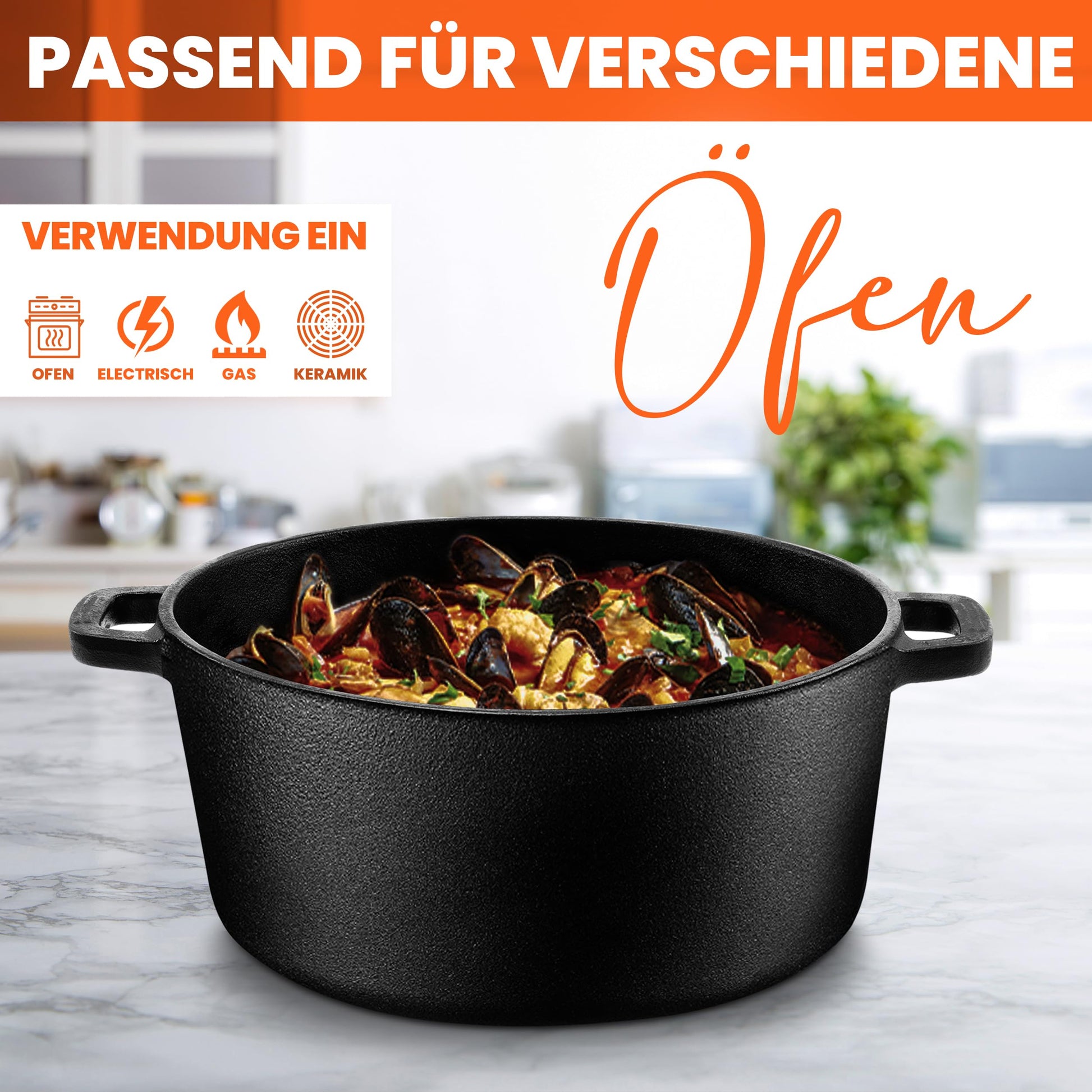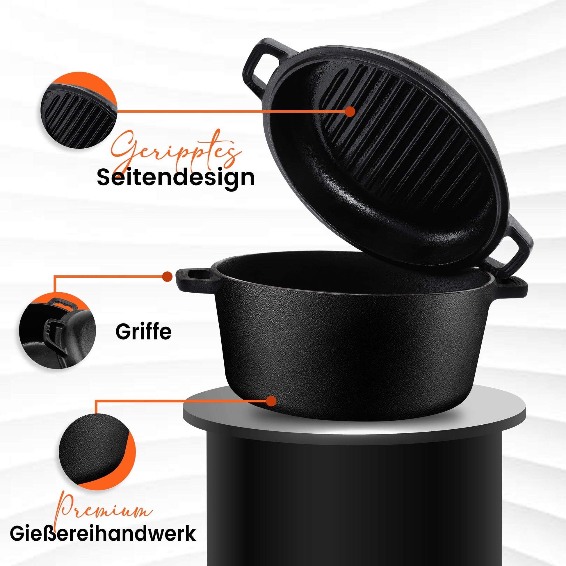 ["5 QT/4.7 liters Pre-seasoned Dutch Oven: The pre-seasoned cast iron pot is an ideal kitchen accessory for family meals. The double handles and optimal size provide comfort and functionality, allowing for easy storage and maintenance, making it perfect for indoor and outdoor cooking.", "Even Heat Distribution: The cast iron dutch oven is expertly crafted to retain maximum heat and bind optimal moisture. The thick walls keep the temperature stable, making it perfect for searing meat and sautéing vegetables.", "Combo Offer: The cast iron pot comes with a 2 in 1 package. The lid of the pot can be used as a griddle. The ridged griddle is perfect for steaks and outdoor grilling. It can be used in the oven or on the stovetop.", "Versatility: The perfect Dutch Oven for baking bread with a good spring. It is suitable for all types of cooking. Whether baking, stewing, roasting, or searing, the Dutch Oven is the right choice.", "Care Instructions: To avoid rust, we recommend seasoning the cast iron pot at 175°C with a thick layer of cooking oil. Wash it with warm water and apply some oil afterwards to maintain quality."]