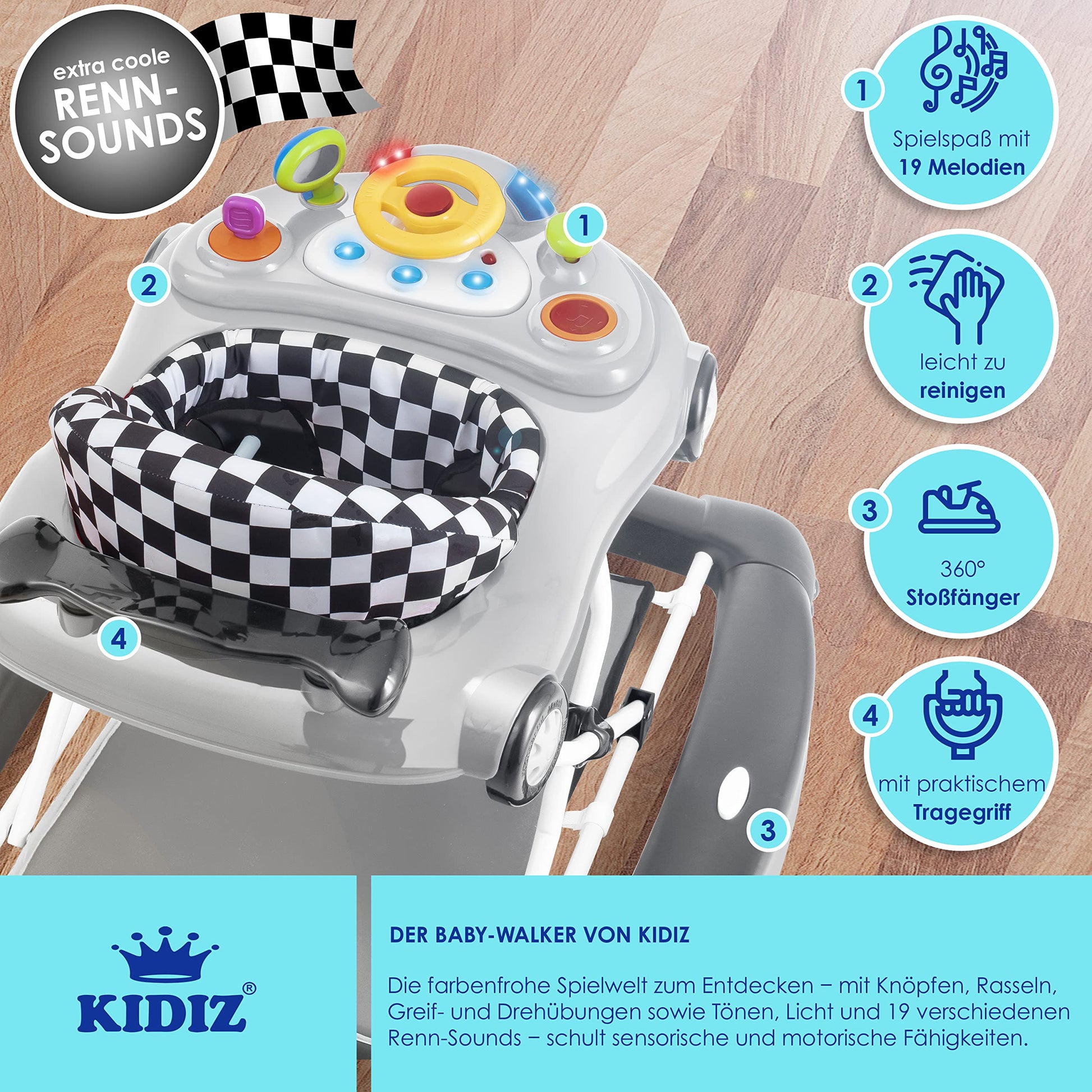 "๐Œ๐”๐‹๐“๐ˆ๐…๐”๐๐Š๐“๐ˆ๐Ž๐๐€๐‹: Whether as a car seat, walking aid, play and learning environment, dining table or rocking chair - with the KIDIZ Babywalker, you have all options in one device. Colorful and versatile, the baby walker will delight your baby. The first steps of your little one should be safe and controlled. With the walking school, you have the perfect teacher for your baby's first steps." "๐’๐ˆ๐‚๐‡๐„๐‘๐‡๐„๐ˆ๐“: 360ยฐ bumper for reliable protection for child and furniture. 6 strong stoppers brake before steps and edges. The very quiet wheels protect the floor and ears. Two 360ยฐ wheels are available for steering the pushcart. The step protection is robust and removable, preventing it from running away." "๐•๐€๐‘๐ˆ๐€๐๐„๐‹ ๐”๐๐ƒ ๐Š๐Ž๐Œ๐…๐Ž๐‘๐“๐€๐๐„๐‹: Triple adjustable seat height - the walking school grows with your child and can be used up to a weight of 12 KG. A highly padded backrest provides the baby with a lot of support. Thanks to the removable play cockpit, the baby walker can quickly transform into a dining table. The pushcart is light and easy to clean thanks to the safe PP material." "๐”๐๐“๐„๐‘๐‡๐€๐‹๐“๐”๐๐๐†: A steering wheel with a horn, buttons, rattles, gripping and rotating exercises, as well as sounds, lights, and 19 different melodies or racing sounds - now get it and challenge and promote the motor and sensory skills of your baby with the walking aid in a colorful play world. Those who walk, play, and eat also want to sleep peacefully at the right time. With just one 'click' and a turn, you can transform the baby walker into a convenient baby rocking chair." "๐Š๐‹๐€๐๐๐€๐‘ ๐”๐๐ƒ ๐Œ๐Ž๐๐ˆ๐‹: Thanks to the folding function and the practical carrying handle, carrying and transporting the walker is made easier. Simply fold it up and store it safely and space-saving - whether at home e.g. under the bed or for traveling in the trunk. The material is tested according to the European safety standards for toys EN 71."