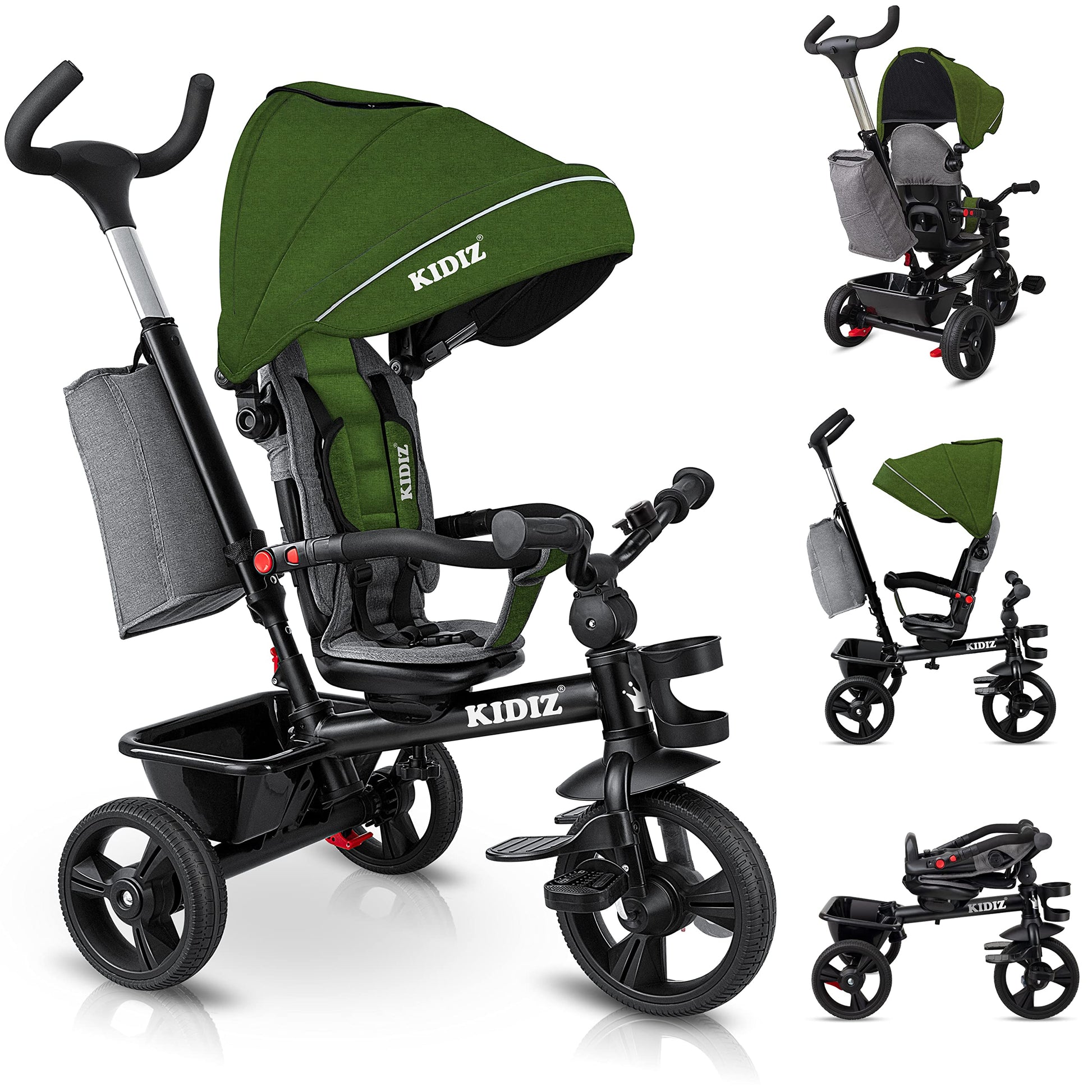 KIDIZ® 6in1 tricycle for kids with handlebar, suitable from 9 months up to 25kg. Jogger with forward & reverse drive, basket, bag, cup holder, sun canopy, rubber wheels. Foldable in khaki color.