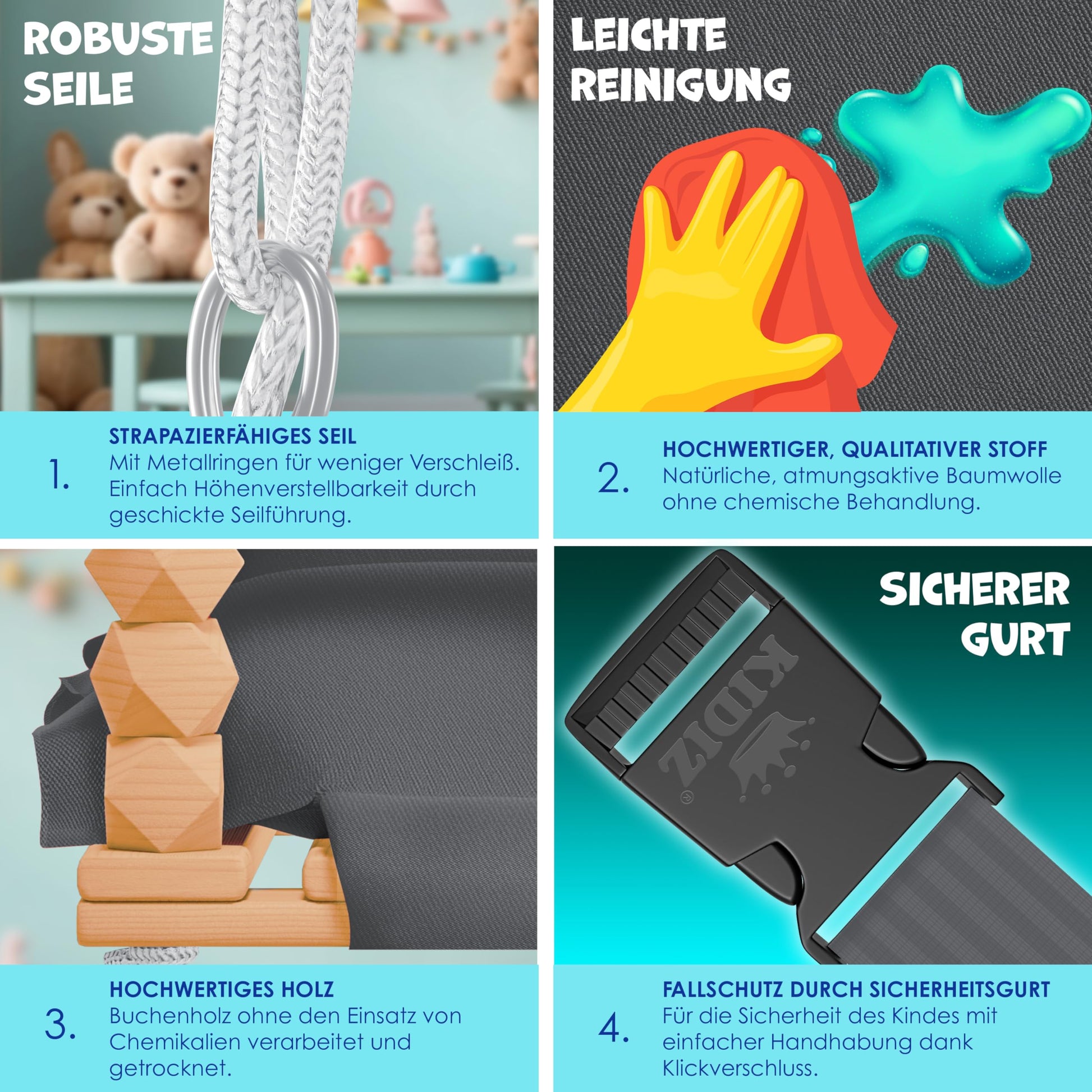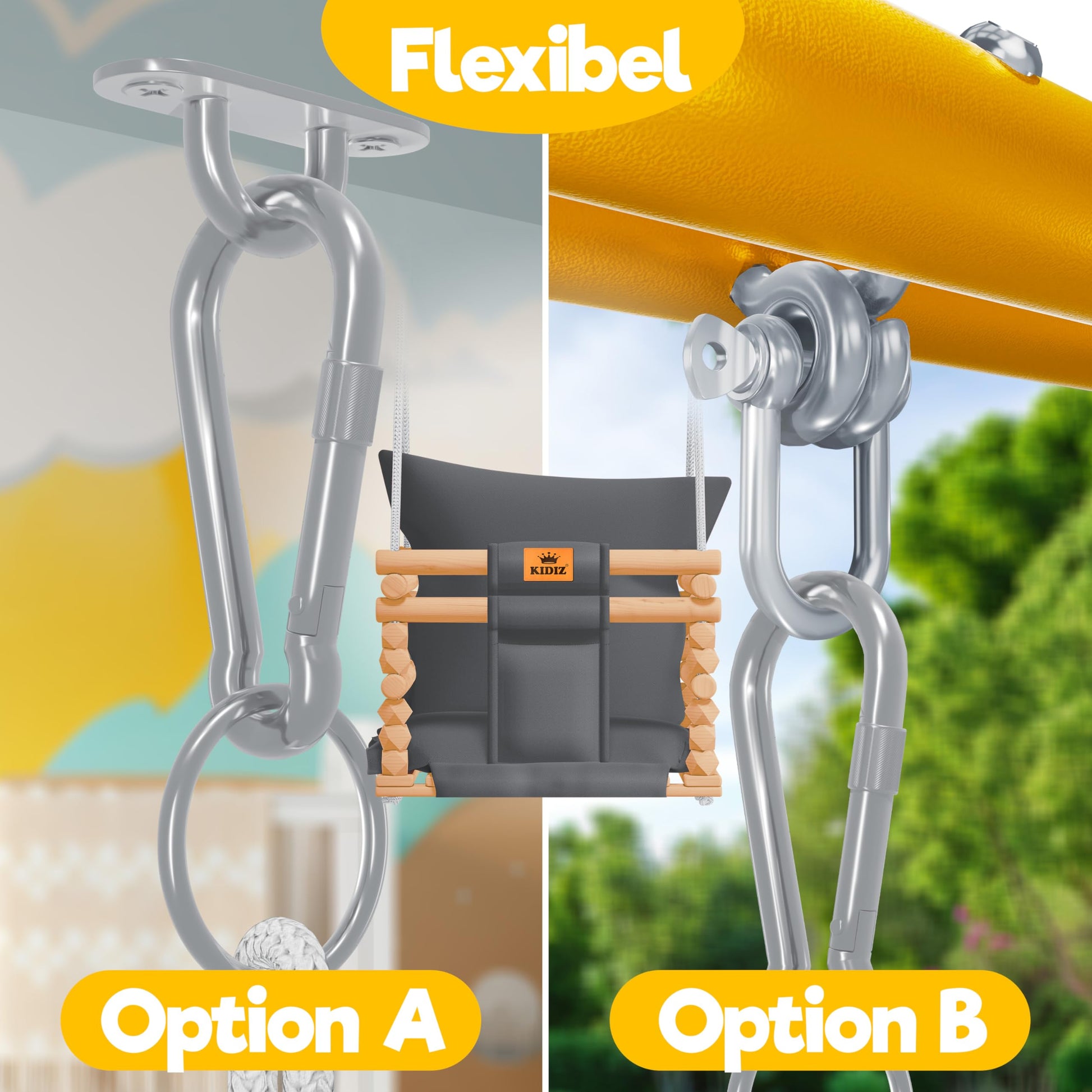 KIDIZ® Baby Swing Seat with Padding | Wooden Swing with Anti-Tip up to 60KG | Adjustable Height Indoors & Outdoors | 0.5-3 years | Mounting Accessories & Safety Belt Anthracite