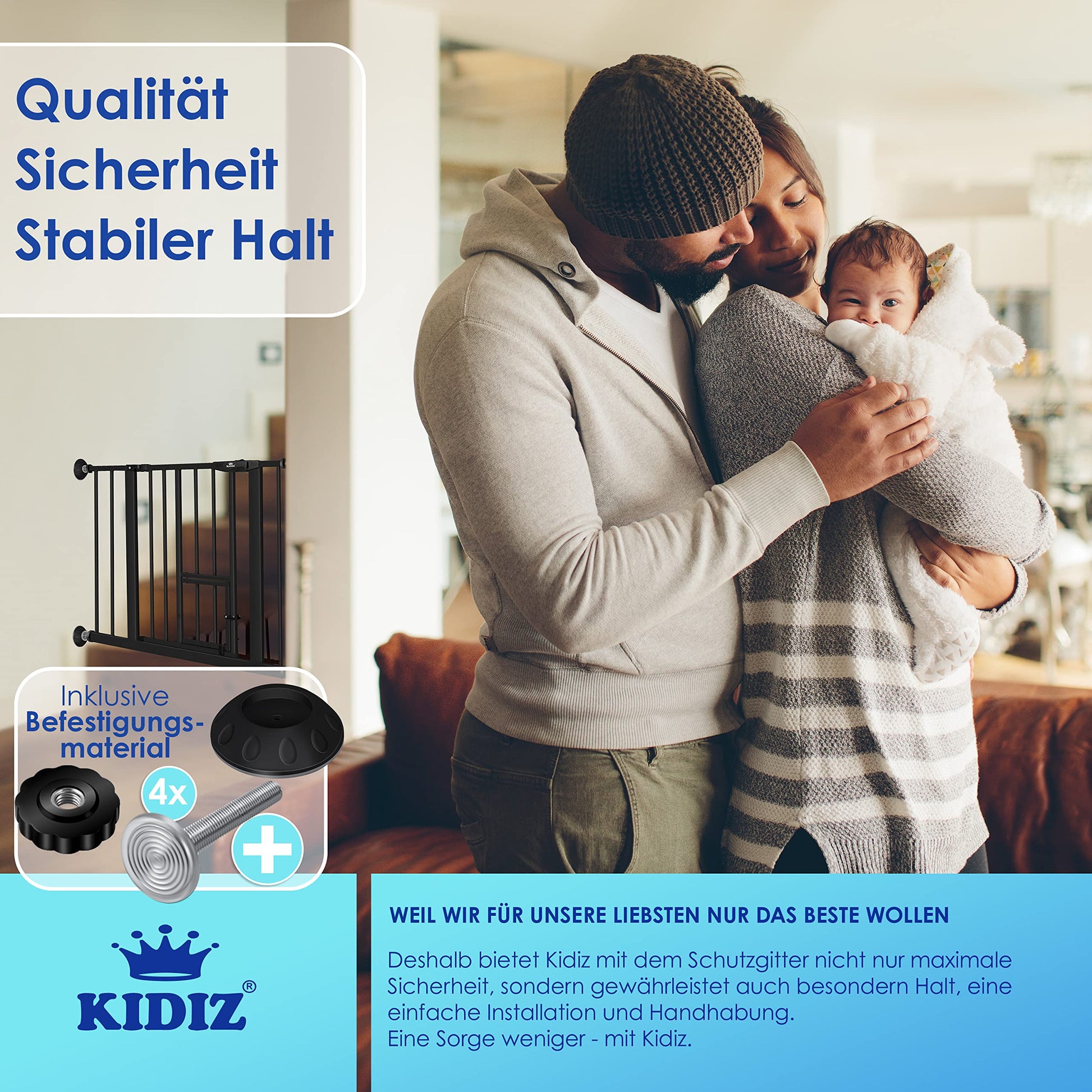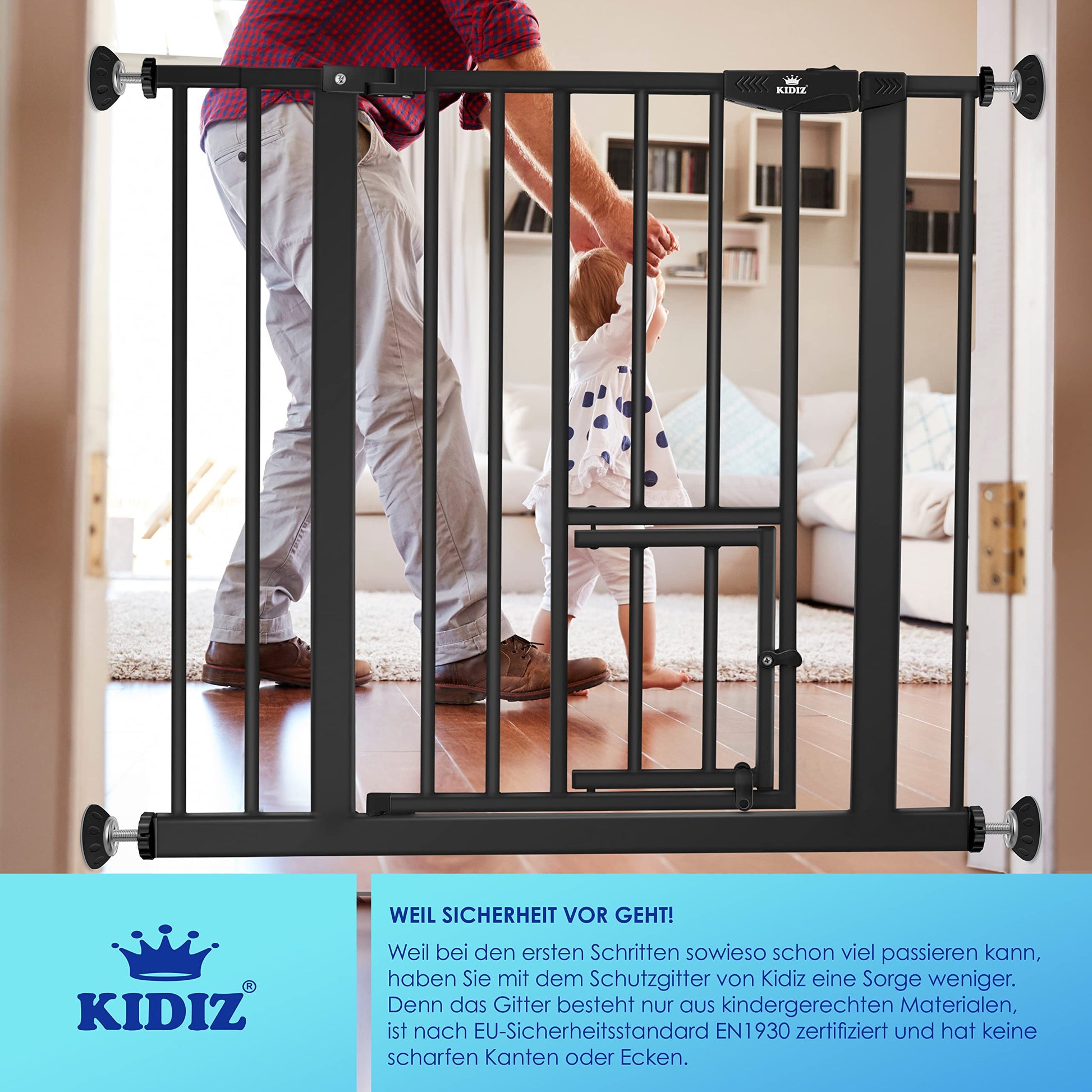 SAFETY GUARD: Kidiz brand stair gate provides necessary protection, blocking access to stairs for curious explorers. Childproof closure prevents passage while allowing easy access for adults."