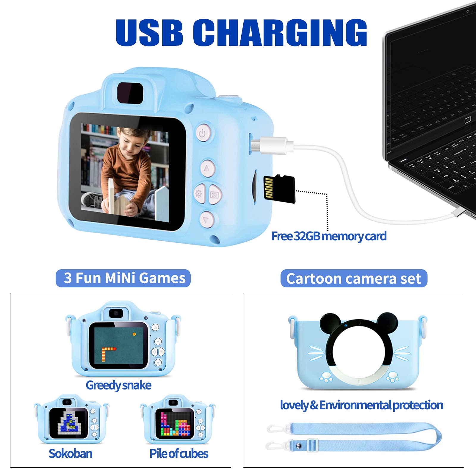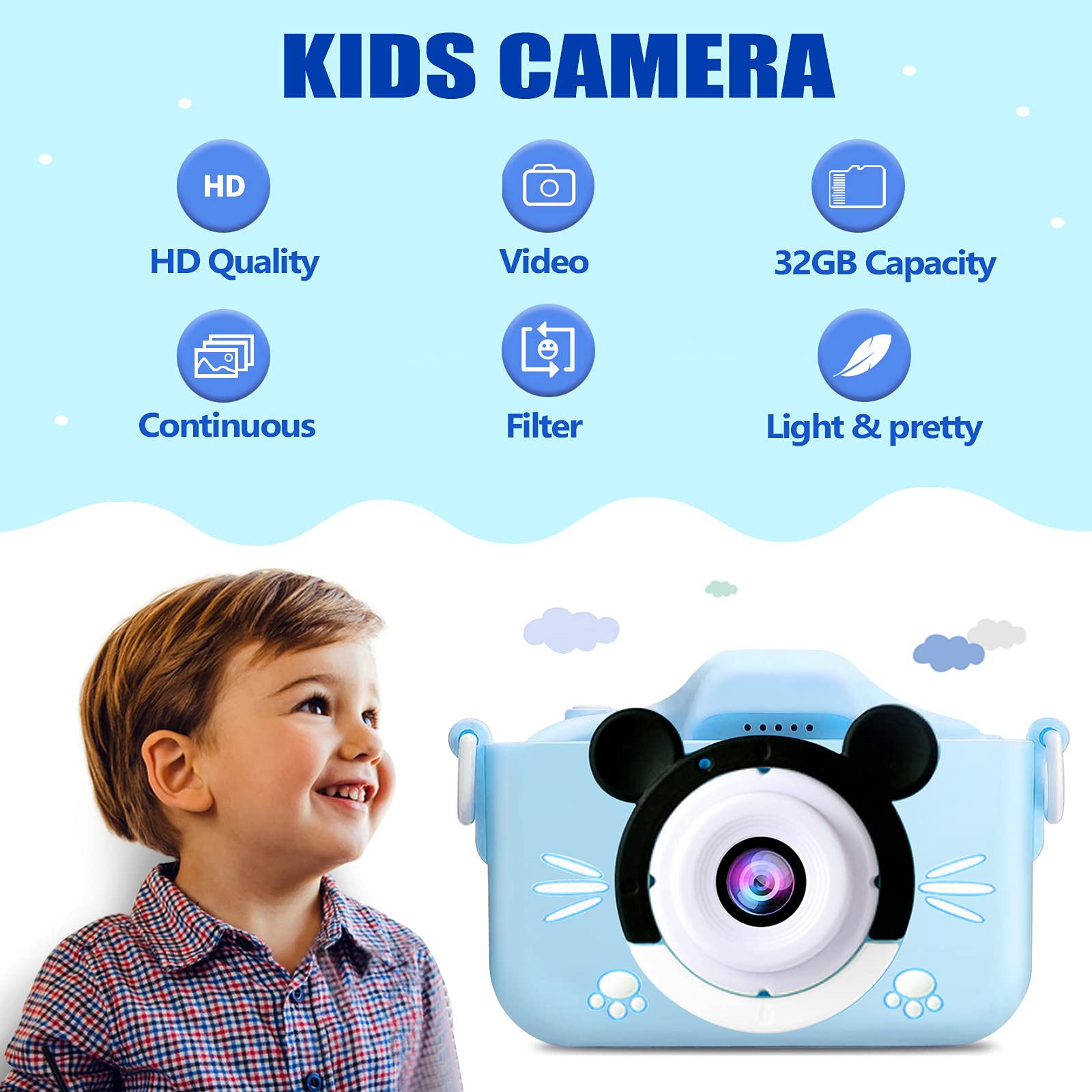 Kids camera, mini digital camera, rechargeable, camcorder, photo and video, gift for girls and boys ages 6+, with 32GB card/1080P HD/silicone protective case, shockproof (blue)