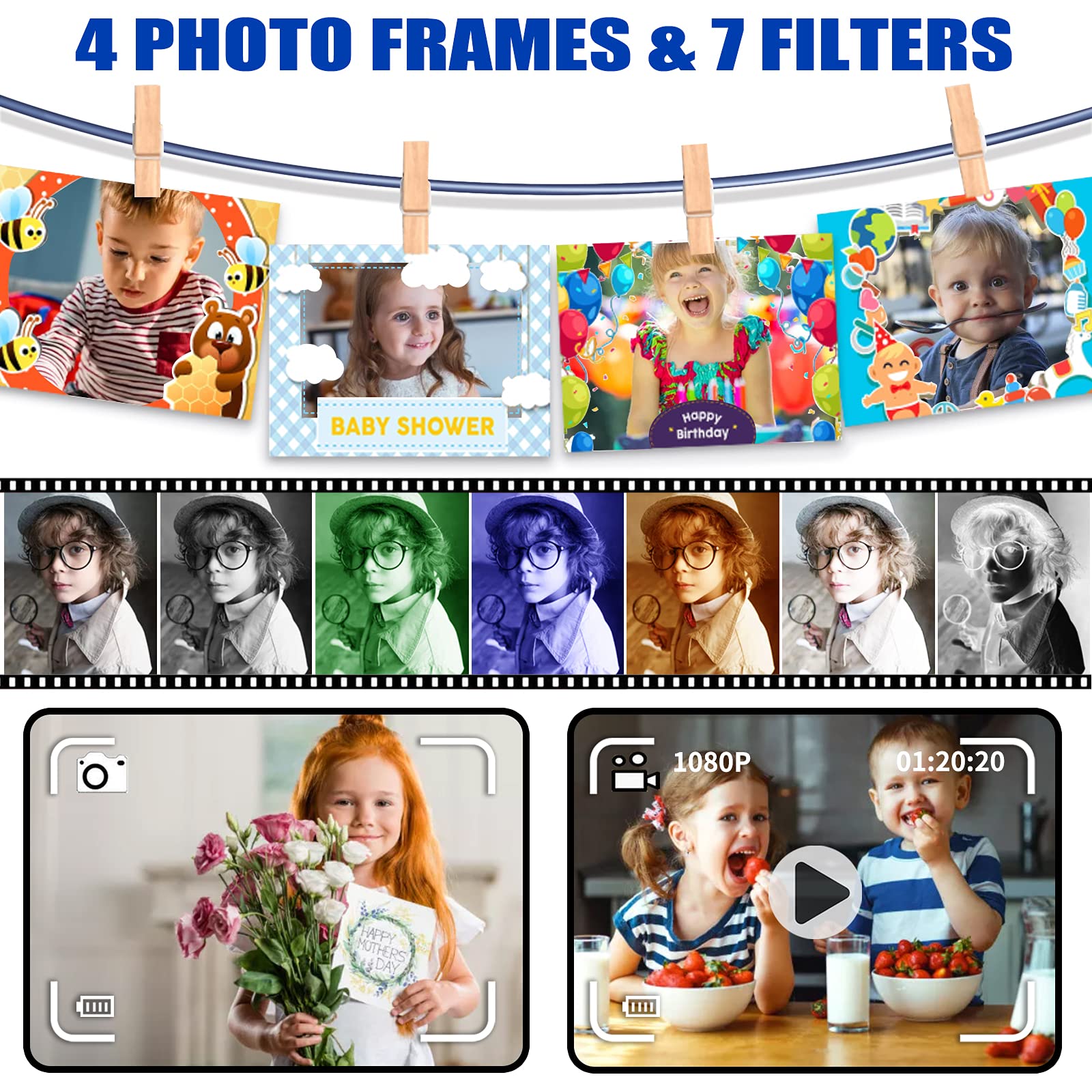 ["Multiple functions and easy to use: Comes with a 2-inch HD LCD display, 4x digital zoom, 4 fun frames, video resolution: 1920 x 1080; camera resolution 3264 x 2448. Supports up to 32G cards and can store over 10,000 photos.",
