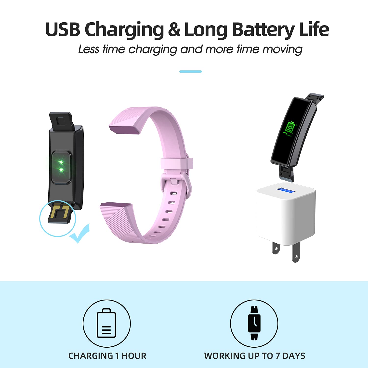 ["Easy to charge and long battery life"]You can charge the fitness tracker with any USB adapter without the need for an additional charging cable. The fitness tracker only needs 2 hours to fully charge and provides a battery life of 5-7 days. This means that kids can use it without worrying about constantly charging the tracker, spending less time charging and more time moving.