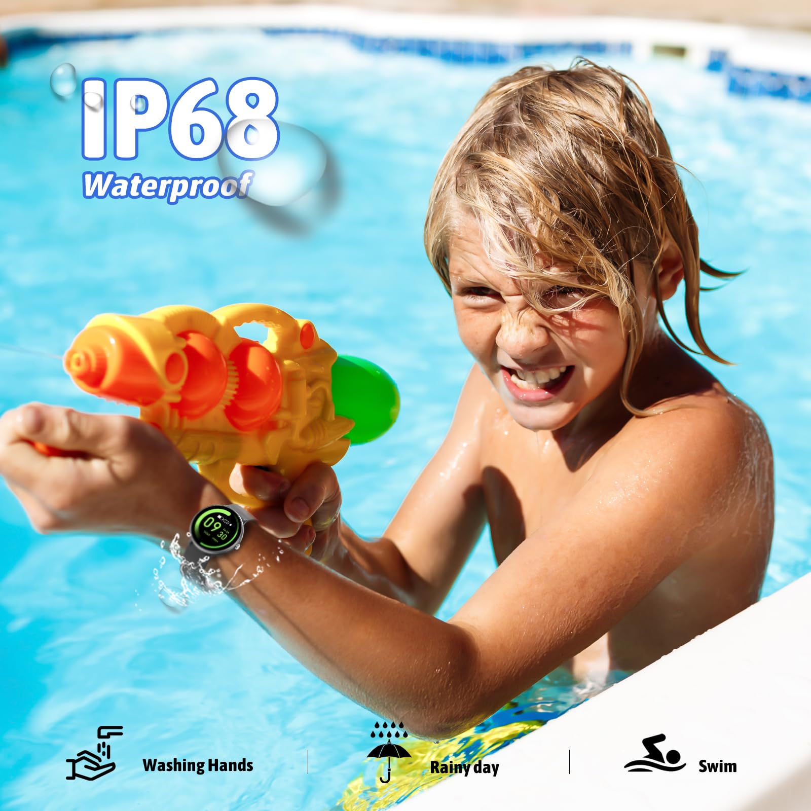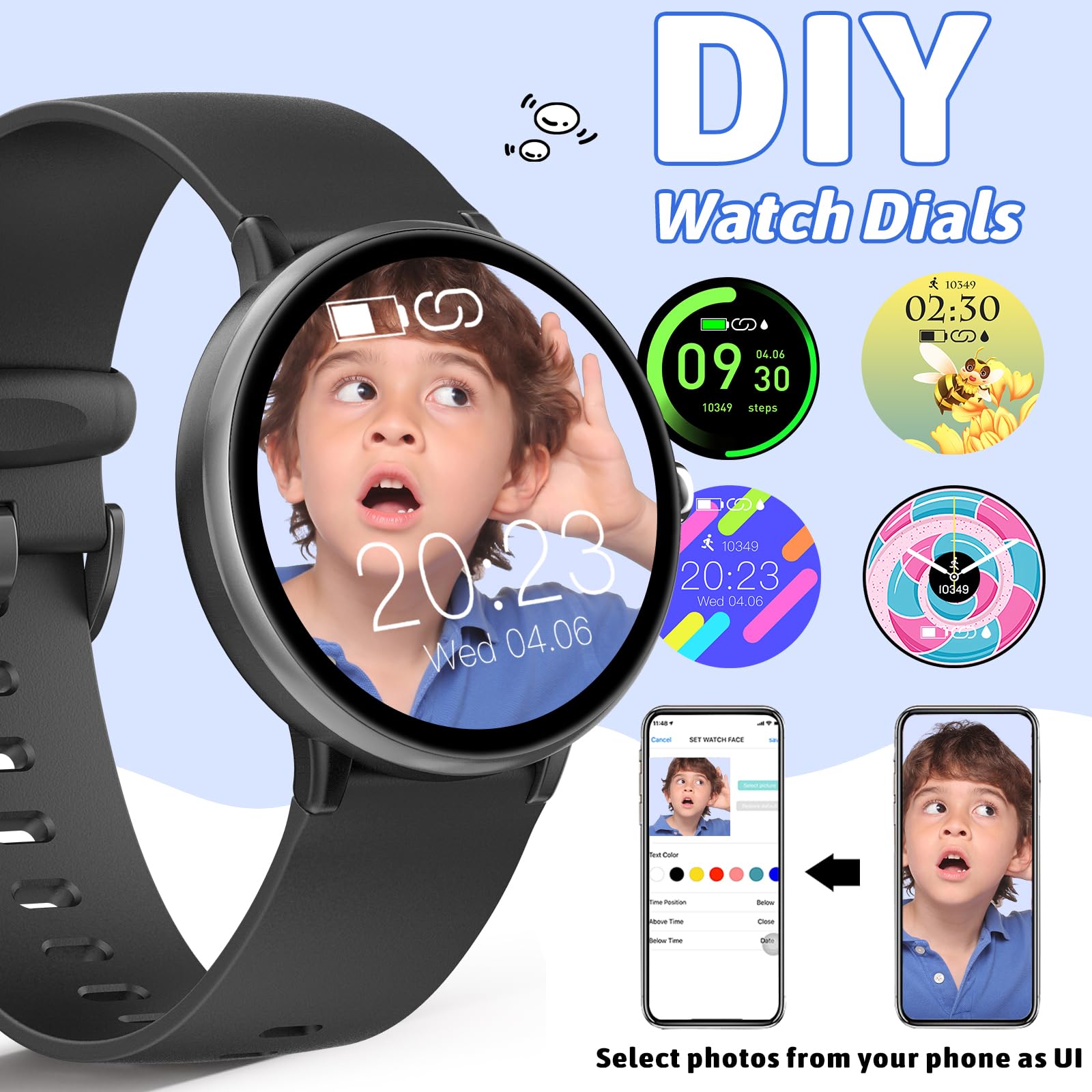 Round Touch HD Screen and Various Watch Faces: The kids smartwatch has a full touch HD color screen that can provide excellent image quality. Smartwatch compatible offers many watch faces to choose from, and you can also select your favorite photo as a watch face on the kids' watches.