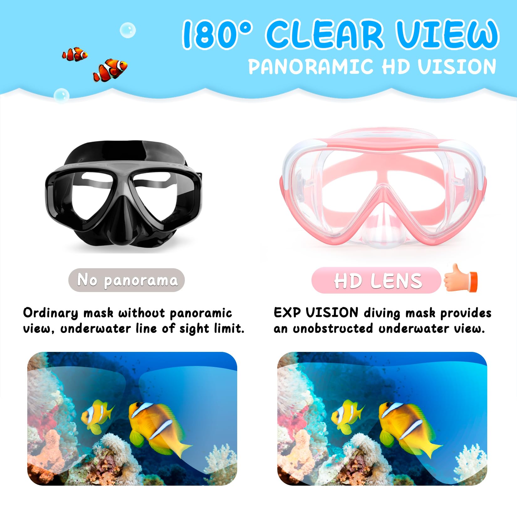 ["【180° Panoramic View】Our children's snorkel mask features ultra-clear, one-piece lenses that provide a crystal-clear view underwater. Without blurriness or distortion, your kids can fully enjoy the underwater world and have even more fun in the water.","【Professional Children's Swim Mask】This snorkel mask is specially designed for kids who love snorkeling or swimming. If your kids have been hesitant to put their heads underwater, this swim mask can help them swim like fish and build their confidence in the water. These children's swim goggles come in various color combinations so you can choose exactly what your kids want.","【Shatterproof PC Lens, Safe & Lightweight】No need to worry about broken lenses injuring your kids anymore. Our children's snorkel masks use reinforced polycarbonate lenses that offer excellent impact and fall resistance compared to tempered glass. Additionally, the PC lenses make the kids swim goggles lighter and more comfortable for children than tempered glass lenses. Say goodbye to unpleasant swimming experiences and welcome carefree fun!","【Anti-Fog and UV Protection】The inside of the premium lenses is treated with the latest anti-fog technology to prevent the children's swim mask from fogging up. Furthermore, the outer surface of the lenses with UV protection layer allows the lenses to reflect the dazzling sunlight and protect your kids' delicate eyes from harmful UV rays.","【Soft Nose Protection】EXP VISION children's swim goggles come with a nose protection feature. The soft silicone nose ensures a watertight seal on the face while snorkeling, swimming, or diving. This feature is particularly helpful for kids who are just learning to swim and do not yet know how to breathe through their nose underwater. This children's snorkel mask is perfect for swimming, snorkeling, and free diving activities.","【No Leaking, Soft Silicone Rubber】The soft, liquid silicone edge of these children's snorkel dive masks fits perfectly on kids' faces without gaps, preventing water from leaking while diving, snorkeling, or swimming. Moreover, the widened design of the children's swim mask reduces pressure on the face and prevents the mask from leaving red marks.","【Easily Adjustable Head Strap】The side button buckle is very easy for kids to adjust and keeps the strap securely in place without slipping off in the water. This children's swim goggles are suitable for boys, girls, and petite adults aged 4 to 15 years old. The large silicone edges prevent hair pulling when wearing the goggles.","【Adjustable Headband Suitable for Adults and Teens】: This snorkel set with adjustable headband is suitable for both adults and teens, making it an excellent choice for families who want to explore the underwater world together. It is also a great gift for water sports enthusiasts who enjoy snorkeling, diving, swimming, and exploring the underwater world."]