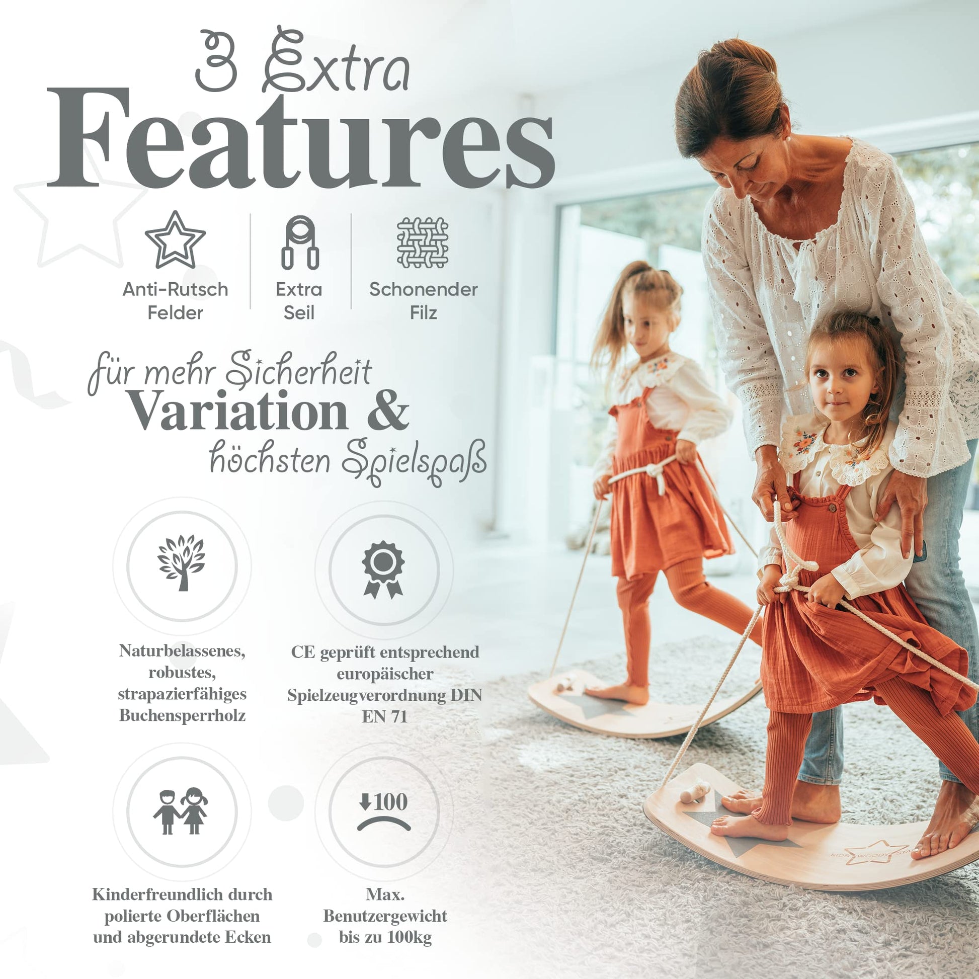 ✔️EXTRA ANTI-SLIP FOOTPADS for the feet provide a safer Stand on the Balance Board. Star stickers can be customised on the optional Fußposierung.
