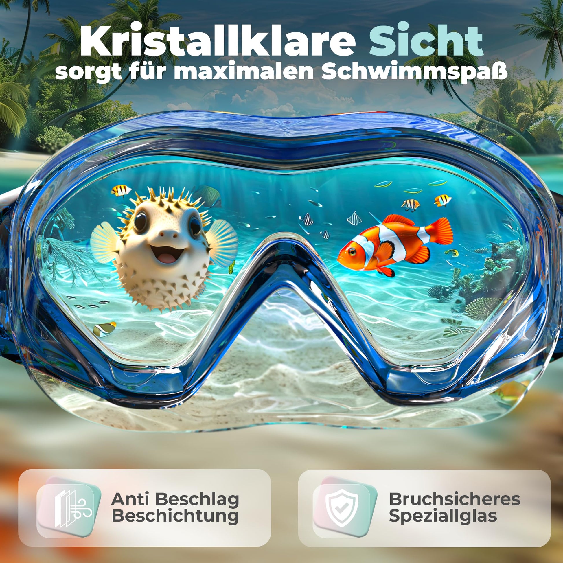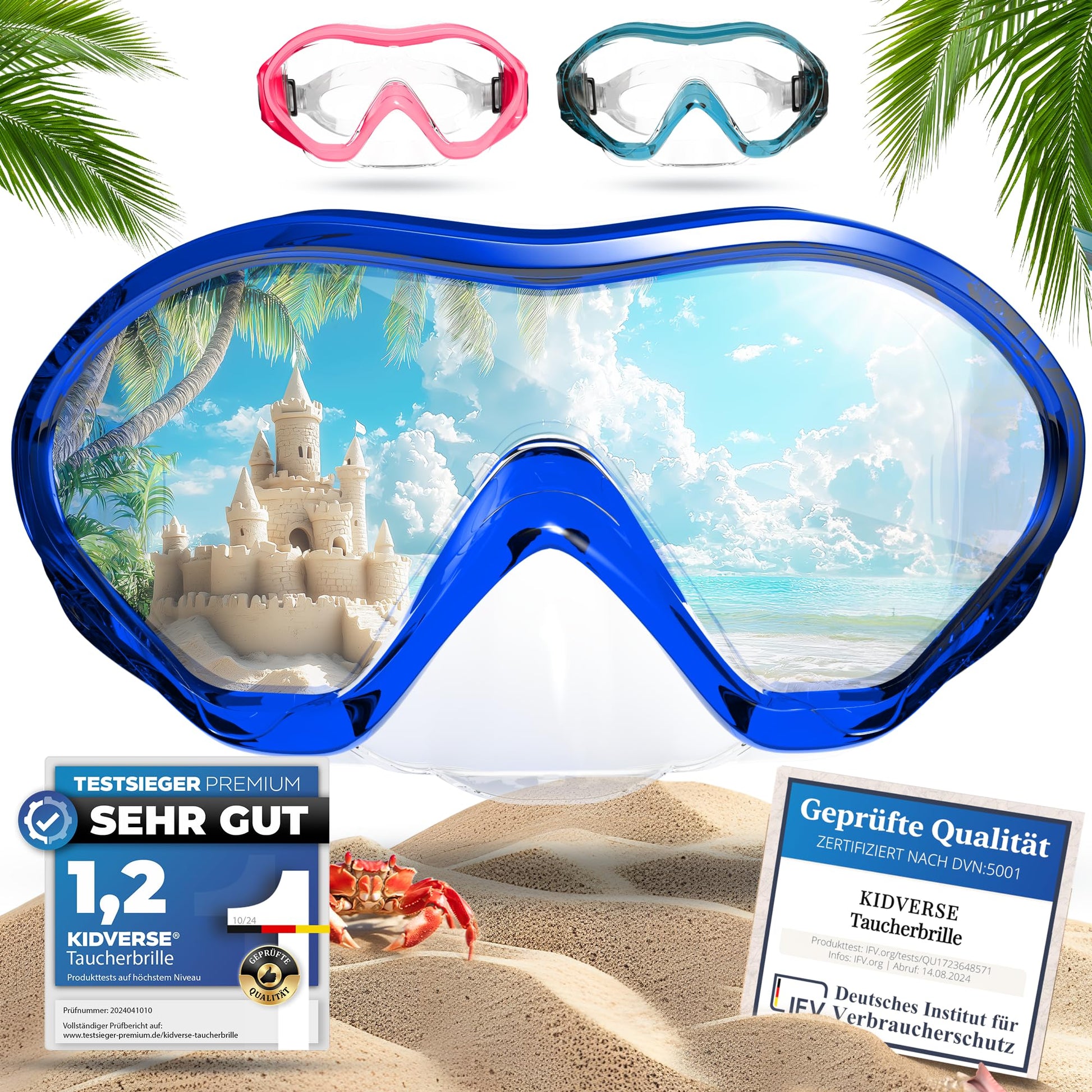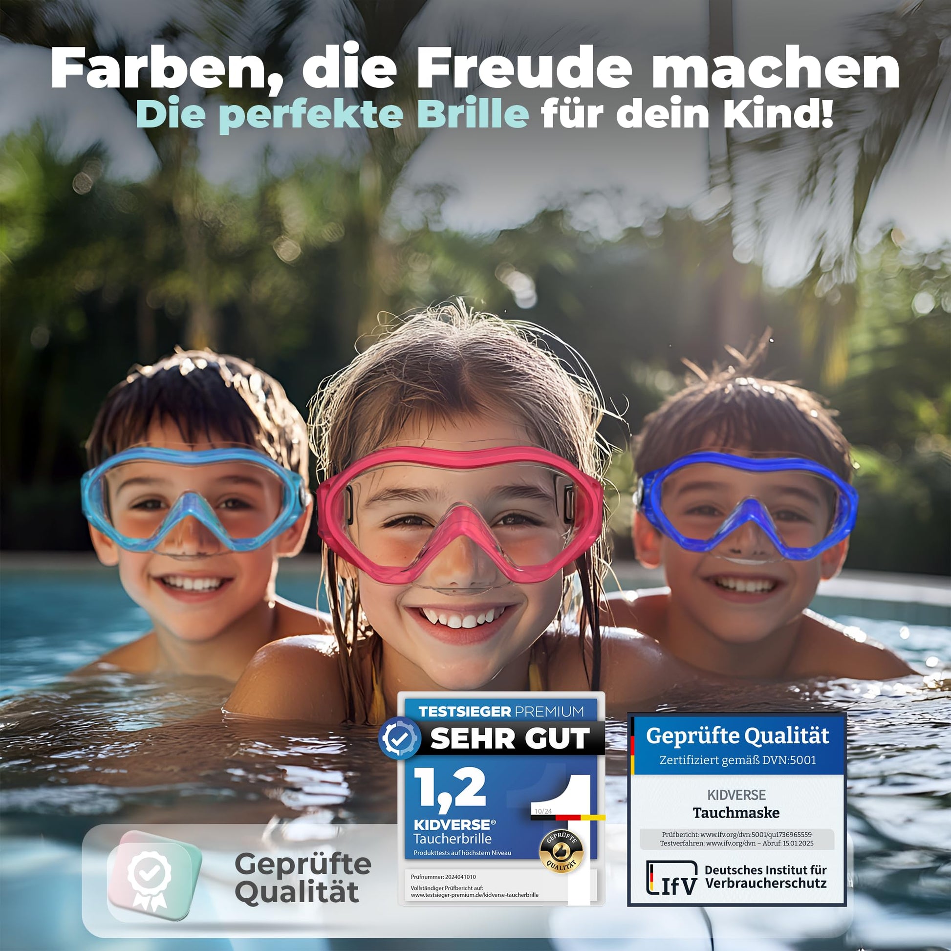 ["MAXIMAL COMFORT FIT - The skin-friendly Kidverse kids diving mask perfectly adapts to your child's face shape, ensuring a comfortable fit without pressure points. Nothing stands in the way of diving fun!","100% WATERPROOF GOGGLES - Thanks to the precise sealing of the swim goggles with nose protection, no water drops into your child's nose and eyes. Perfect for unrestricted underwater visibility.","TESTED SAFETY - The Kidverse kids diving mask is tested under strict guidelines. The diving mask provides reliable protection for your child's sensitive eyes.","EASY TO ADJUST - The flexible headband of the kids diving mask can be easily adjusted and grows with your child. This ensures a secure and comfortable fit, whether in swimming lessons, at the beach, or in the pool. Perfect for vacation & leisure activities.","NO FOGGING - Thanks to the special anti-fog coating of our swim goggles with nose, the view always remains clear and unobstructed. No more annoying removal and cleaning of the swim & dive mask while diving."]