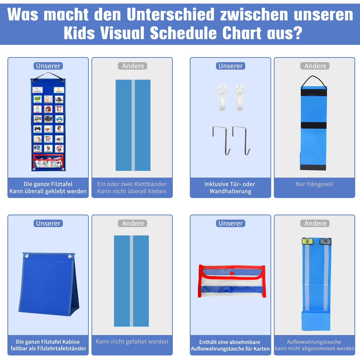 ["Children Visual Schedule Calendar Chart 2-in-1 Autism Daily Work Routine Chart with 70 Cards Autism Learning Materials Children Visual Behavior Tool Wall Planner for Home School.","2-in-1 Felt Board (Difference from others): This means it has two ways to use. It can be hung on the wall or other places as a visual schedule chart for children, or it can be used as a felt board for lessons.","Easy to attract children's attention: 70 pieces of visual schedule cards are printed with different patterns related to daily school, home, and behaviors, reflecting many actions in our lives and enriching your schedules. The bright colors and charming designs can spark children's interest. These cards cover all aspects of life. Children can place completed tasks in the pocket, often relying on the vision.","Easy to use and store all cards: The visual behavior schedule comes with a suitable PVC bag for storing all cards. And the autism daily task chart for children has 4 eyelets at the top and bottom, making it easy to hang sideways or vertically. Or it can be placed on the table.","Perfect learning tool: The visual plank calendar for children is also printed with words, so you can teach your children to know words and objects, to better understand their daily behaviors. Moreover, they are ideal communication tools for autism children. These routine cards for toddlers are useful teaching aids for teachers to use in the classroom. They can also be used at home, so parents can help children."]