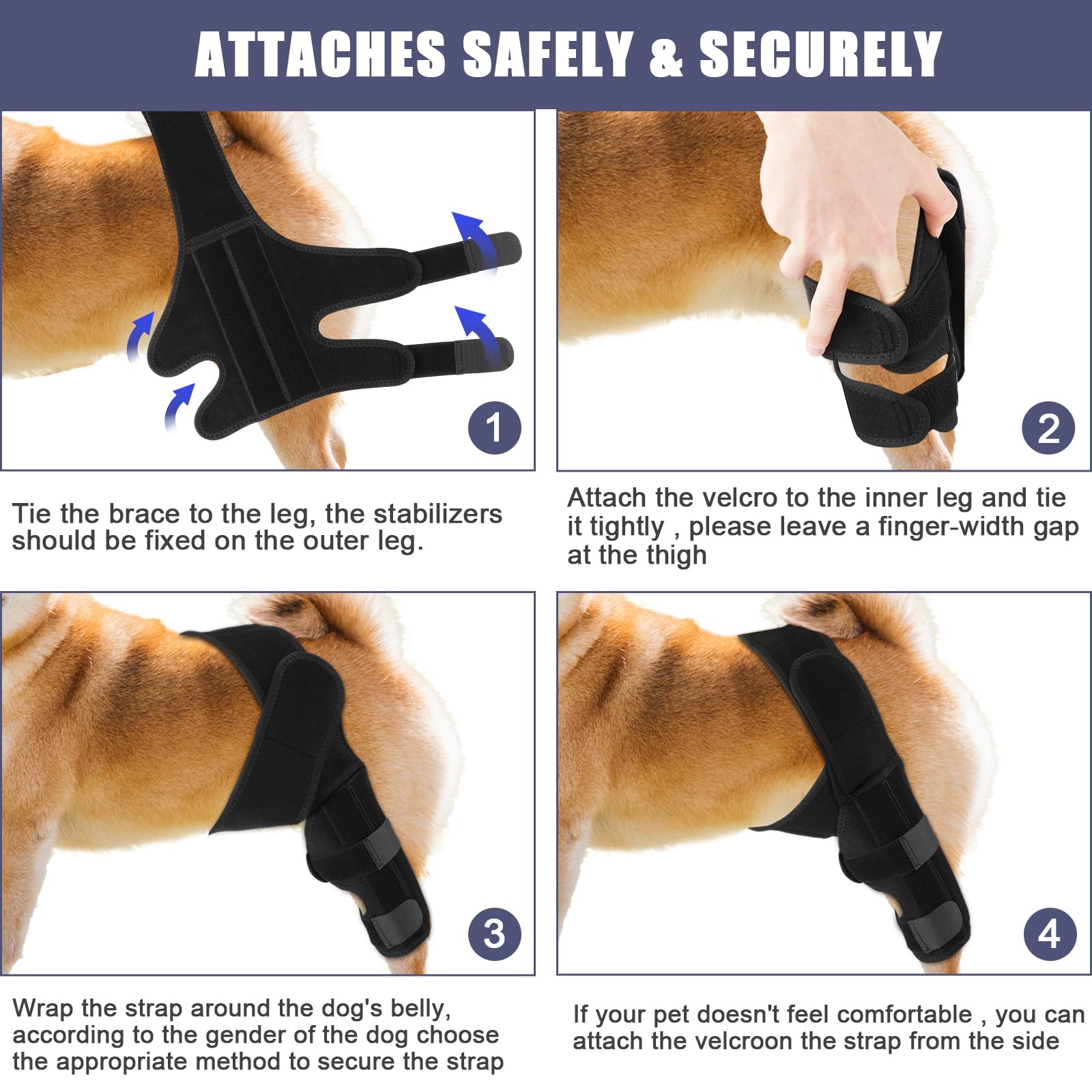 ["Product Content: You will receive 1 piece of dog knee brace to meet your dog's daily needs.","Premium Material: Our dog knee brace is made of breathable neoprene with high elasticity, soft and comfortable to wear. (Please refer to the appropriate purchase size.)","Easy to Use: The dog brace is easy to put on and take off. Just wrap the knee brace around the knee area, then adjust the straps to fit your dog and securely in place. Please be patient as your dog gets used to the dog ACL brace.","Pain Relief: Our dog rear leg brace can alleviate pain associated with ligament injuries, patella problems. It can prevent dogs from licking wounds, prevent wound infections, and help wounds heal.","Wide Application: The dog knee brace can help relieve pain caused by CCL/ACL cruciate ligament injury, patella injury, dog lameness by increasing joint temperature and circulation, suitable for dogs who have just completed leg surgery."]