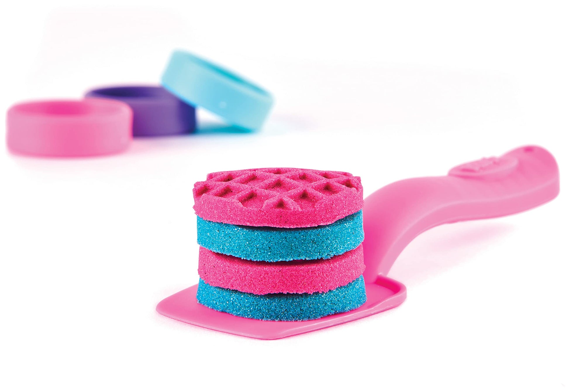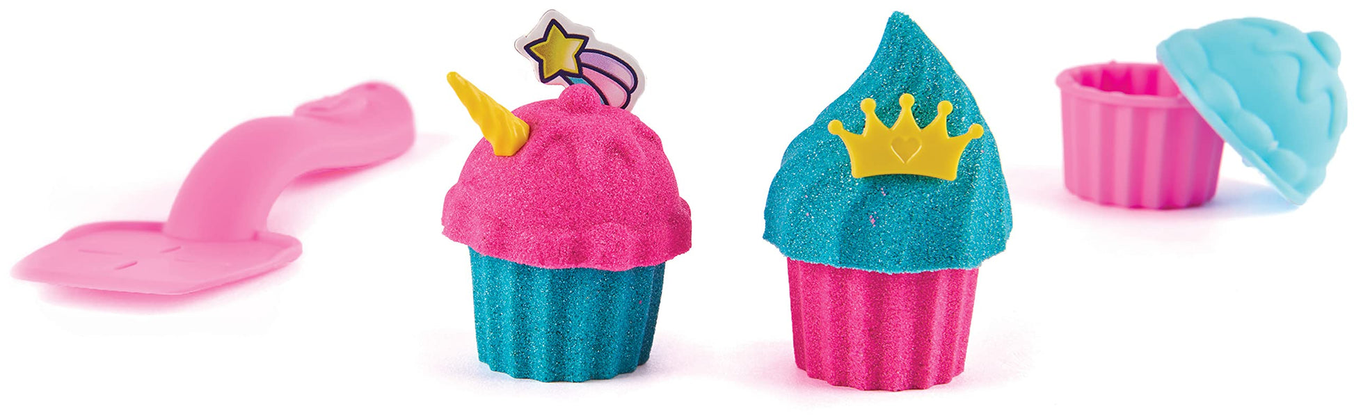 "Whether cupcakes, cookies, or pastries, the most beautiful baked art works are created from Kinetic Sand in two colors with the help of six molds and numerous decorations. The shimmering turquoise sand contrasts with the neon pink sand. Kinetic Sand, made up of 98% real sand from Sweden and 2% magic, sticks to itself, flows magically through the hands, and can be wonderfully shaped. Molds are depicted razor-sharp in Kinetic Sand. Thanks to the diverse accessories, the most beautiful pastries with whipped cream, differently patterned sand cookies that can also be creatively stacked, can be created in no time. Then decorate and serve with the lifter. Due to the granular sand texture, not only fine motor skills are promoted while kneading and shaping, but also the development of the sense of touch. The bright and shimmering sand colors inspire the imagination for ever new baked art works. Since Kinetic Sand does not dry out, it is always ready for use. Contents: 1 lb Kinetic Sand in 2 colors, 3 cupcake molds, 3 cookie cutters, 1 rolling pin, 1 lifter, decorative elements. The Kinetic Sand Unicorn Baking Set is the ideal gift for children aged 3 and up who enjoy kneading, playing in the sandbox, and love role-playing. Playing with Kinetic Sand is both imaginative and relaxing at the same time, and is an uncomplicated activity for in-between.
