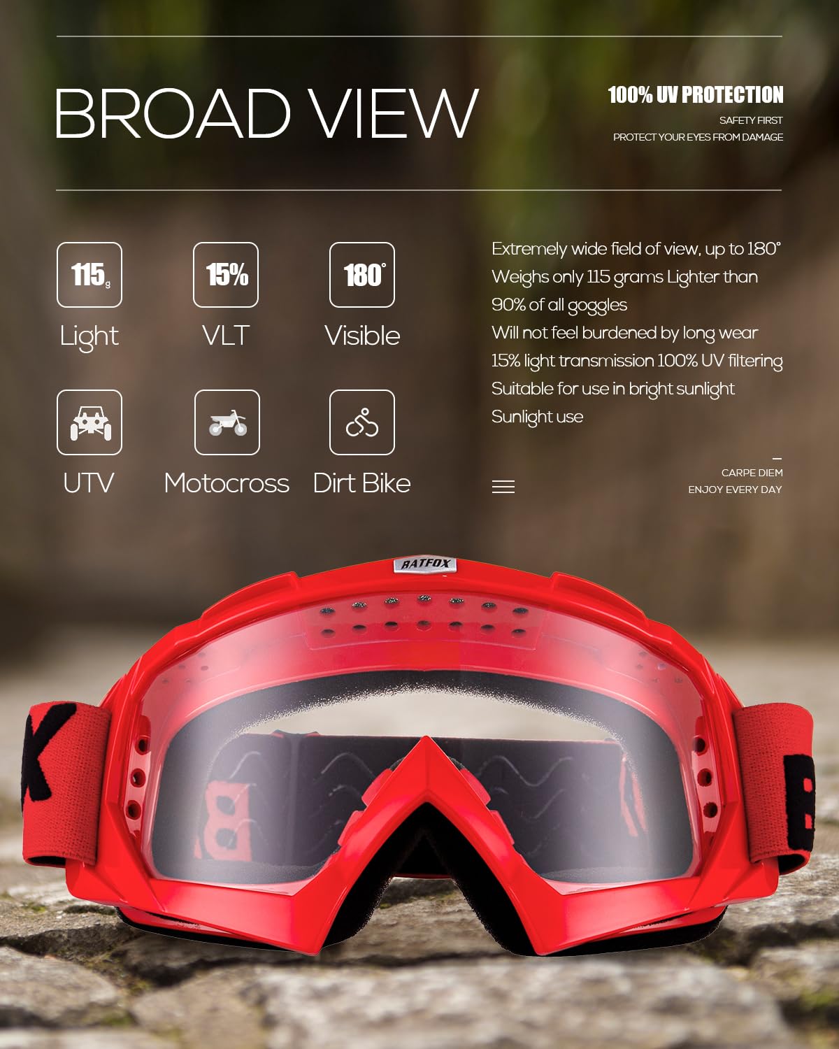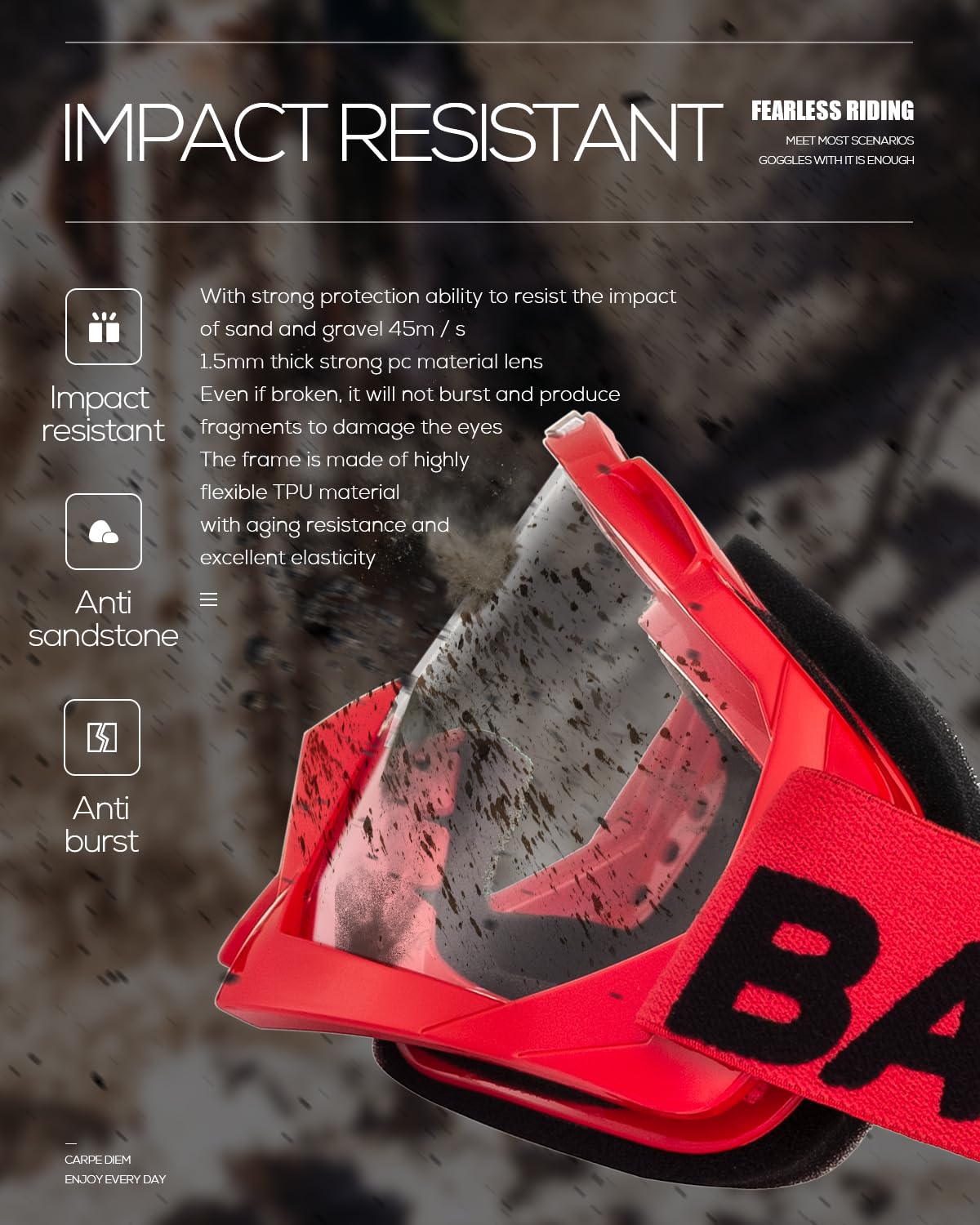 "Durable and safe design: Our Dirt Bike Goggles feature a non-slip silicone strap that keeps the goggles securely in place during rides. The improved PC lenses and ABS frame make these goggles impact-resistant and ensure maximum protection against wind, dust, dirt, rain, snow, sunlight, and UV rays.