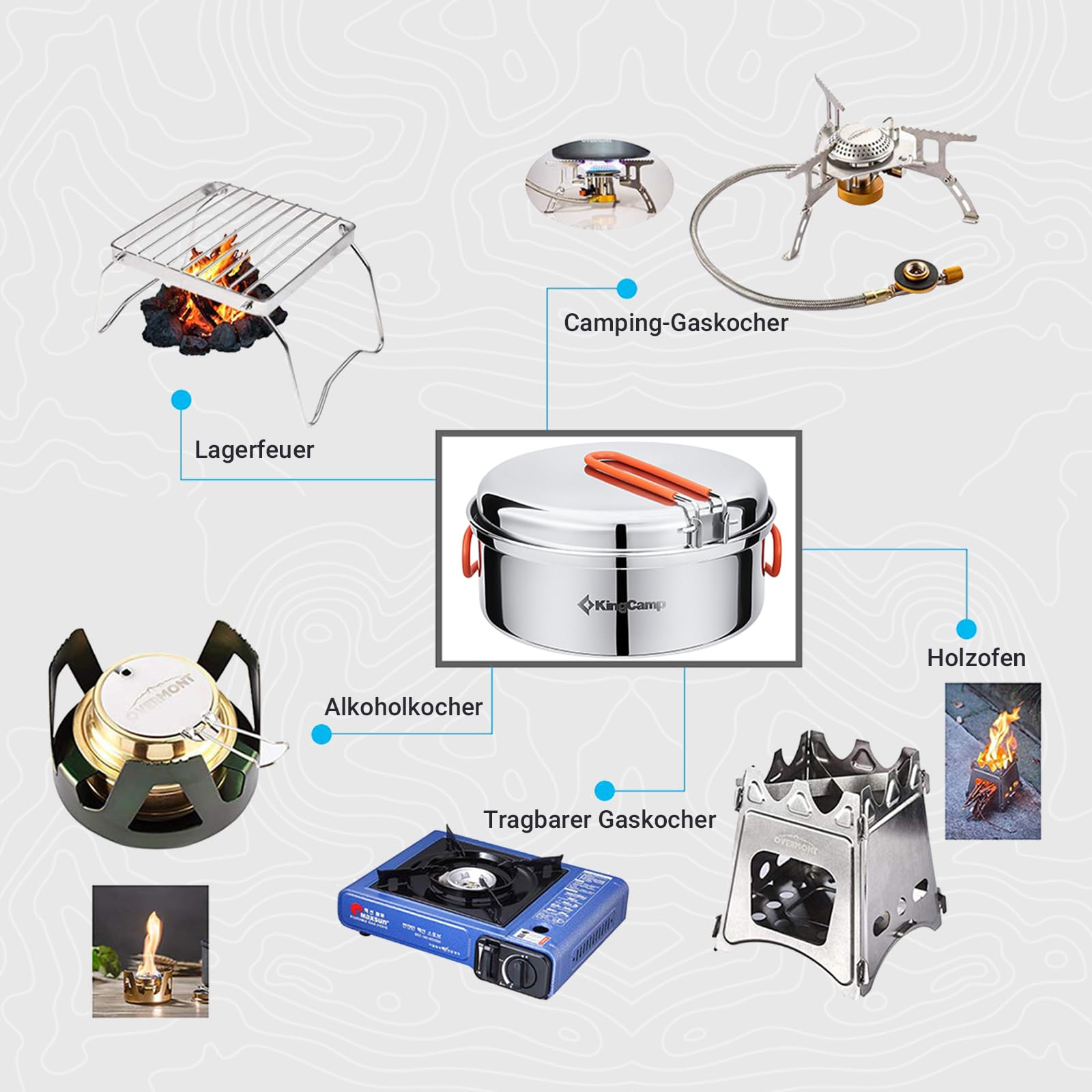 "Applications: Survival, Camping, Trekking, Hiking, Picnicking, Festivals, Caravans, RVs, or backyard BBQs. Ideal outdoor cookware set for cooking meals, no matter where and on any heating device."]
